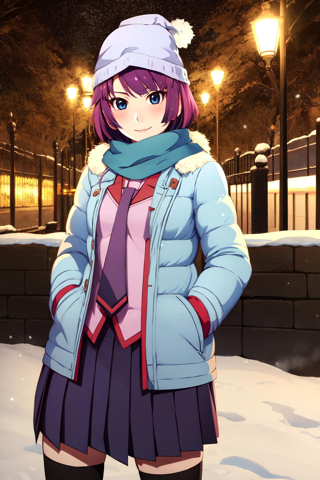hitagisenjougahara, short hair, medium breasts, beanie, school uniform, necktie, scarf, blue scarf, coat, winter clothes, naoetsu high school uniform, skirt, pleated skirt, black thighhighs, zettai ryouikiBlack dress: