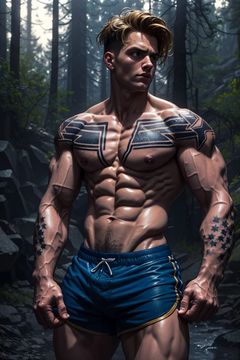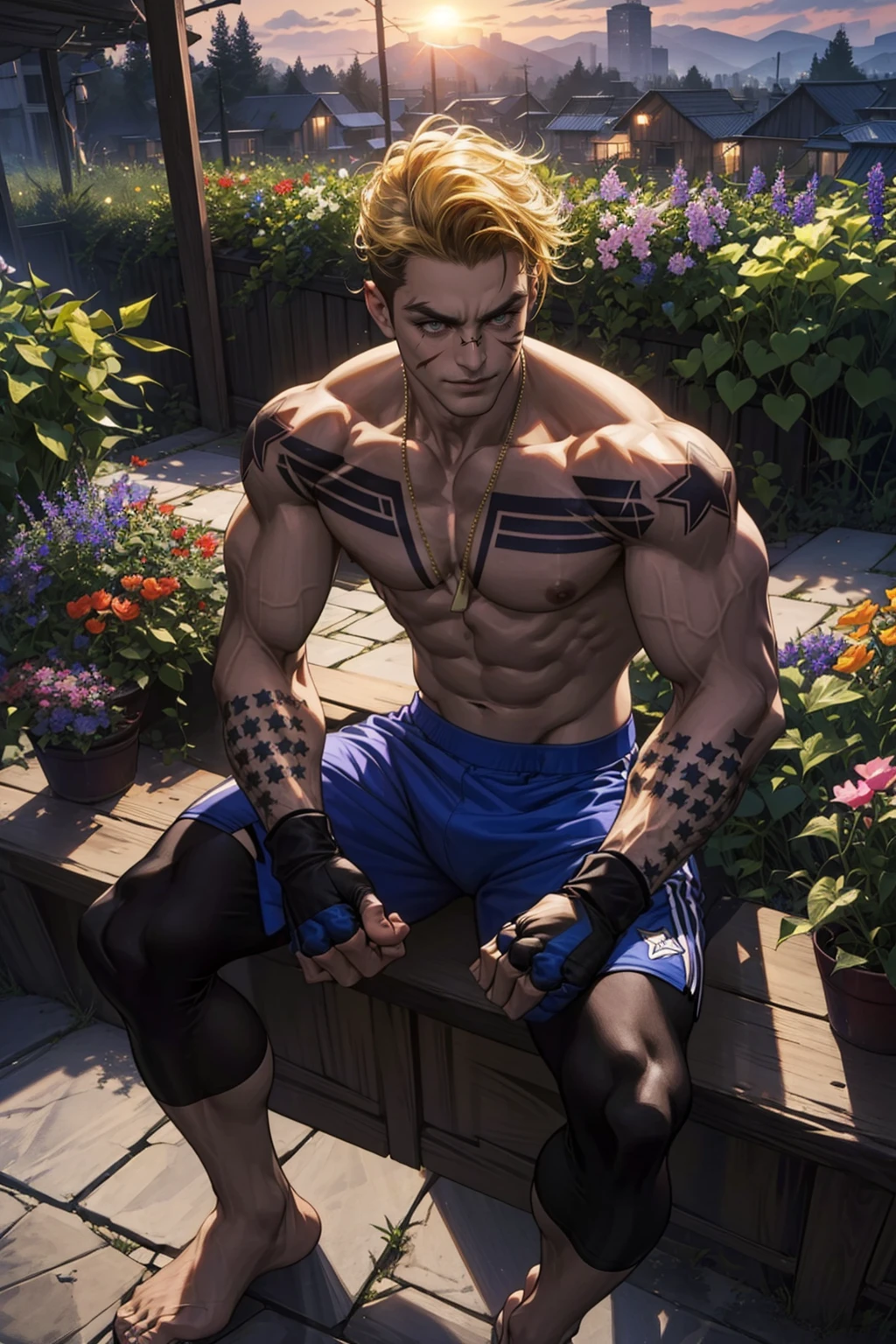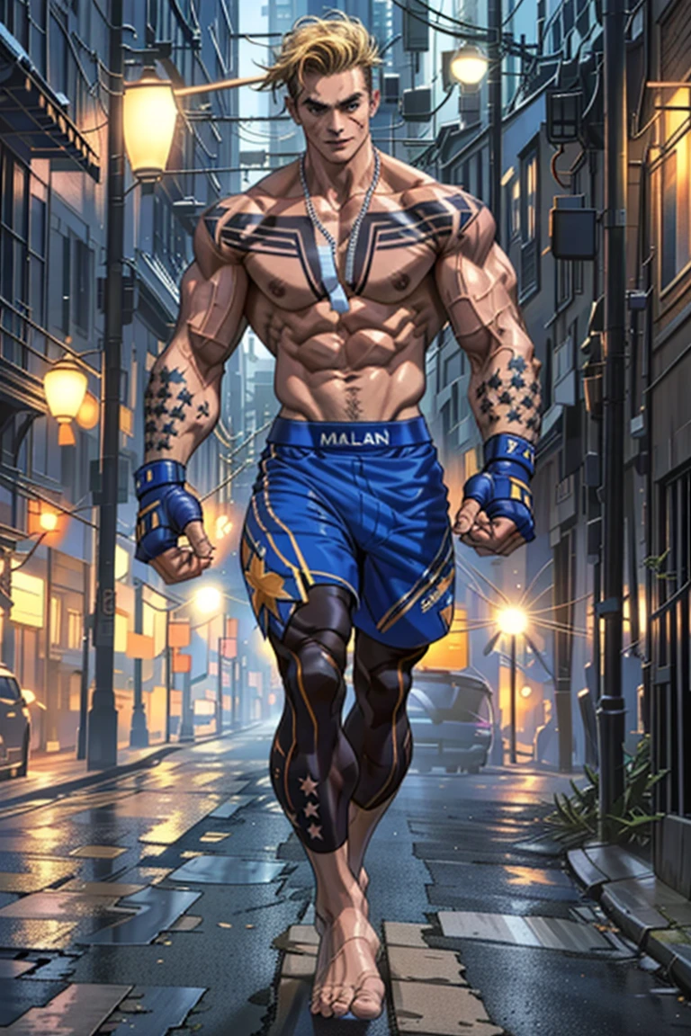 also: bandaid on nose, face scar, necklace, tattoo, star tattoos, fighting gloves, boxing shorts, leggings,