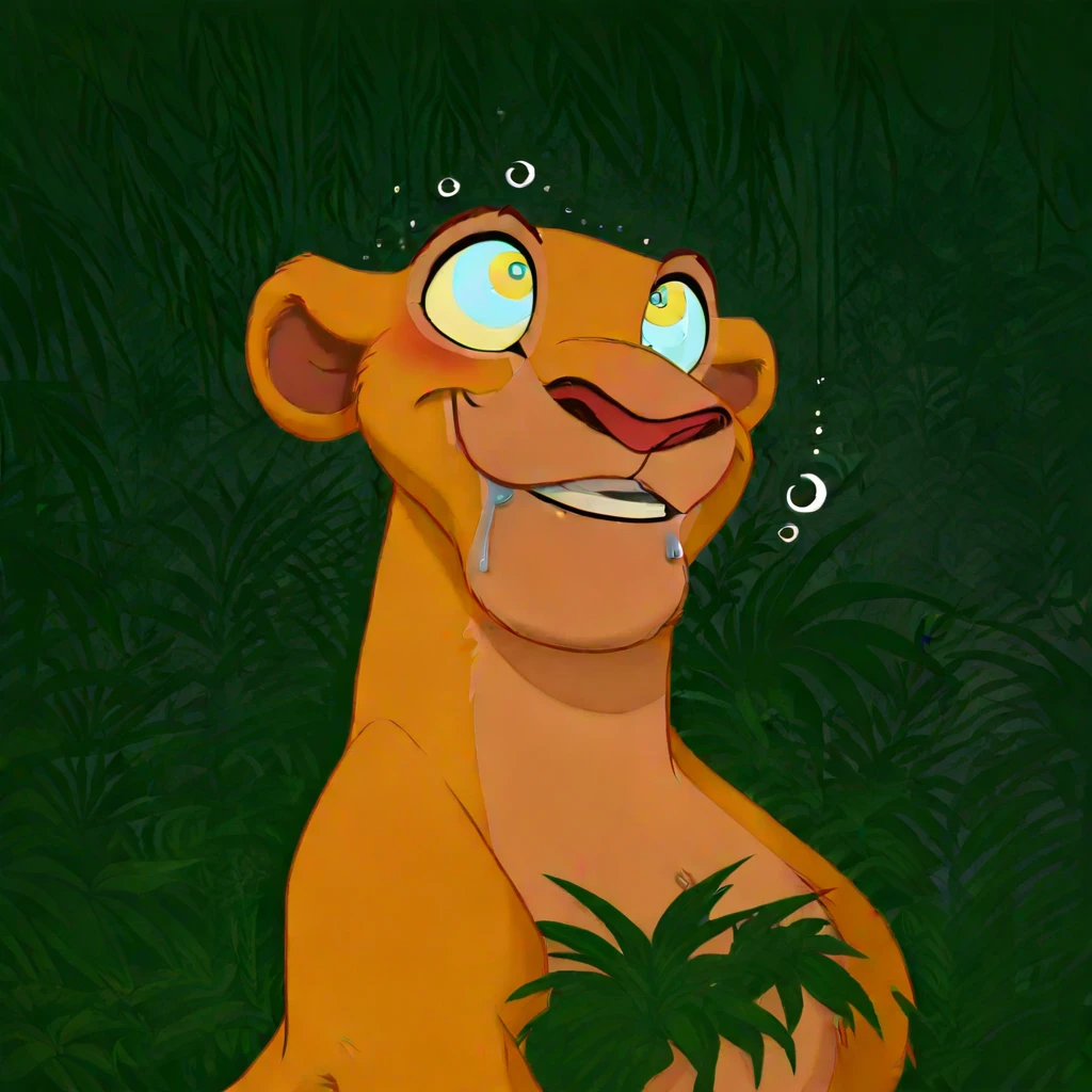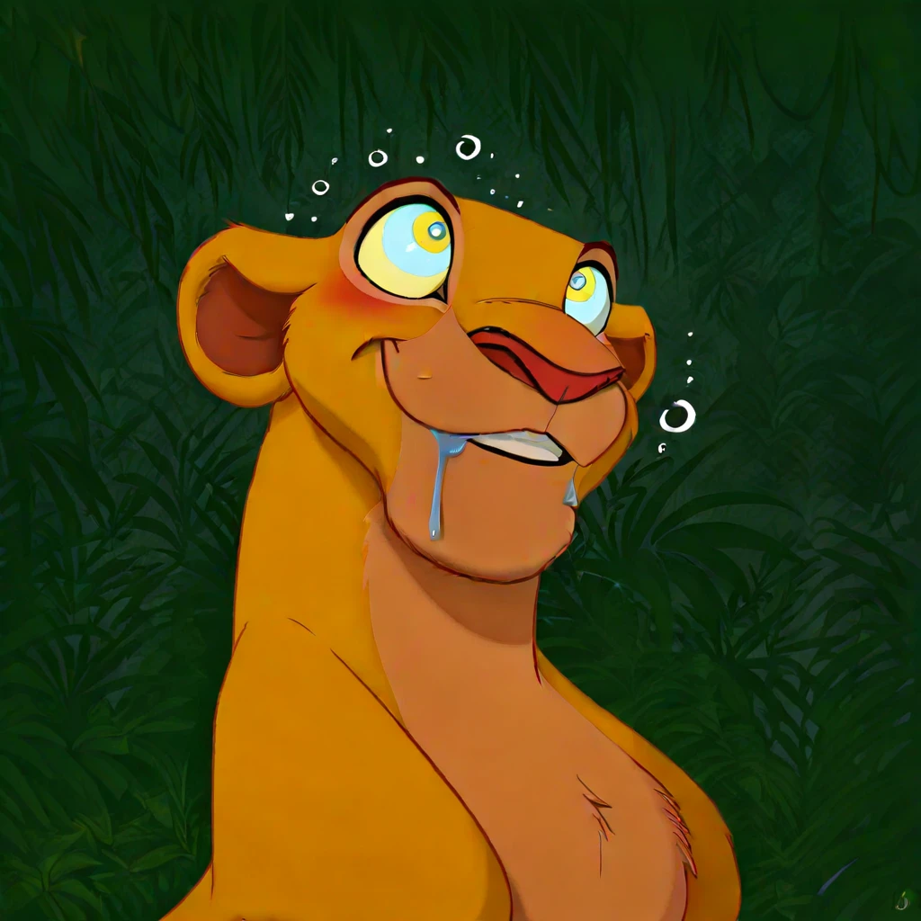 nala, lioness feral, the lion king, hypnotized eyes, hypnotized kaa eyes style, dized, goofy smile, dized bubbles.
