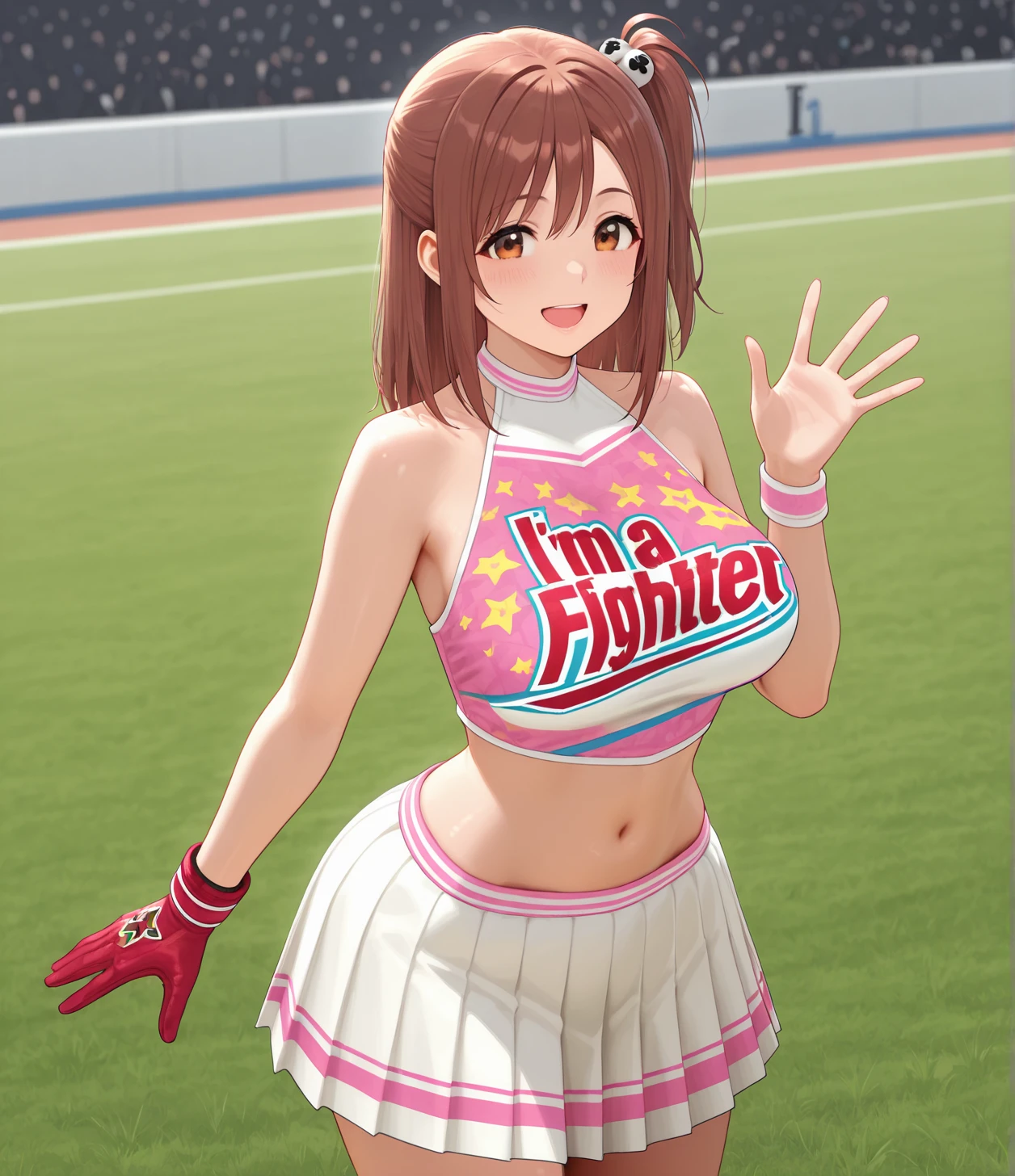 cheer-honoka,brown hair,one side up.hair ornament,brown eyes,cheerleader,pink crop top,midriff,navel,white skirt,pleated skirt,sneaker,leg warmers,clothes writing,I'ma,Fighter,wristband,single glove,,