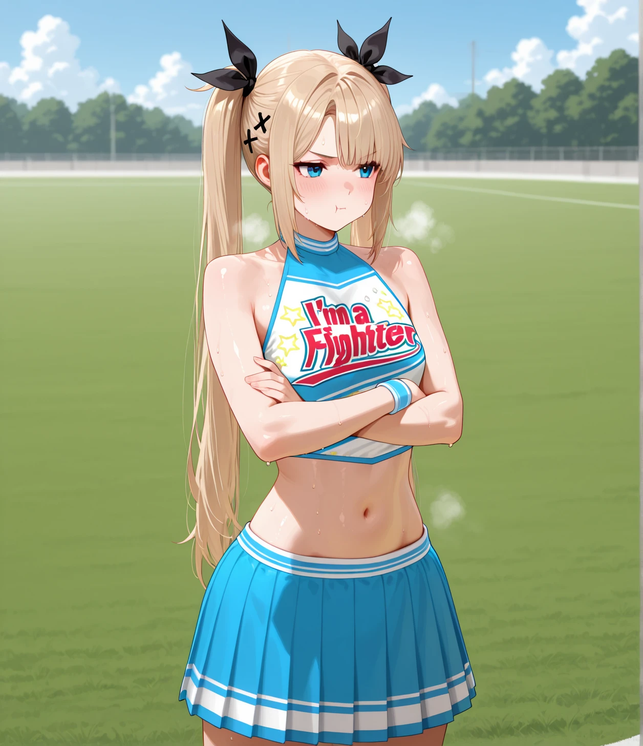 cheer-marie,blonde hair,twintails,x hair ornament,long hair,hair ribbon,black ribbon,blue eyes,cheerleader,aqua crop top,midriff,navel,aqua skirt,pleated skirt,wristband,clothes writing,I'ma,Fighter,sneaker,leg warmers,small ,