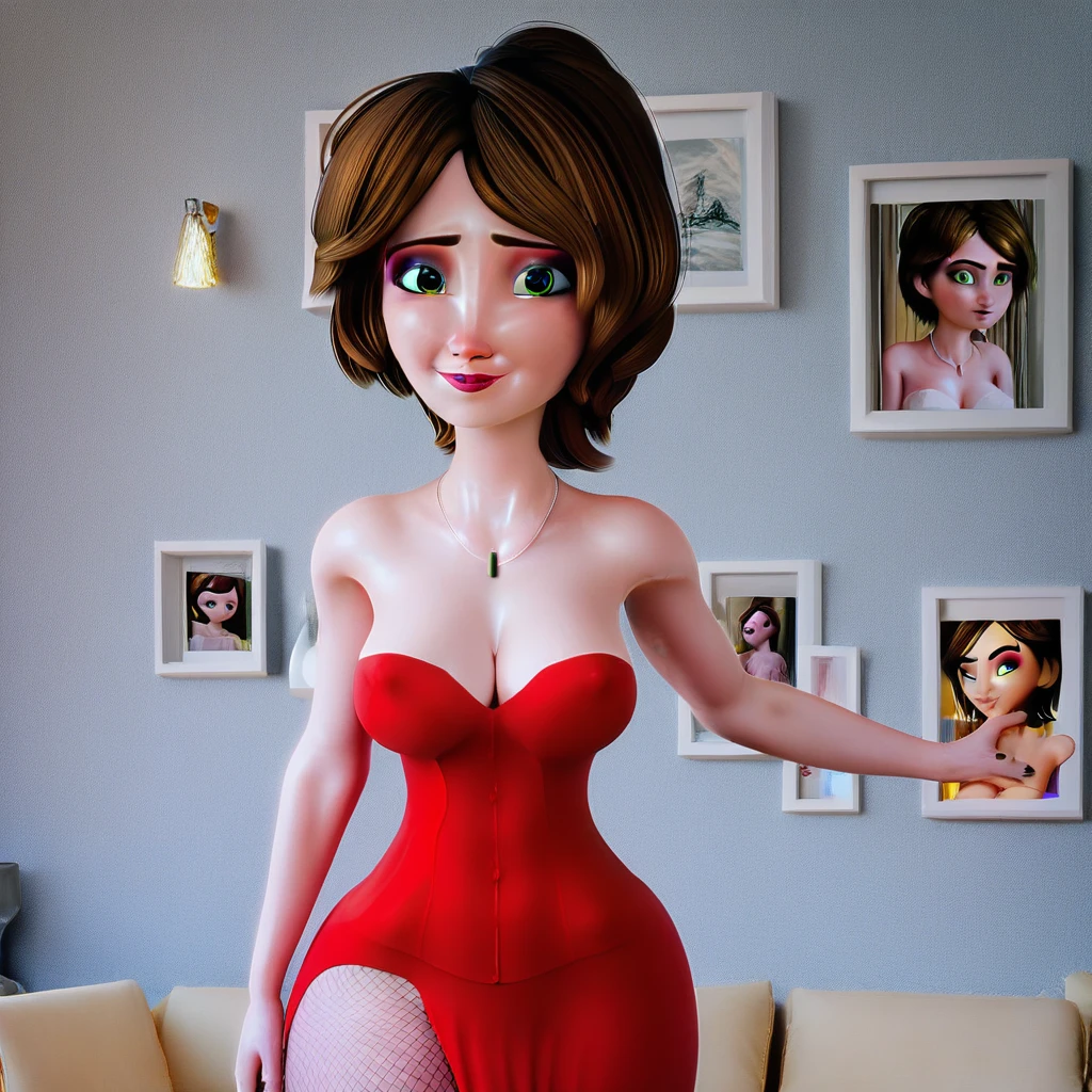 green eyes, brown hair, short hair, necklace, lipstick, eyeshadow