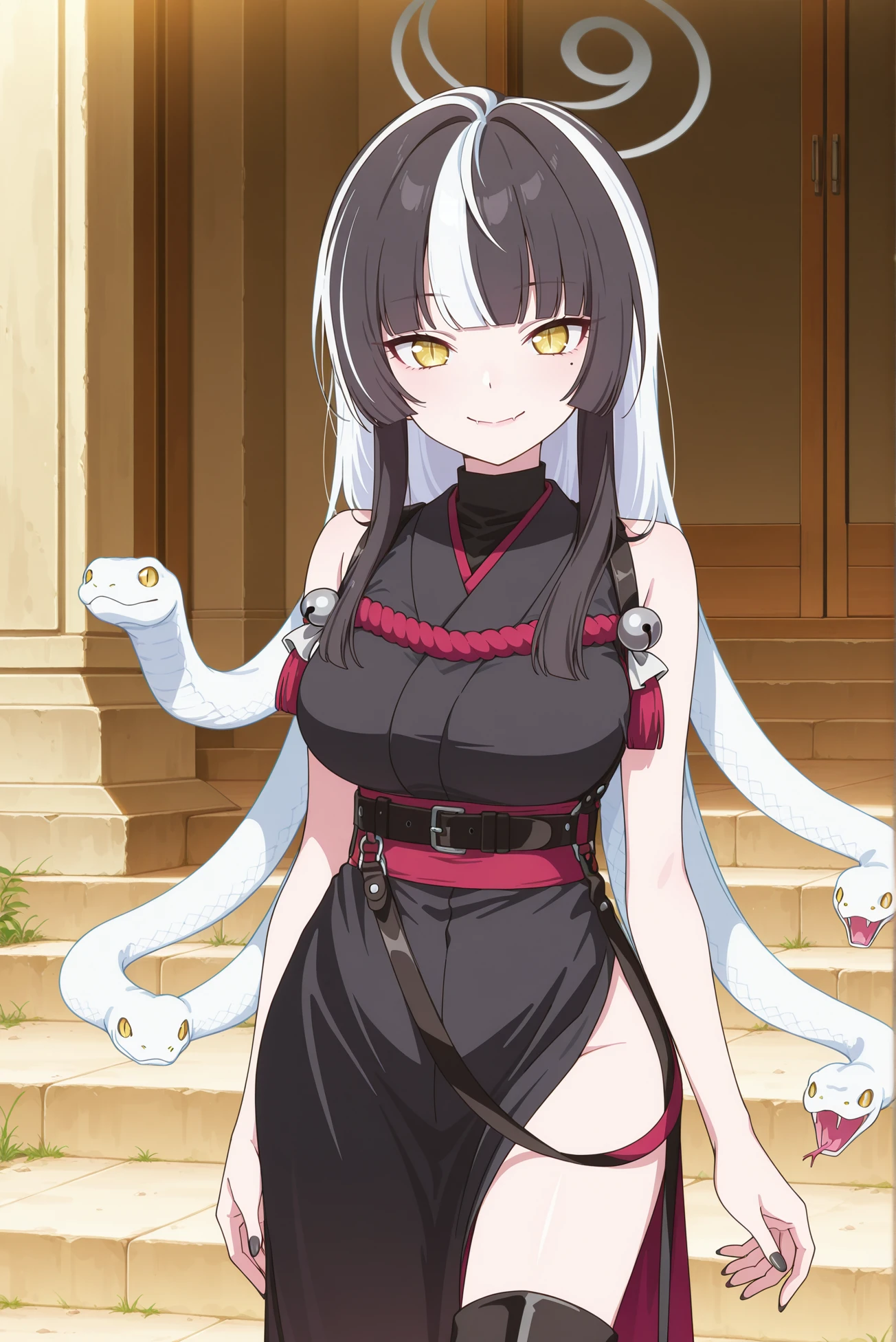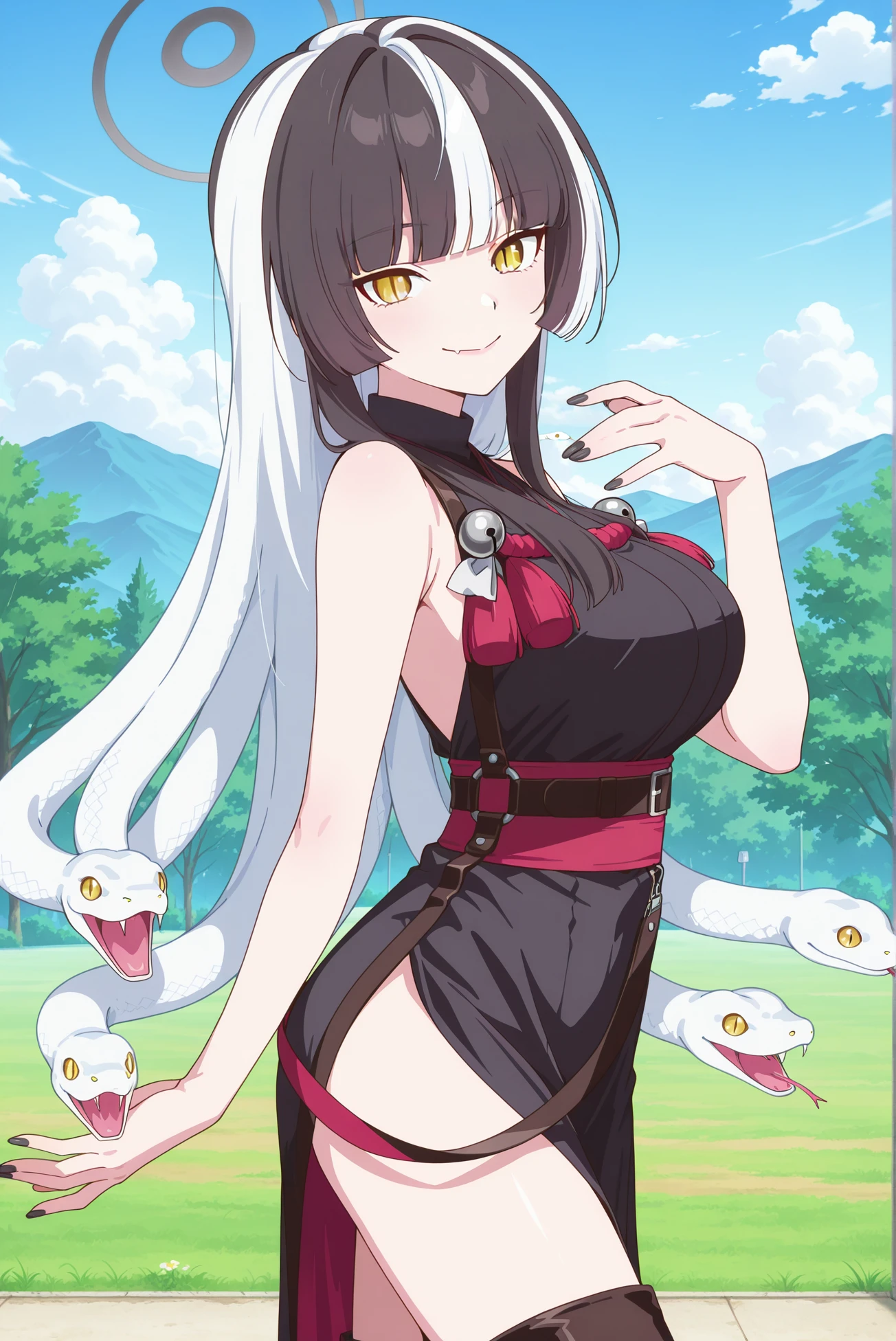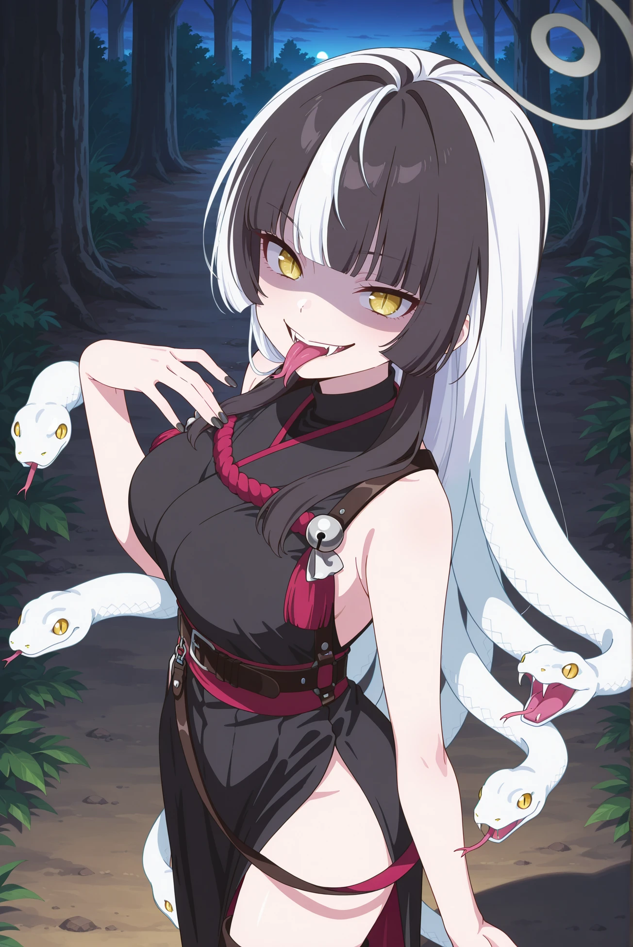 Appearance: black hair, white hair, two-tone hair, streaked hair, long hair, halo, living hair, snake hair, blunt bangs, white snake, yellow eyes, slit pupils,