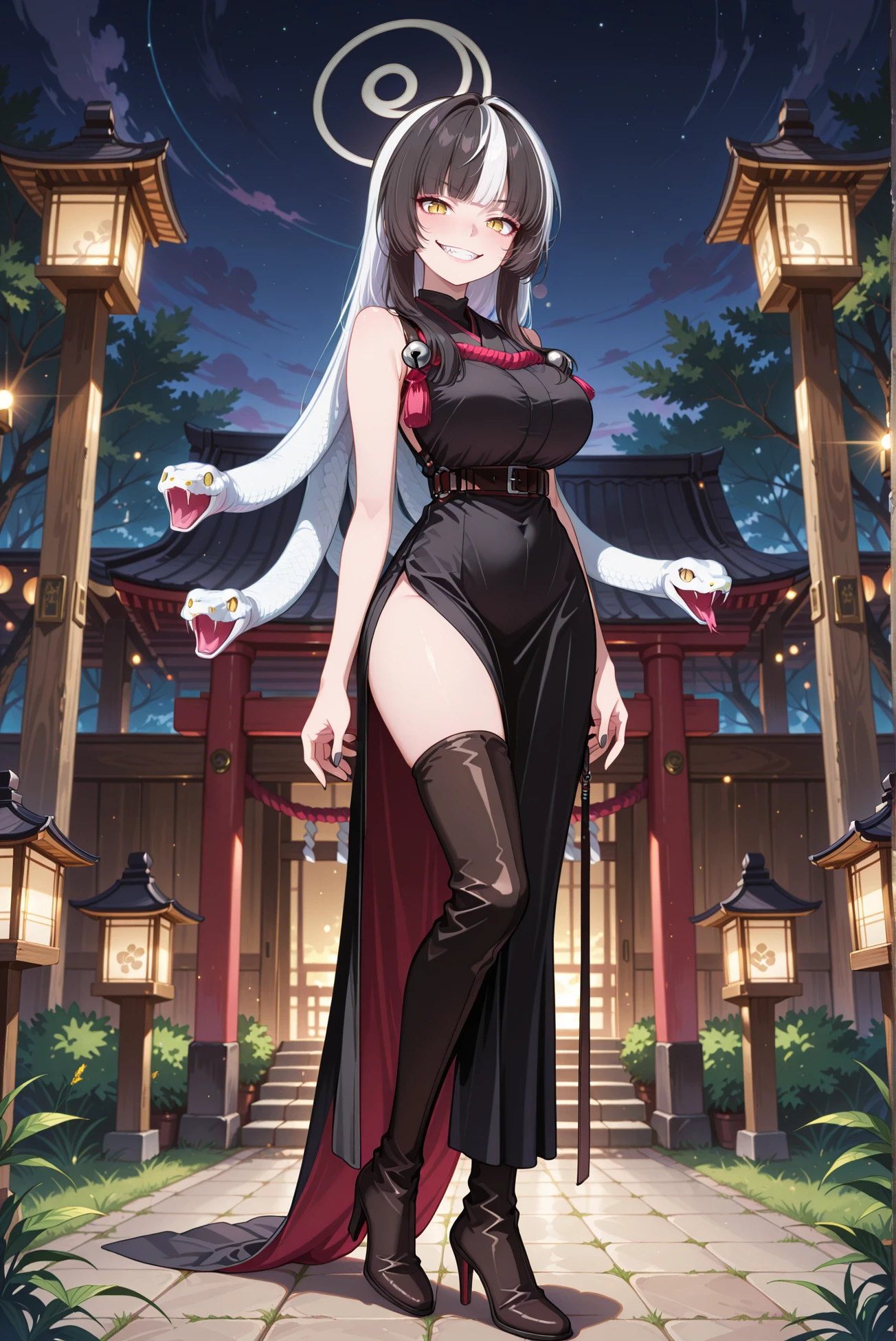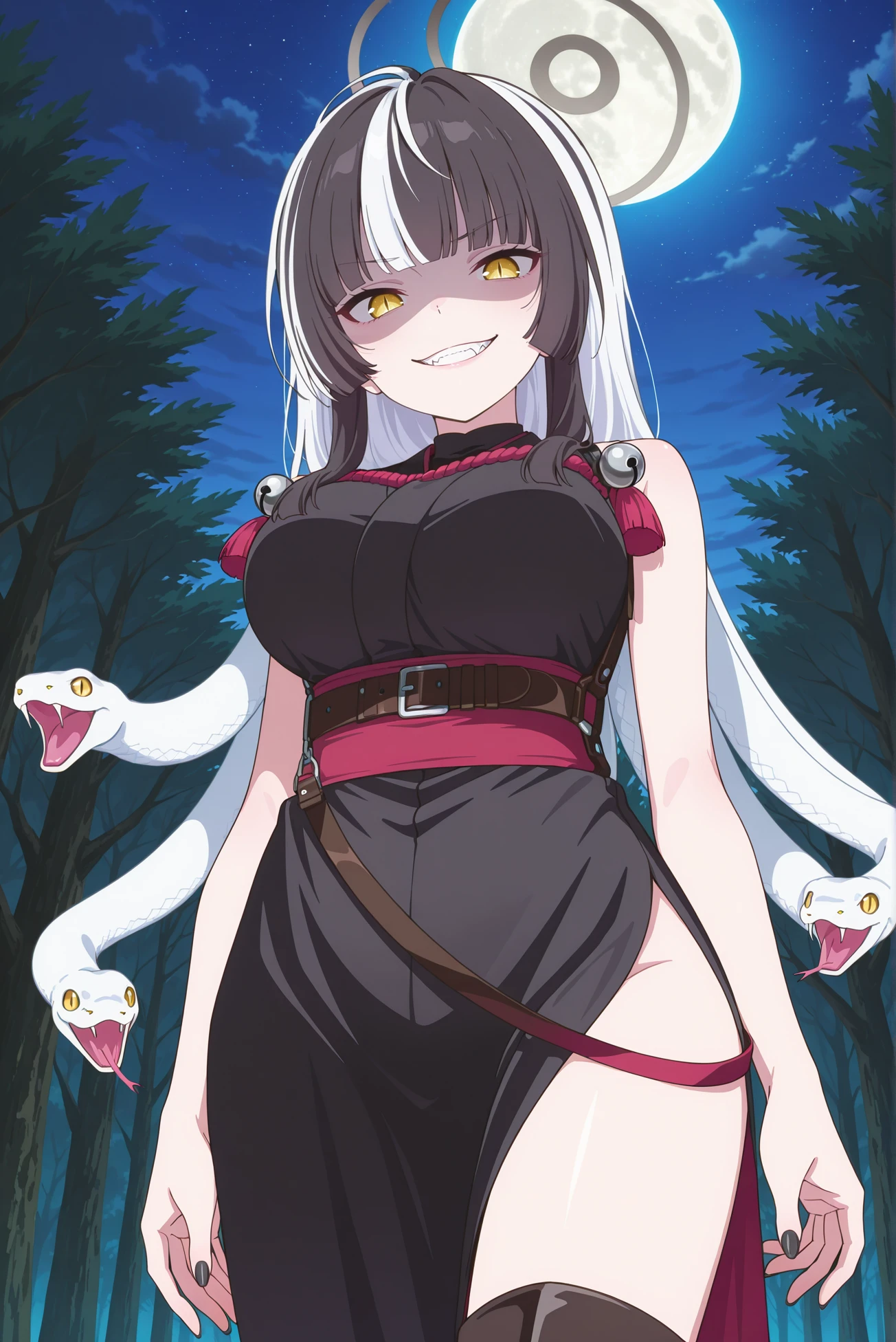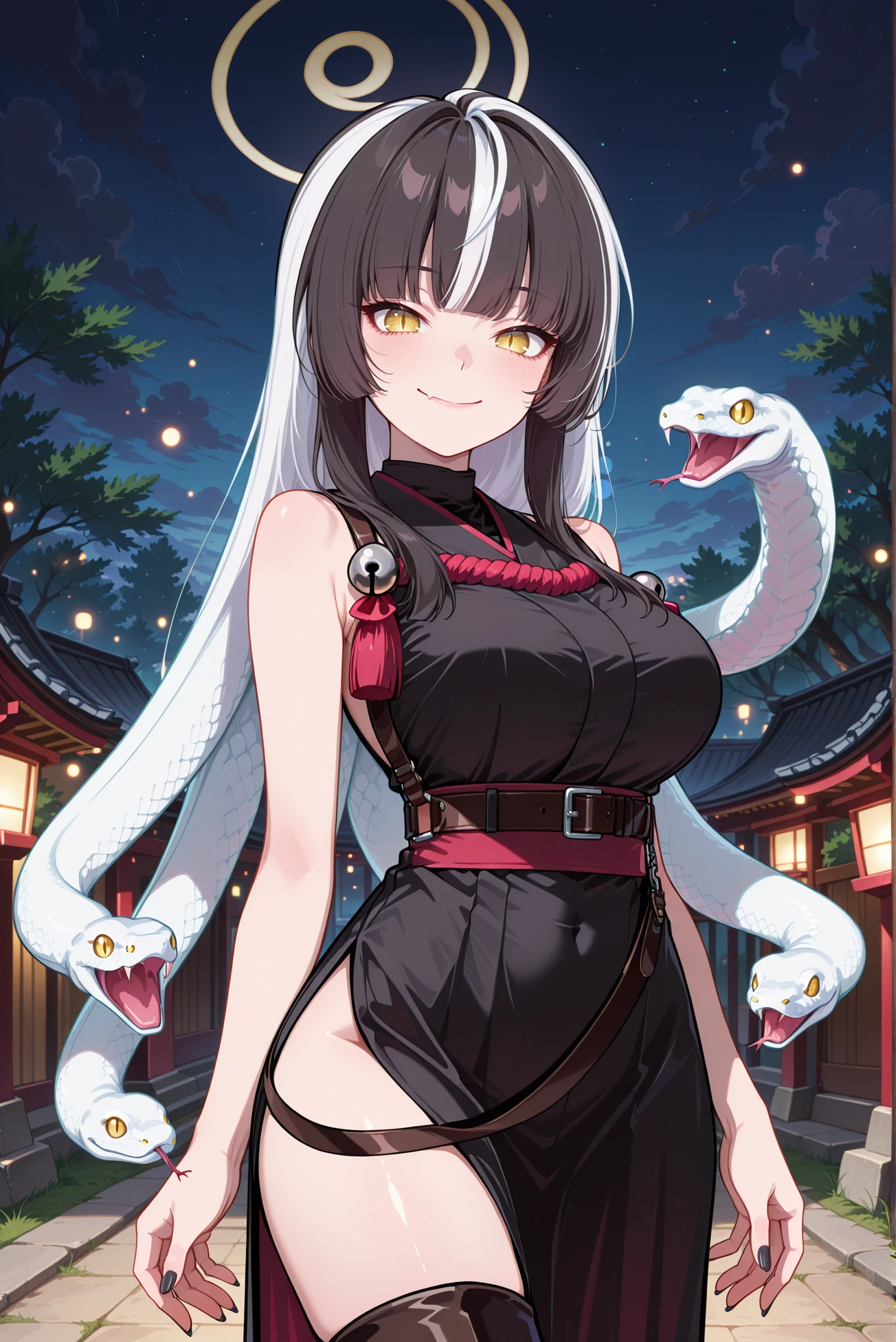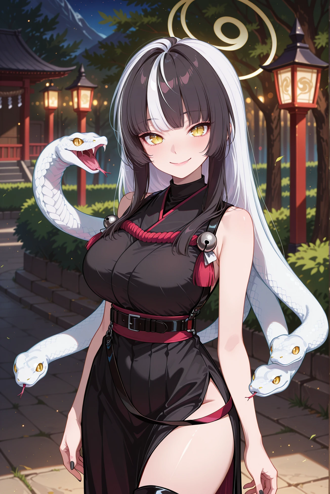 Appearance: black hair, white hair, two-tone hair, streaked hair, long hair, halo, living hair, snake hair, blunt bangs, white snake, yellow eyes, slit pupils,