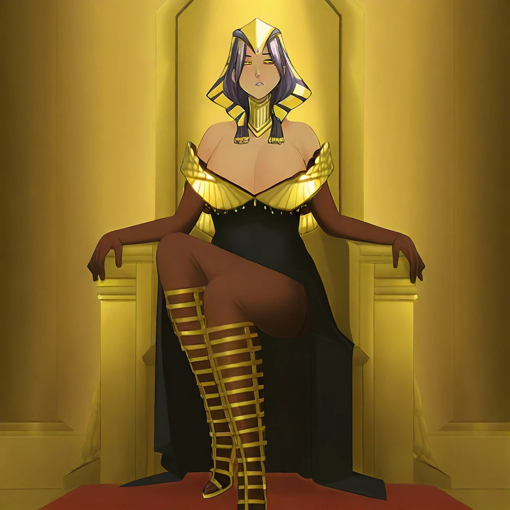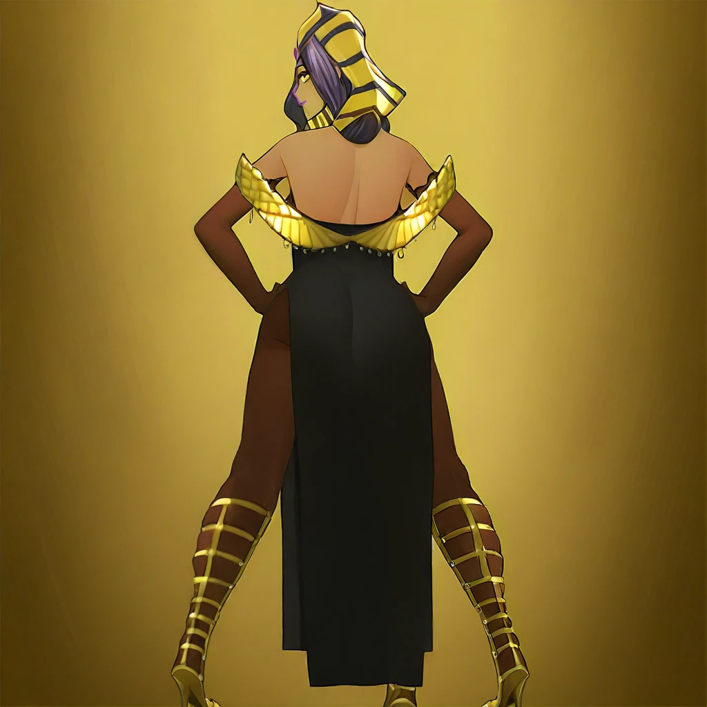 egyptian headpiece, see-through elbow gloves, see-through bodysuit, dress, gold strapped highheeled boots,