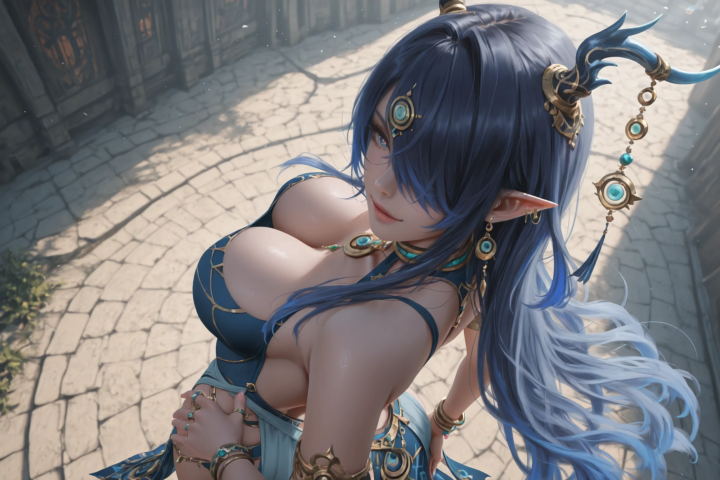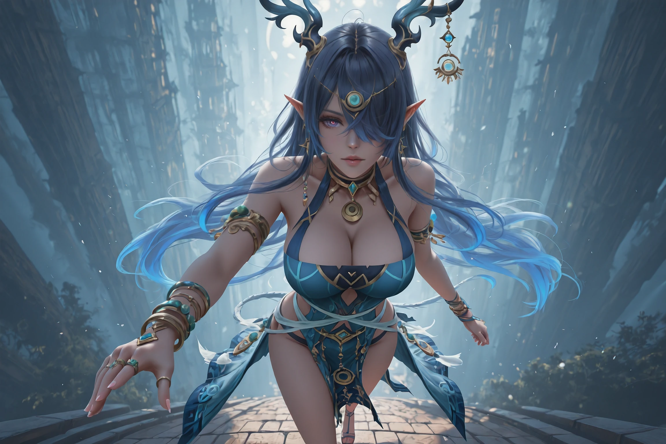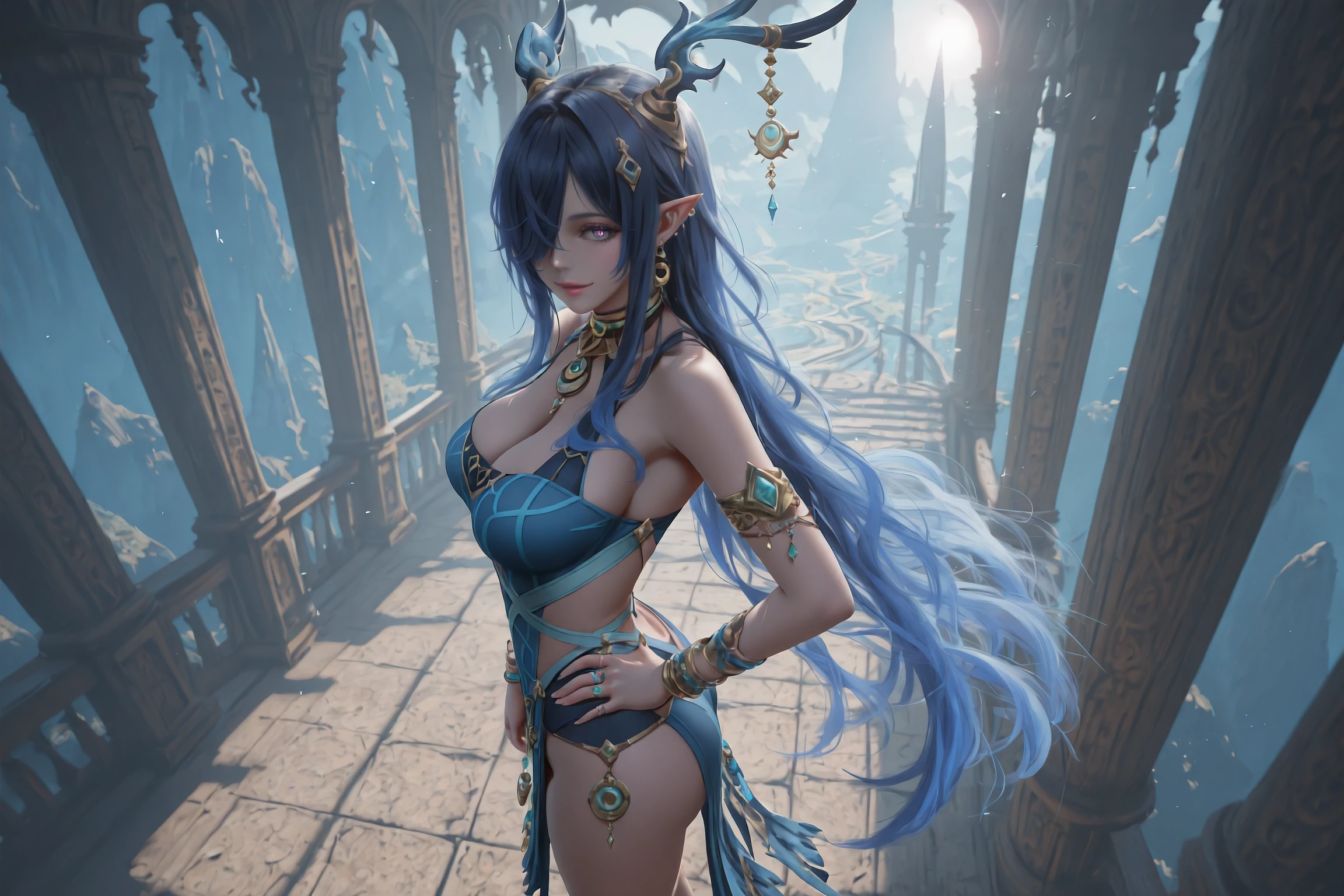Main Prompt:Lauma,1girl,solo,horns,antlers,long hair,pointy ears,jewelry,hair over one eye,bracelet,tachi-e,blue eyes,sandals,earrings,horn ornament,blue dress,blue hair,armlet,very long hair,ring,multiple bracelets,one eye covered,straight-on,black hair,pelvic curtain,multicolored eyes,dragon girl,clothing cutout,two-tone eyes,gradient eyes,