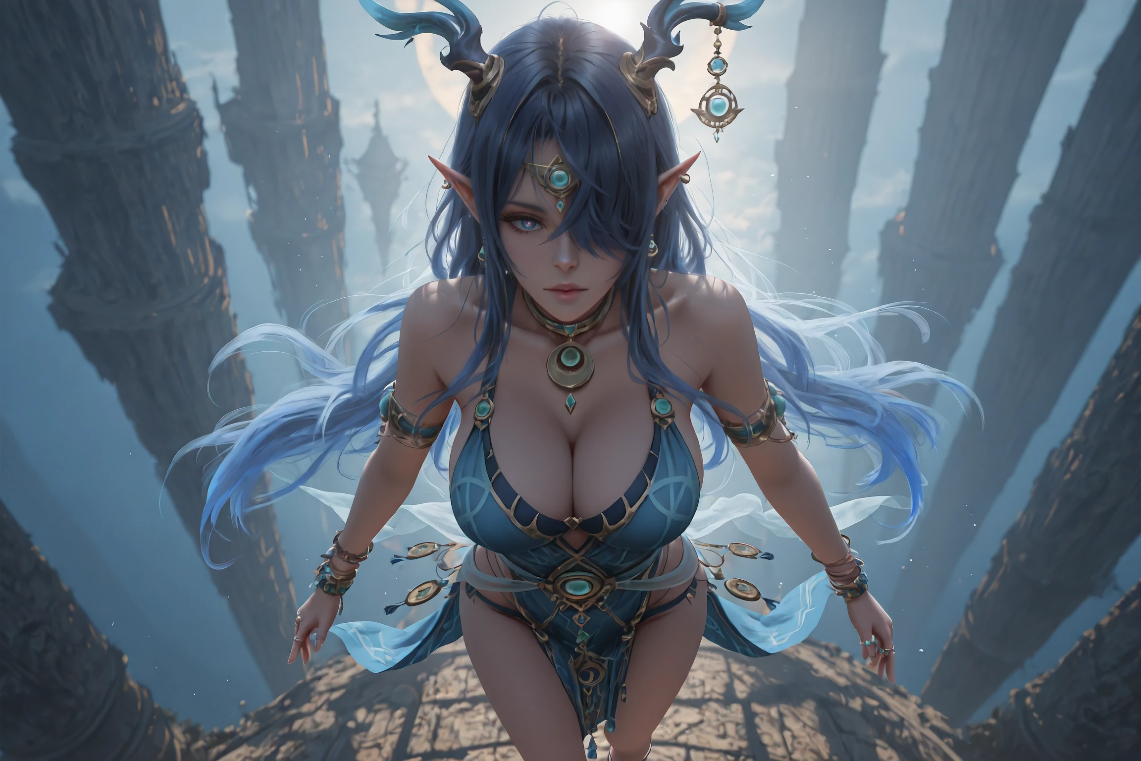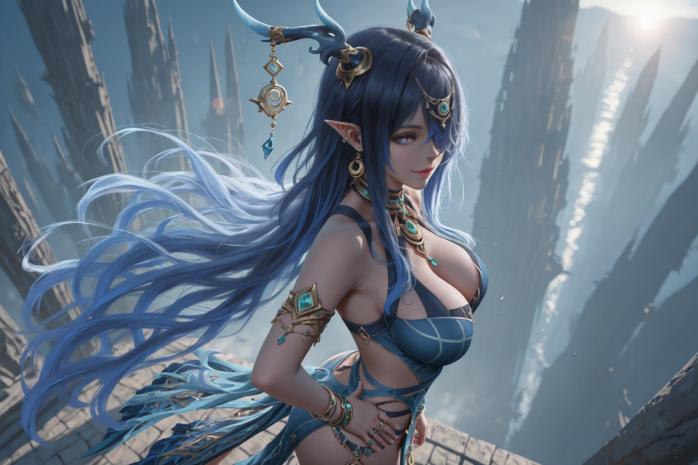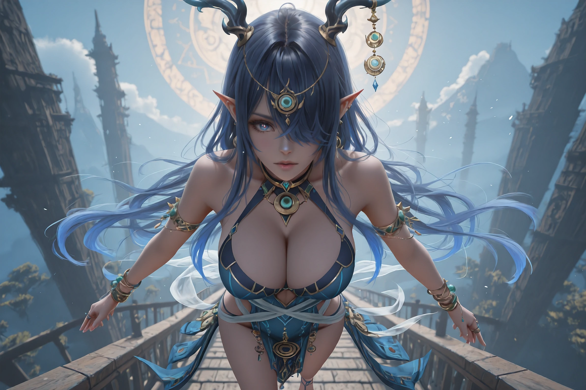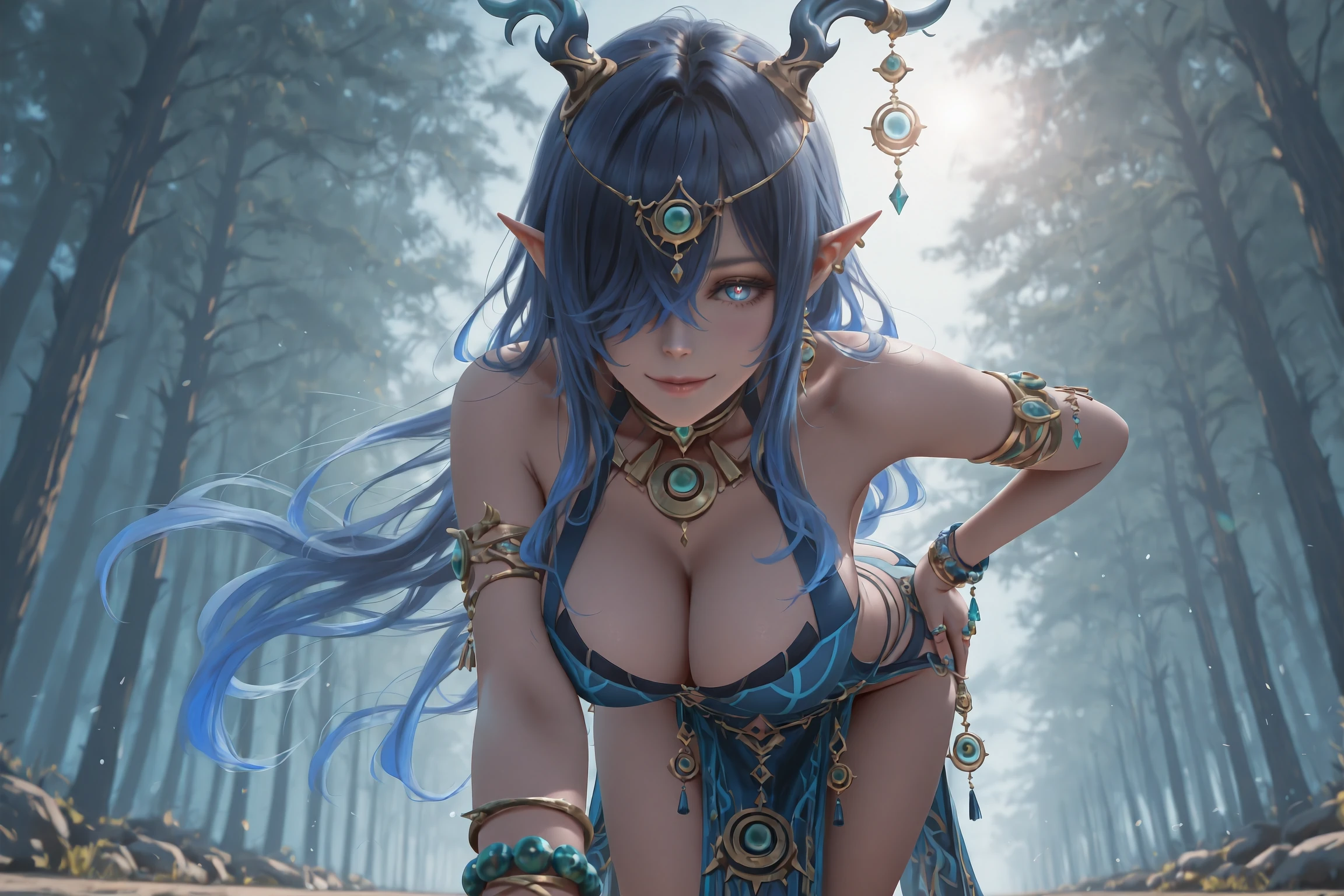 Main Prompt:Lauma,1girl,solo,horns,antlers,long hair,pointy ears,jewelry,hair over one eye,bracelet,tachi-e,blue eyes,sandals,earrings,horn ornament,blue dress,blue hair,armlet,very long hair,ring,multiple bracelets,one eye covered,straight-on,black hair,pelvic curtain,multicolored eyes,dragon girl,clothing cutout,two-tone eyes,gradient eyes,