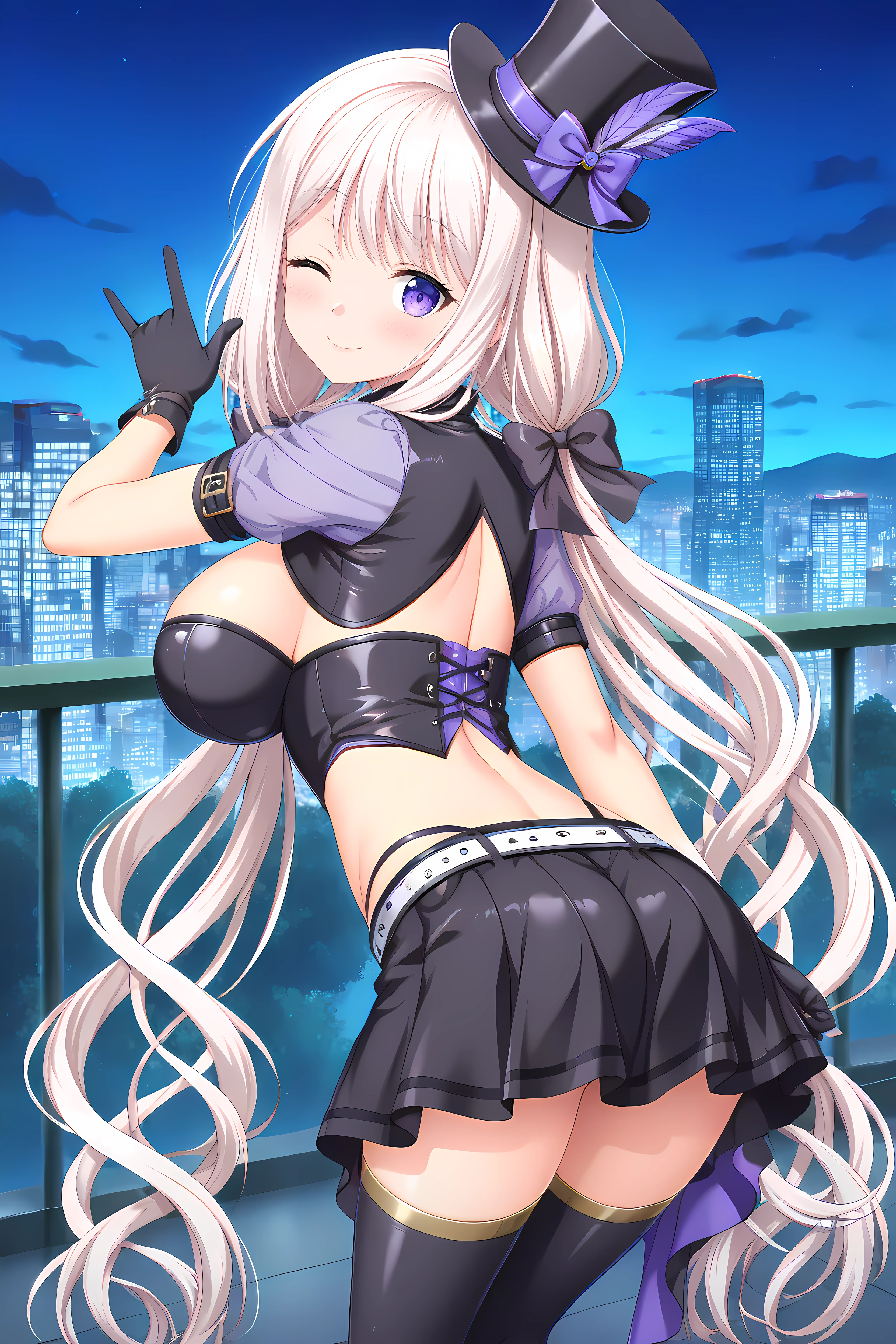 Thief(Ecchi ????? outfit) : Thief Atena,purple bow,short sleeves,belt,pleated skirt,black thighhighs,navel,top hat,bow,black headwear,black skirt,low twintails,low twintails
