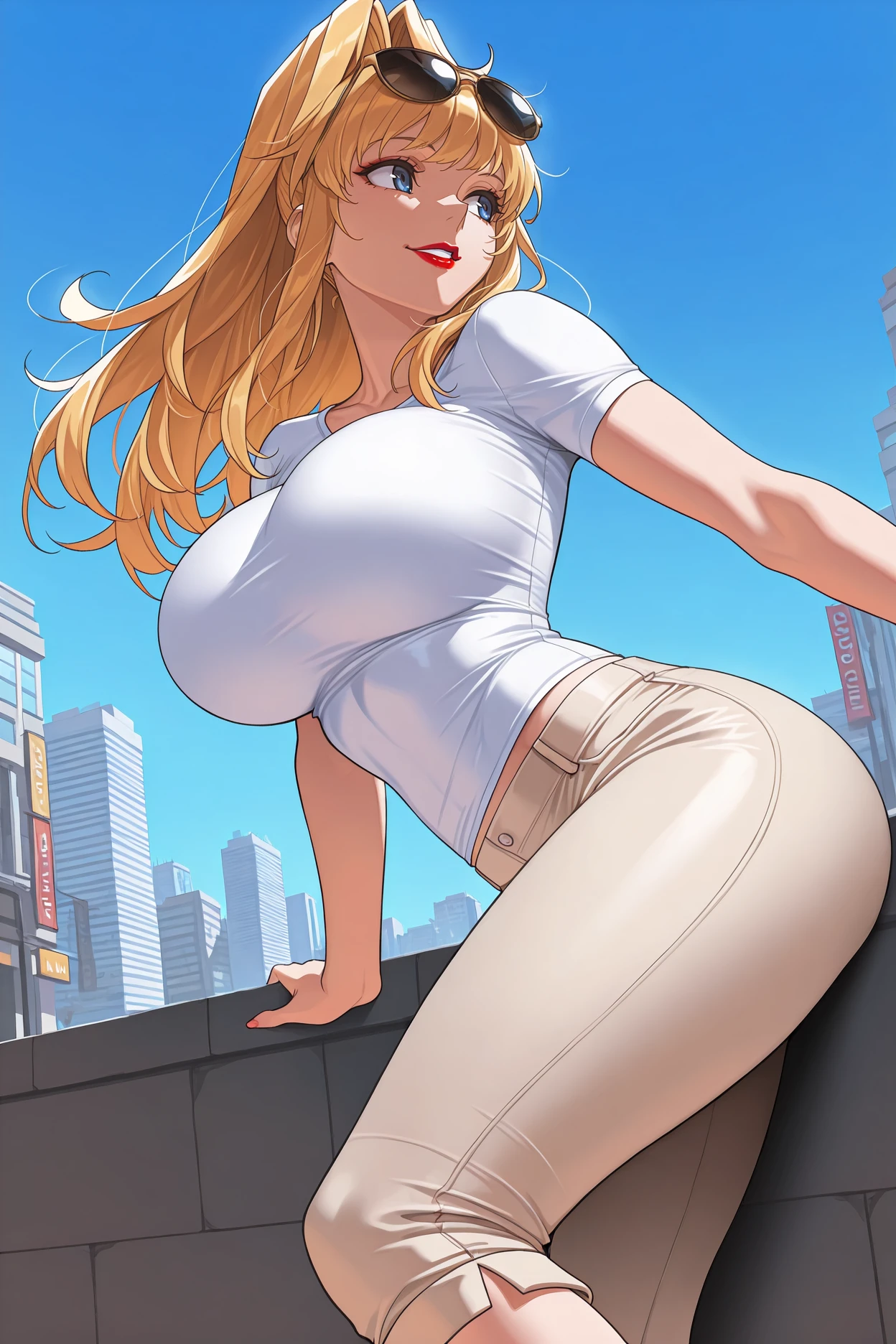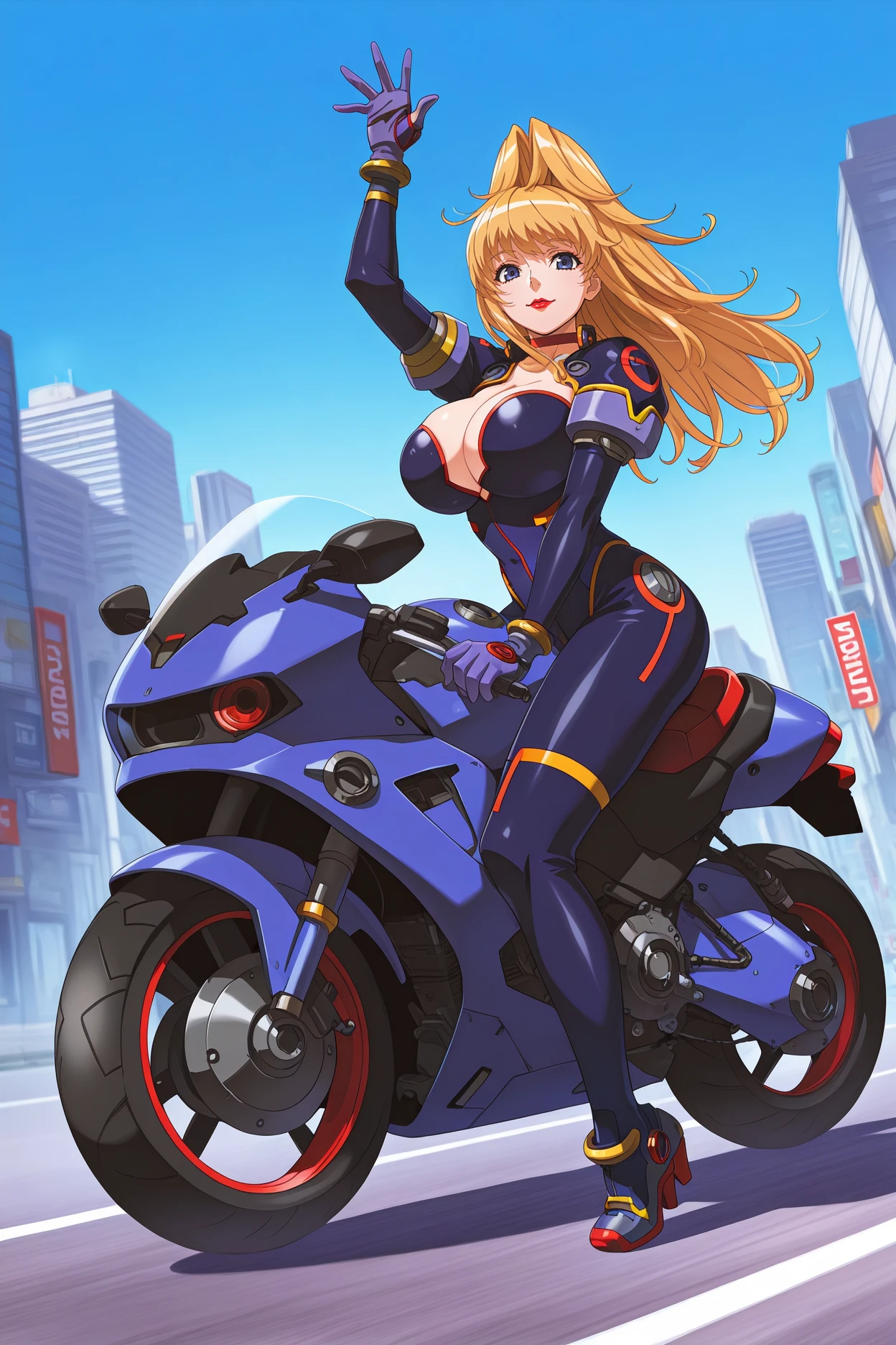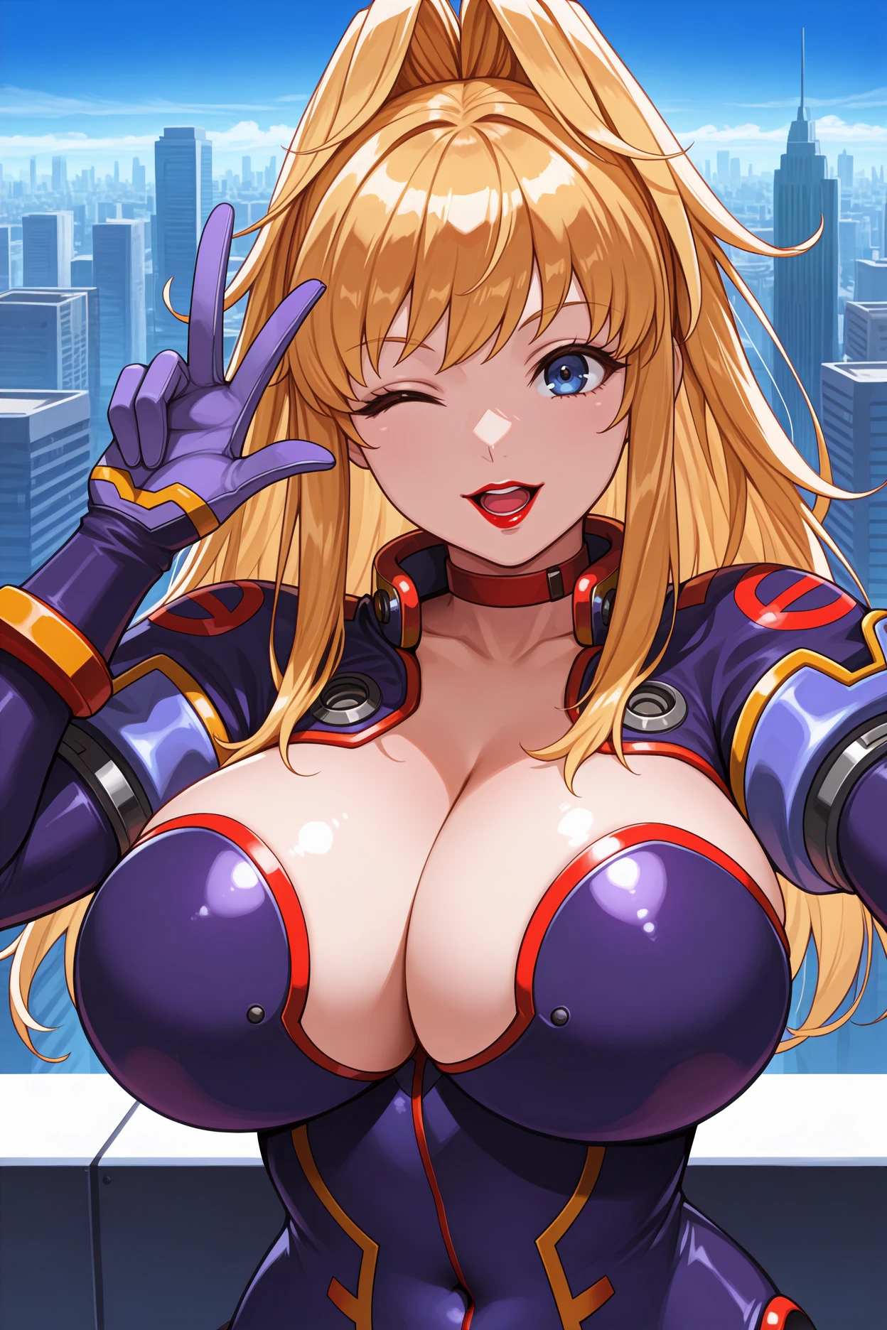 Add "red choker, pilot suit, dark blue bodysuit, cleavage cutout, purple gloves, grey high heels" for her typical look.
