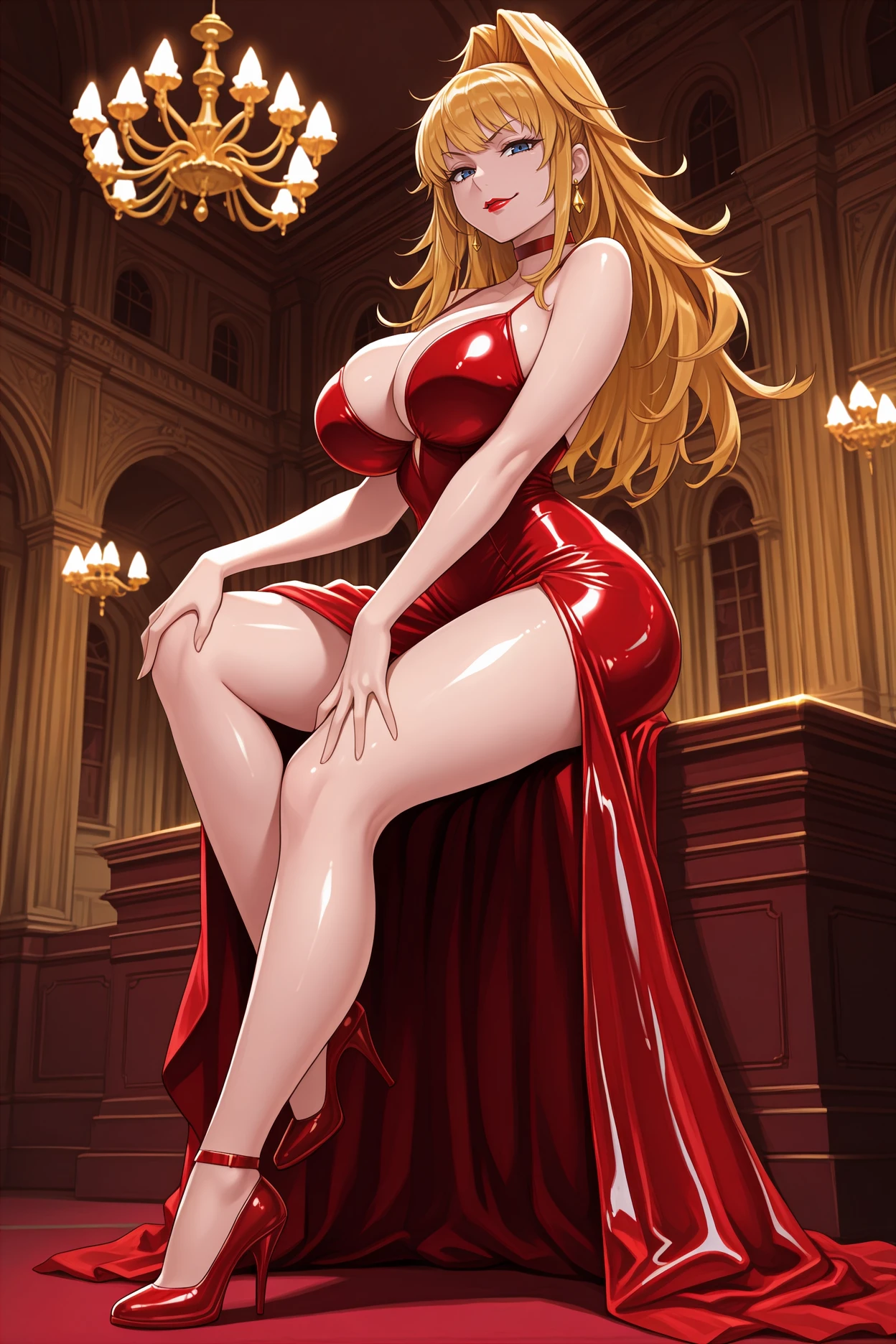 red choker, pilot suit, dark blue , cleavage cutout, purple gloves, grey high heels