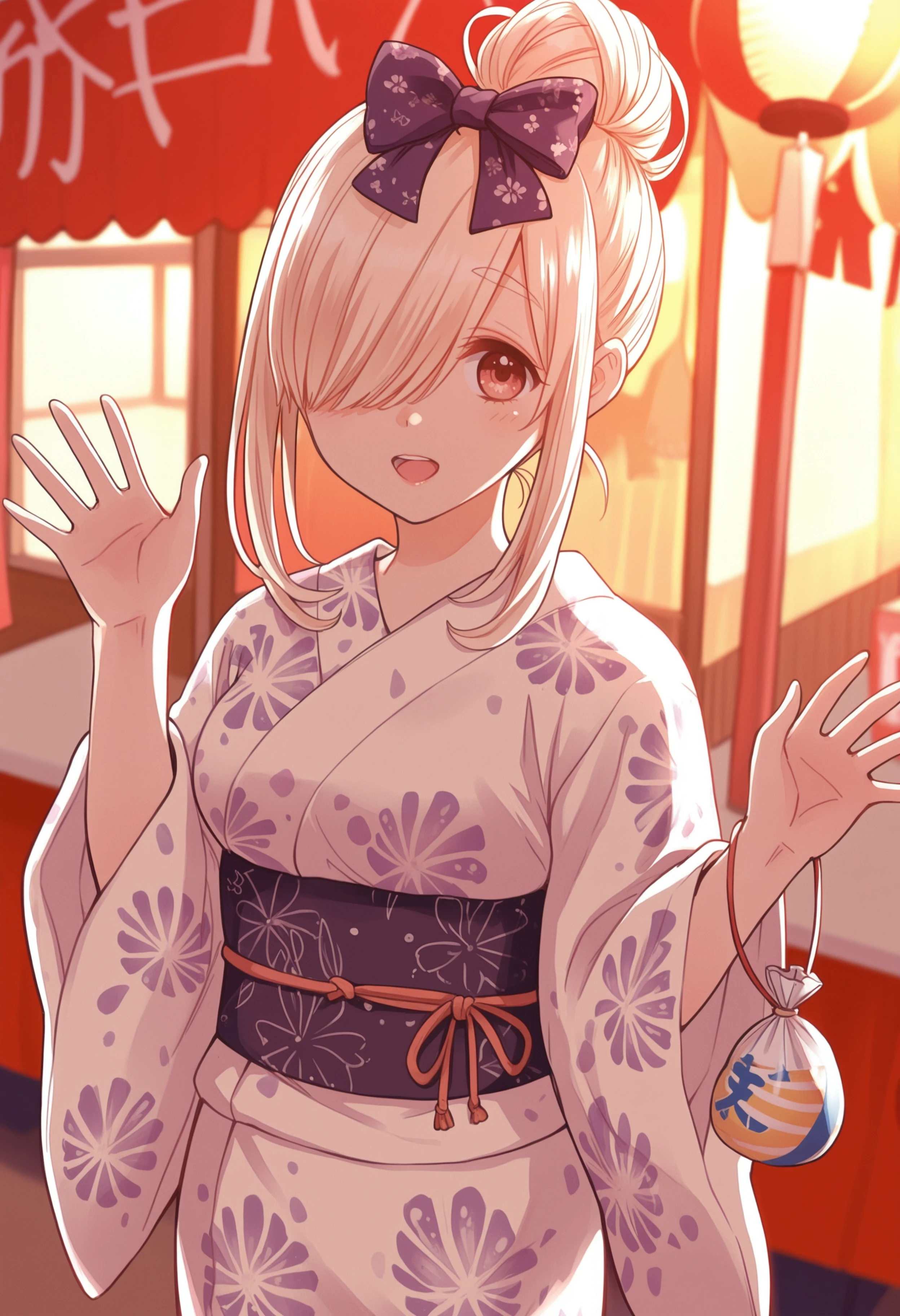 kakkoumanga_ai, brown eyes, hair over one eye, light blonde hair, hair bow,