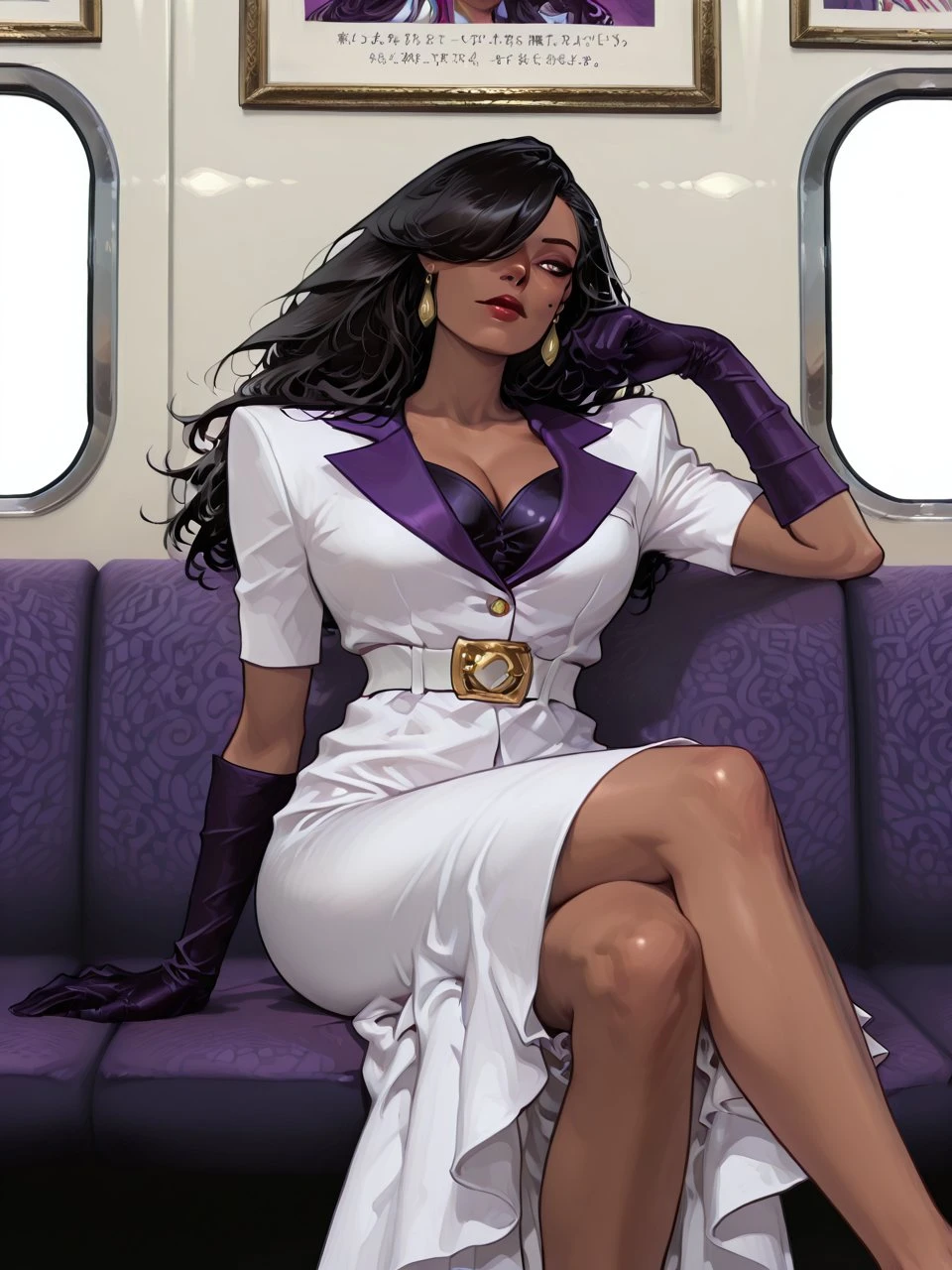 acc: mole under eye, makeup, red lips, (black/purple) layered gloves, white belt