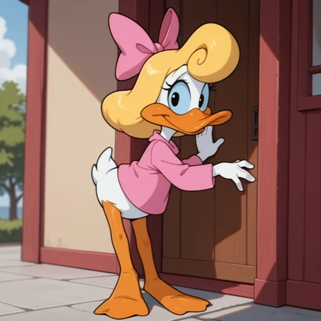ShirleyttaIl, semi-anthro, female, duck, blonde hair, blue sclera, black eyes, white feathers,