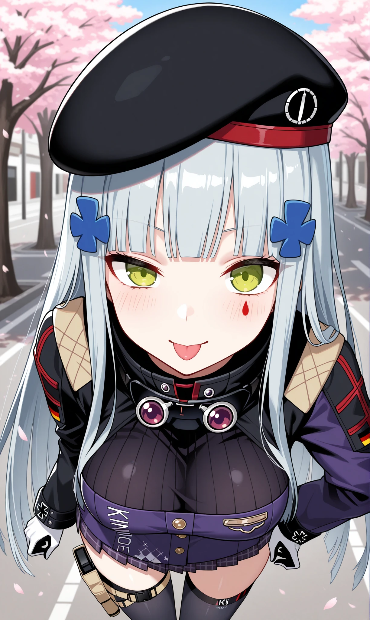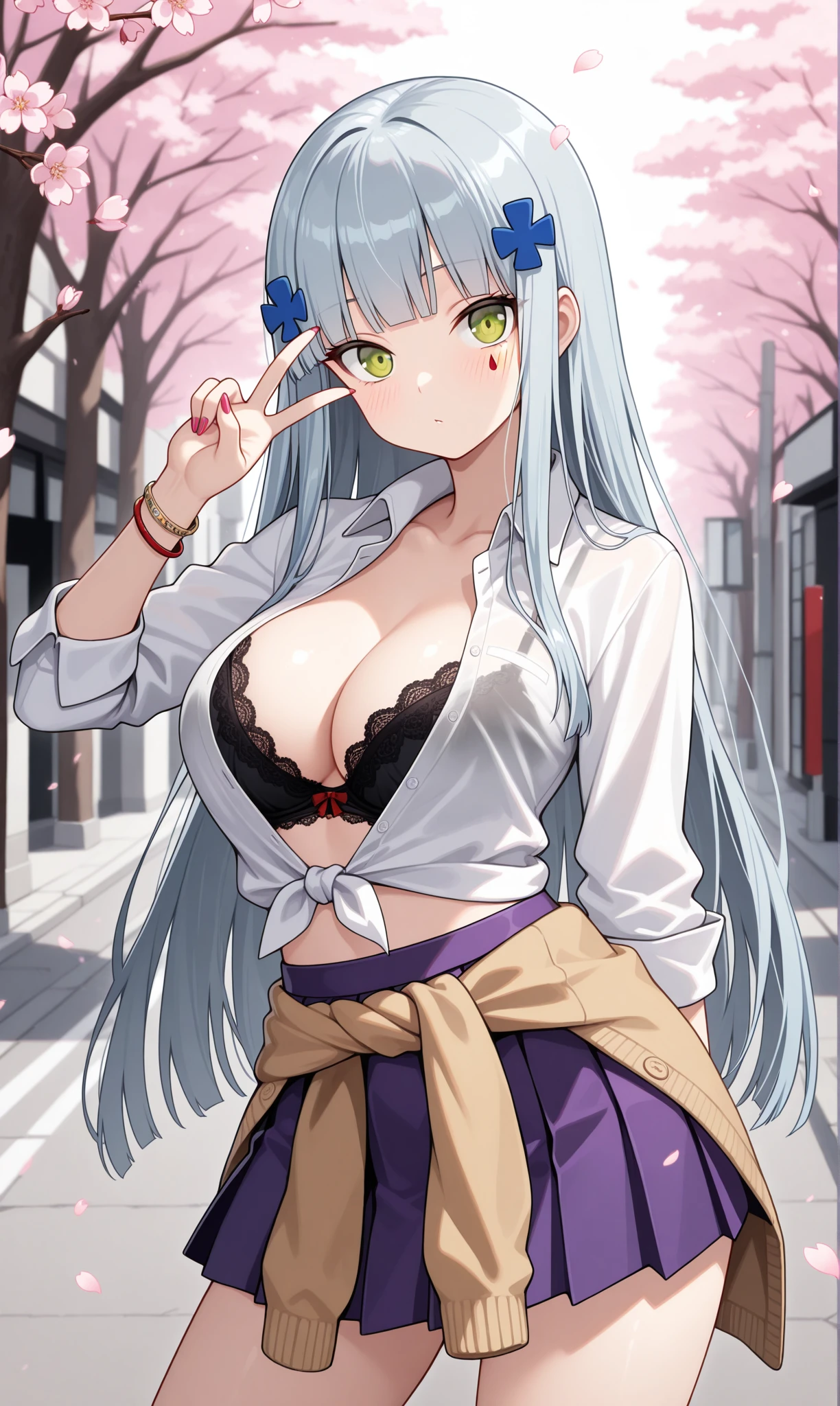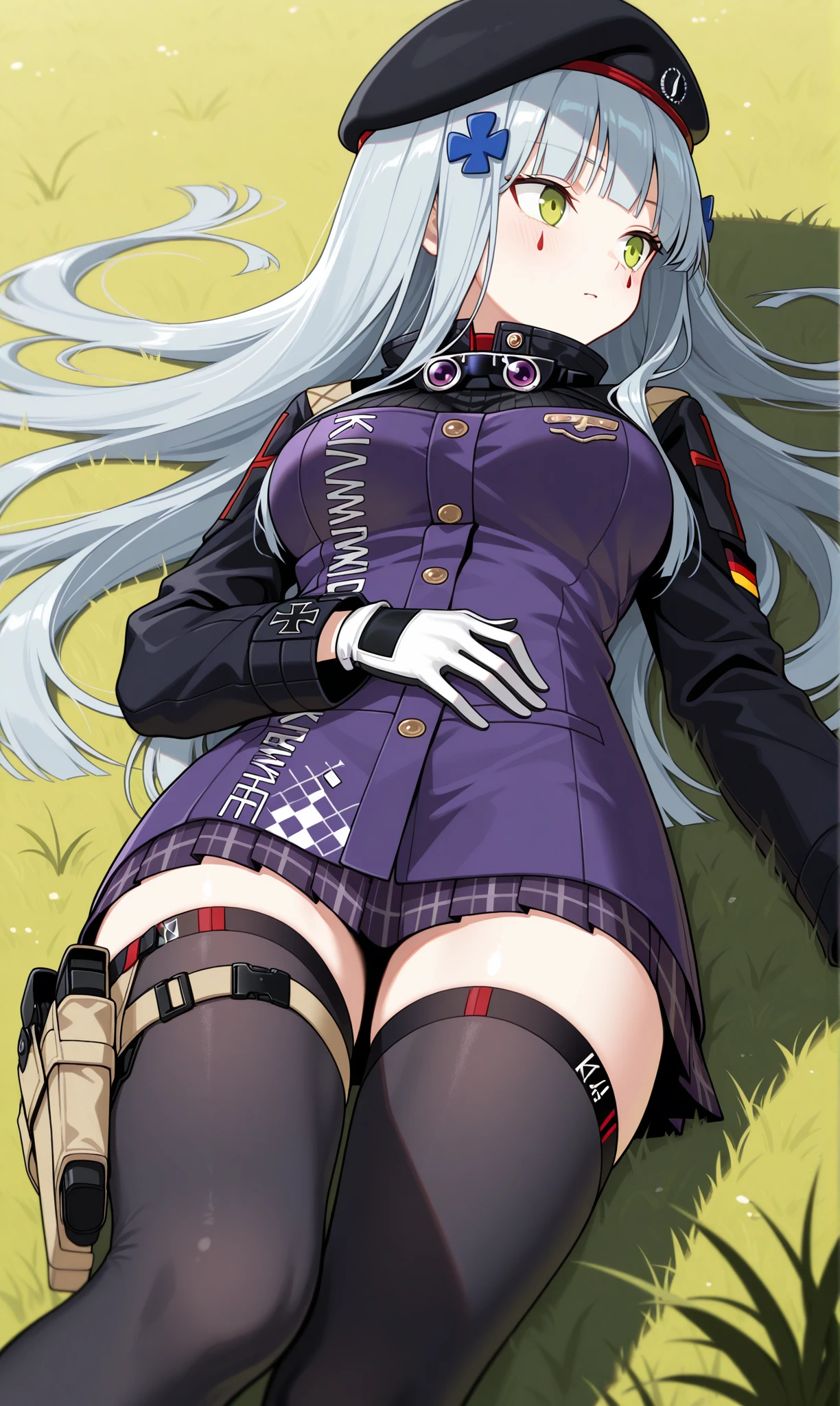 hk416 \(girls' frontline\), blunt bangs, grey hair, very long hair, green eyes, hair ornament, facial mark
