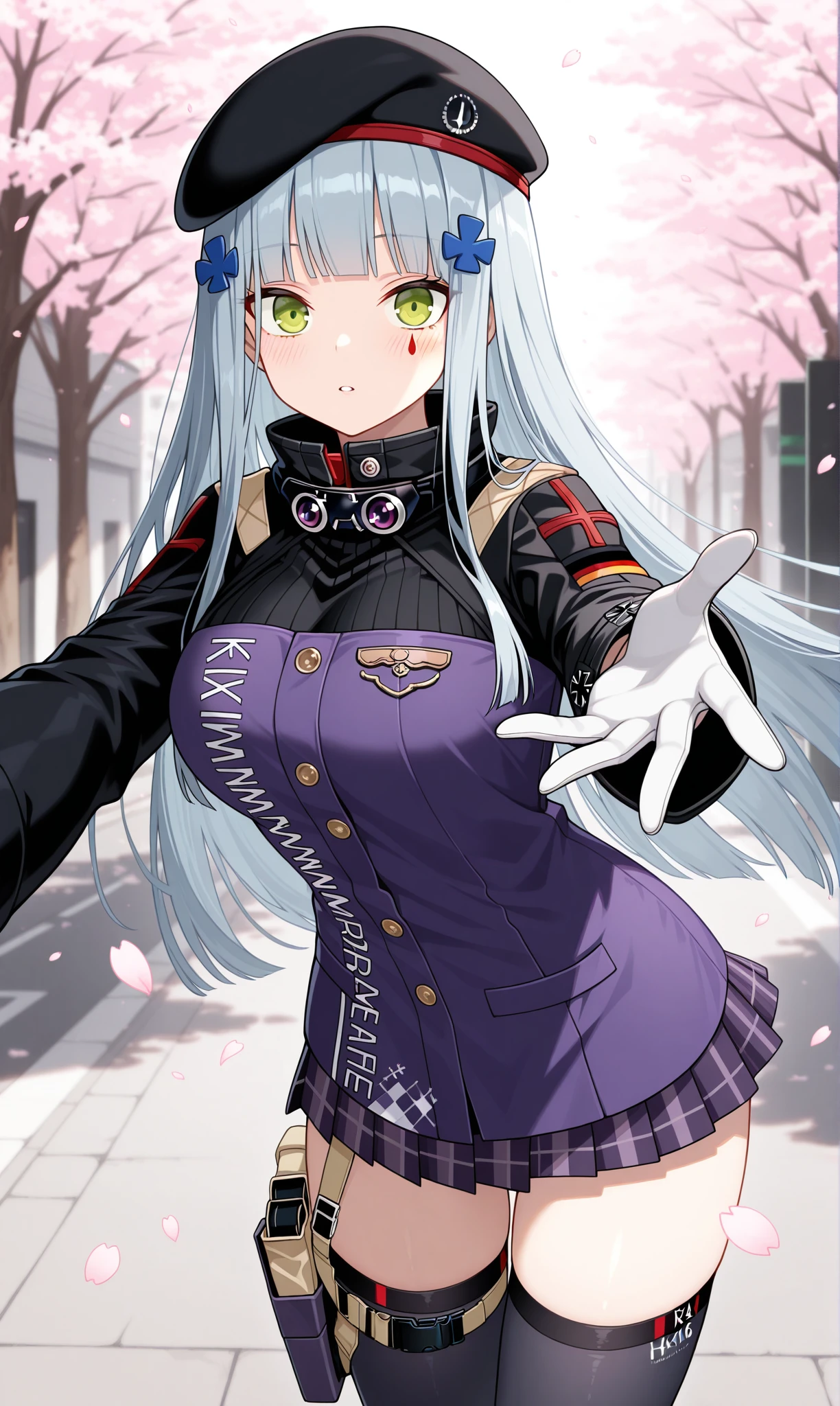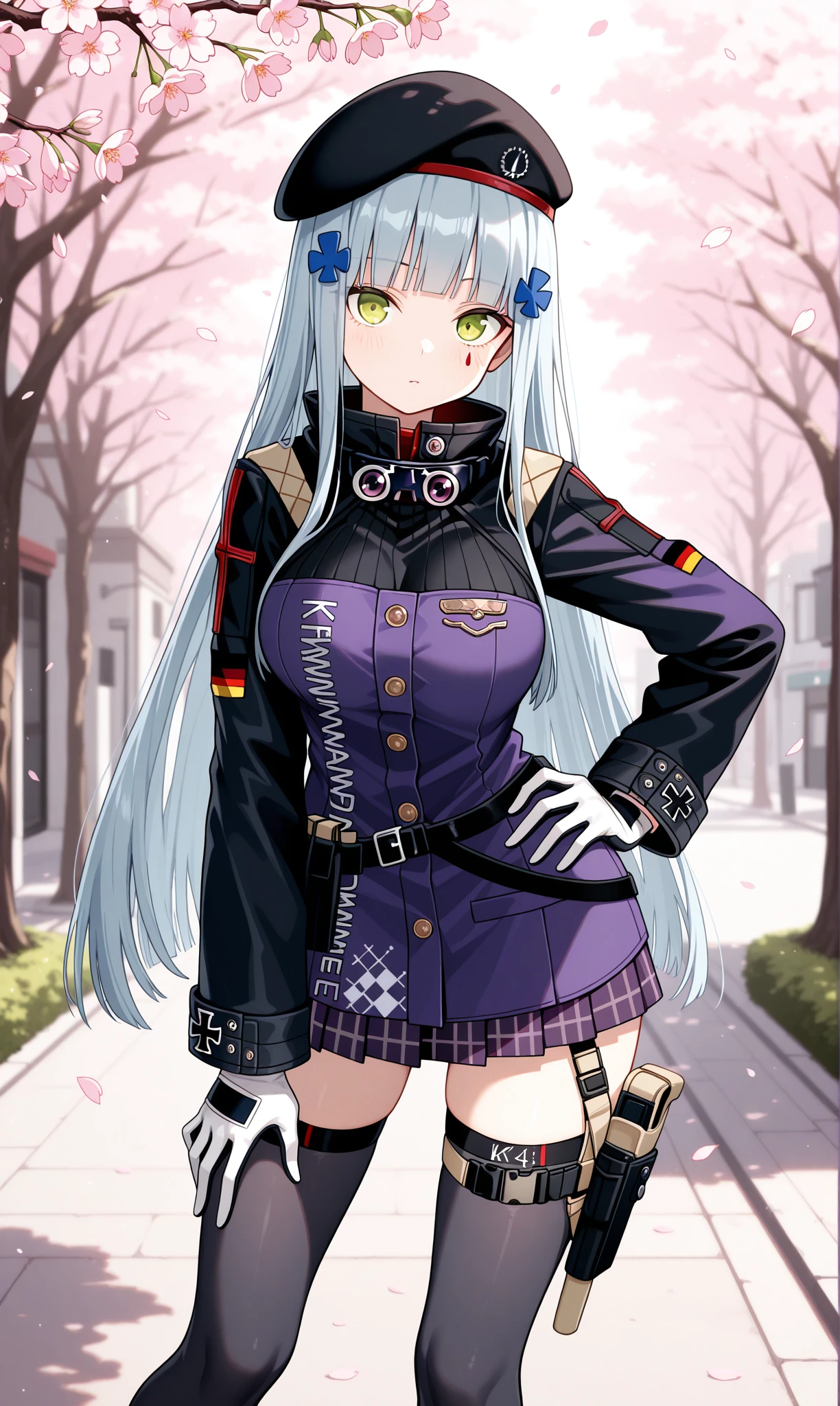 gloves, beret, plaid skirt, multicolored jacket, black thighhighs, black hat, german flag, iron cross, long sleeves, turtleneck, thigh strap, holster, thigh holsterDescription