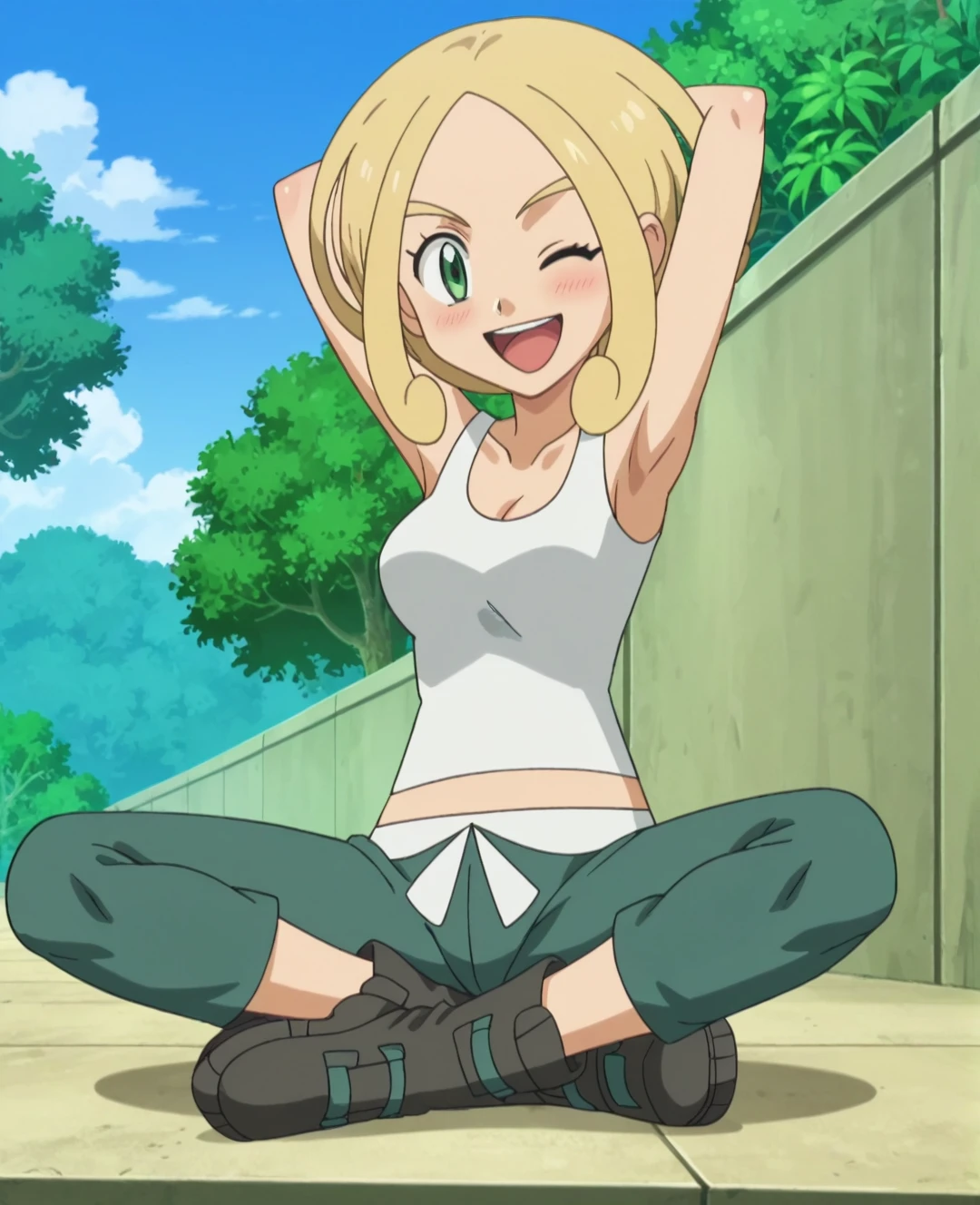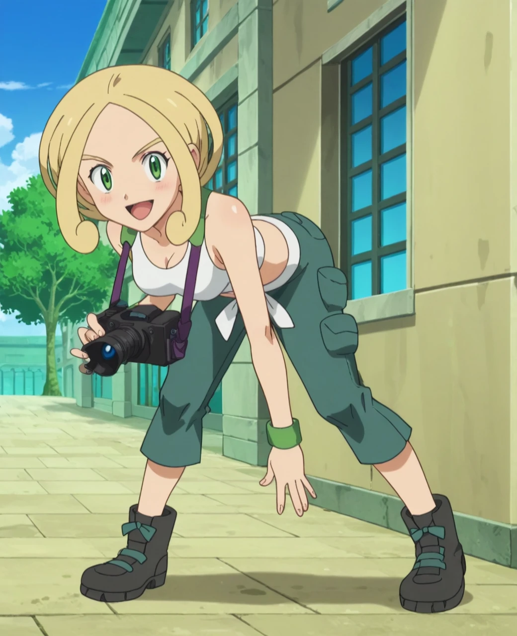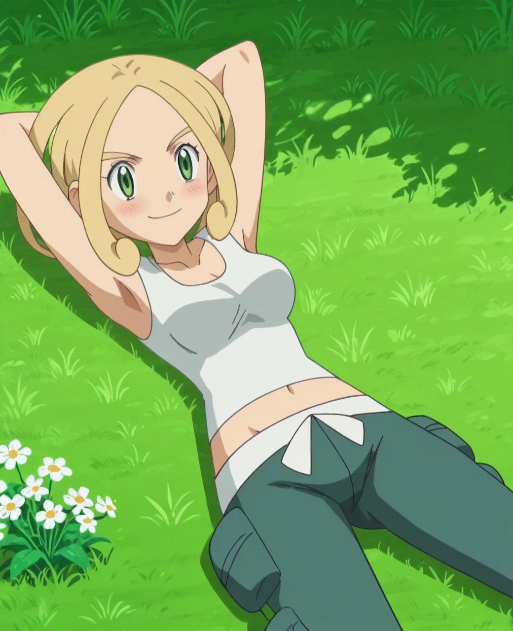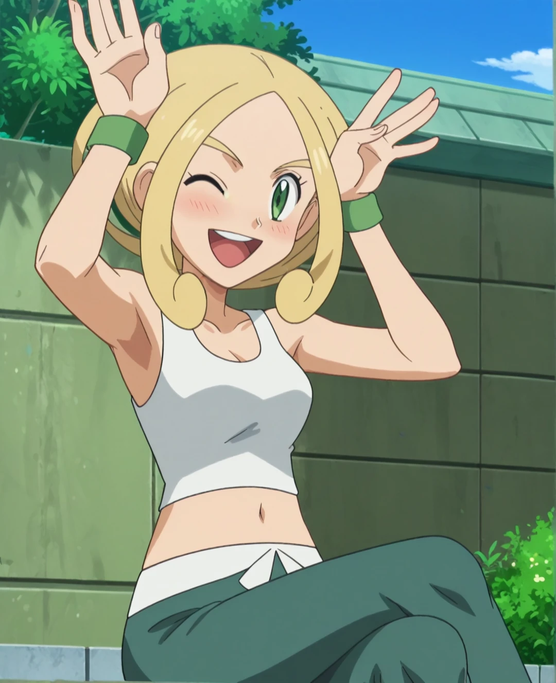 Trigger Words: violadef, 1girl, solo, blonde hair, green eyes, crop top, capri pants,