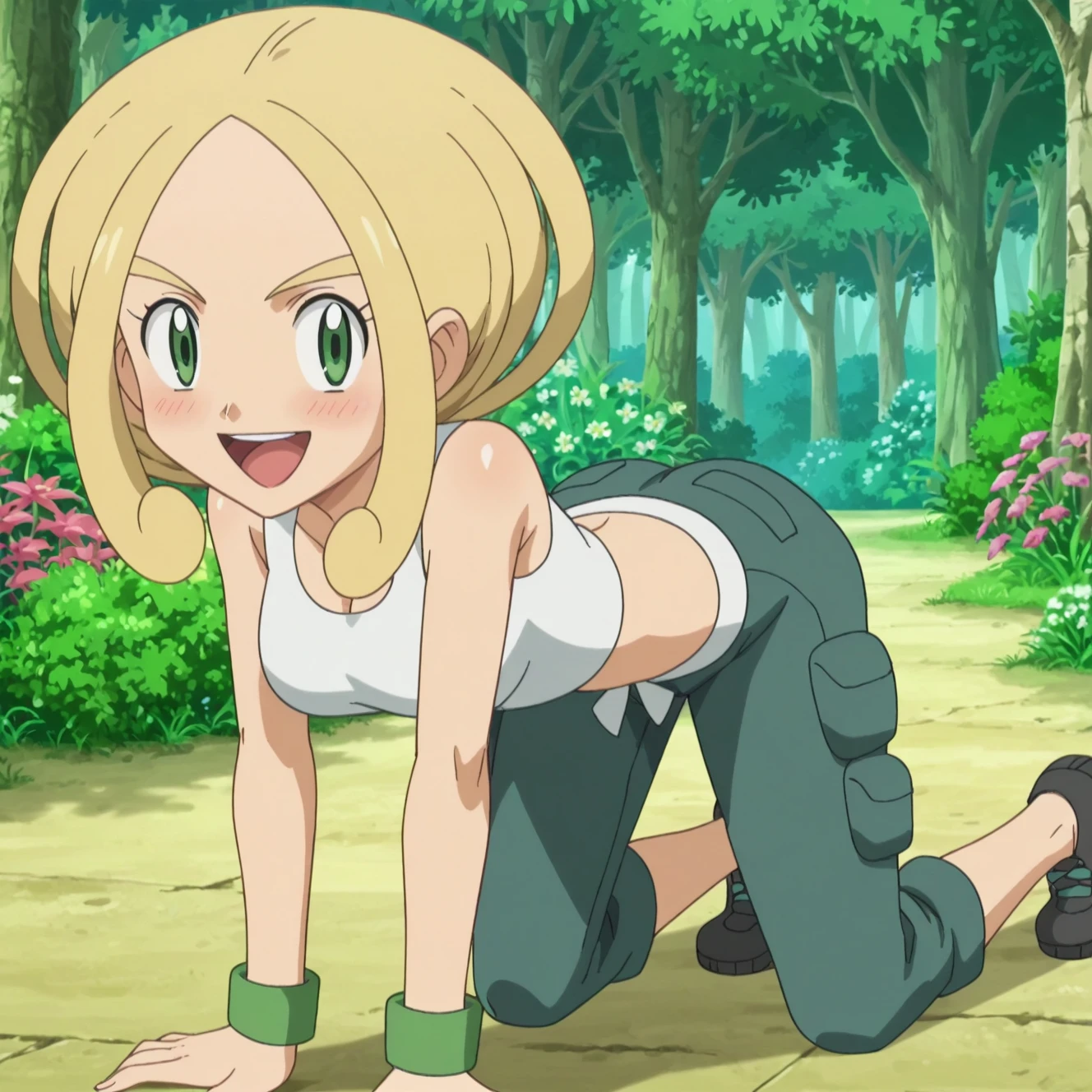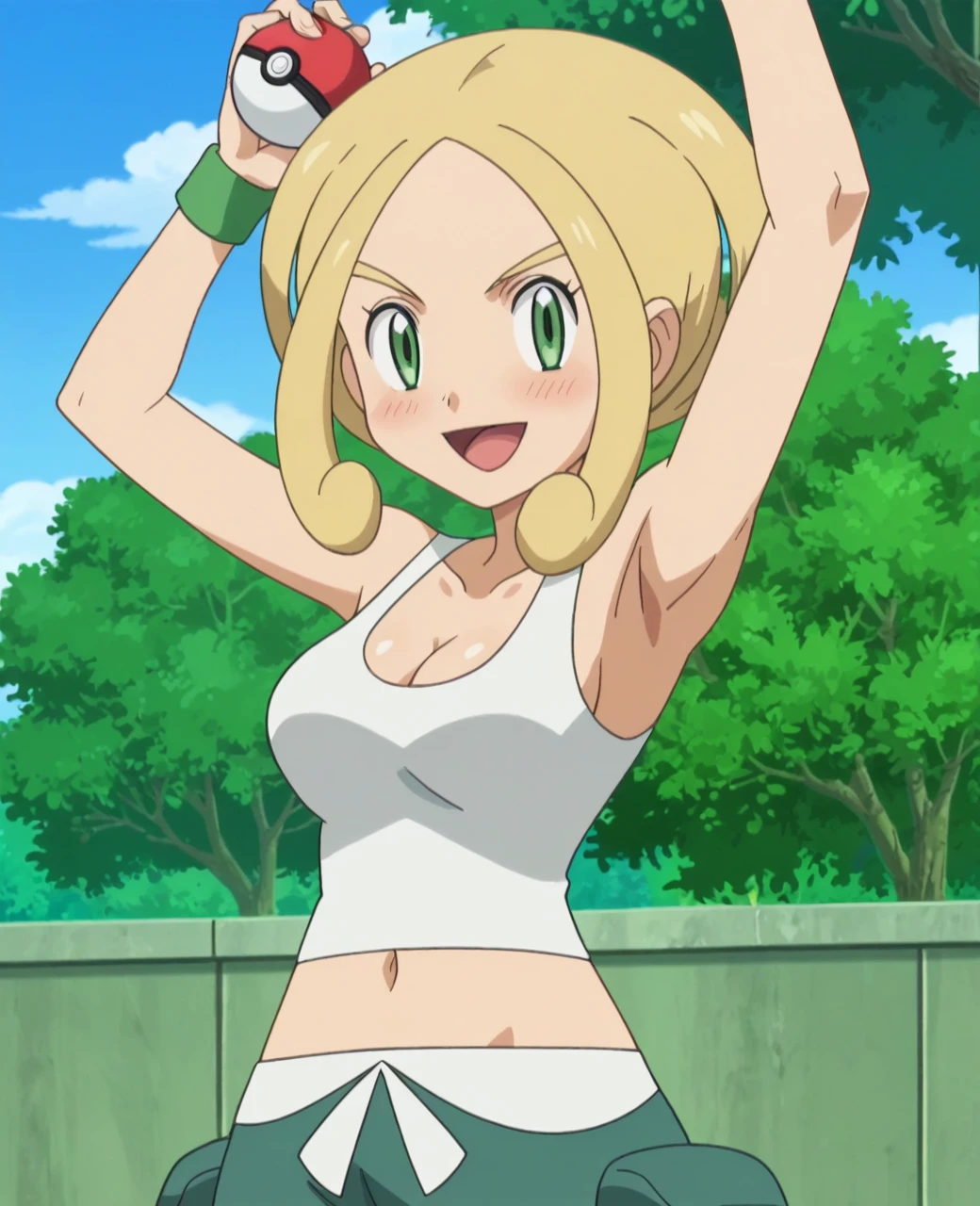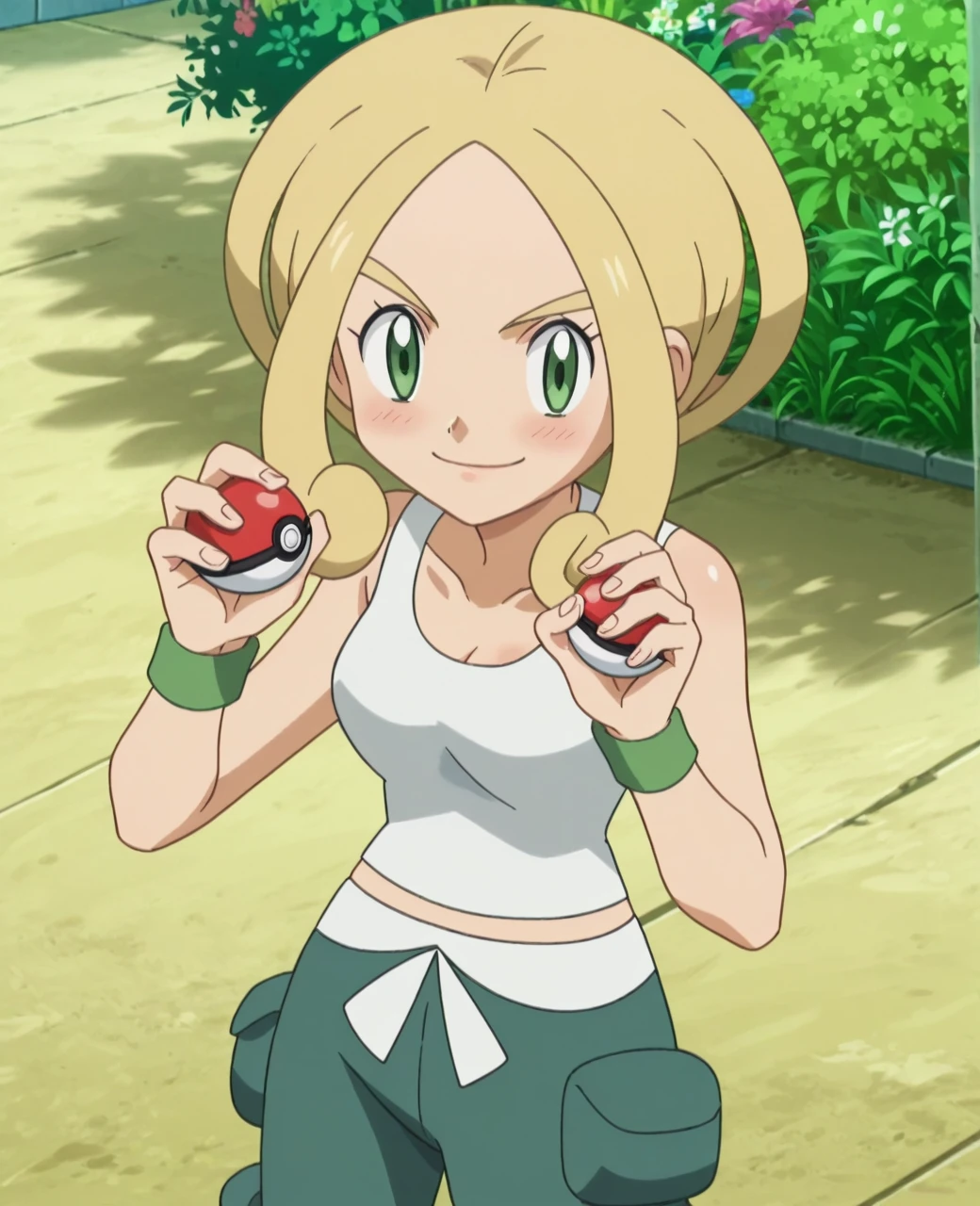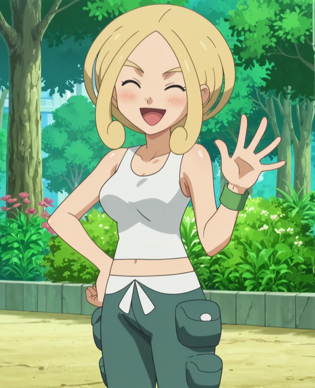 Trigger Words: violadef, 1girl, solo, blonde hair, green eyes, crop top, capri pants,
