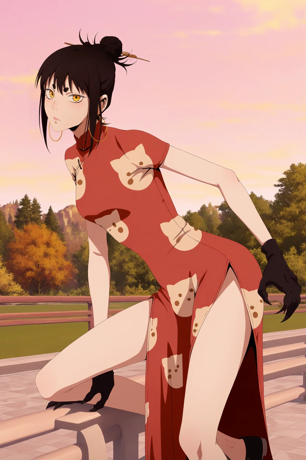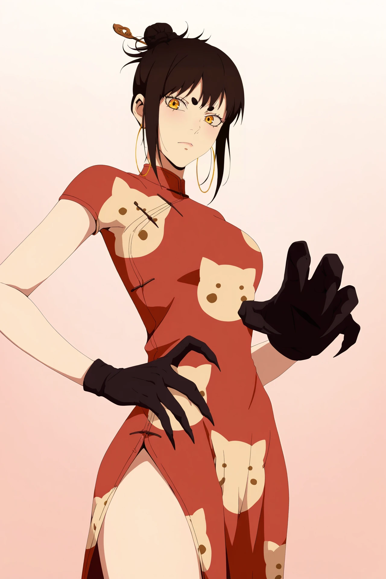china dress,cheongsam,red cheongsam,animal print,cat print,black claw gloves,side slit,black shoes