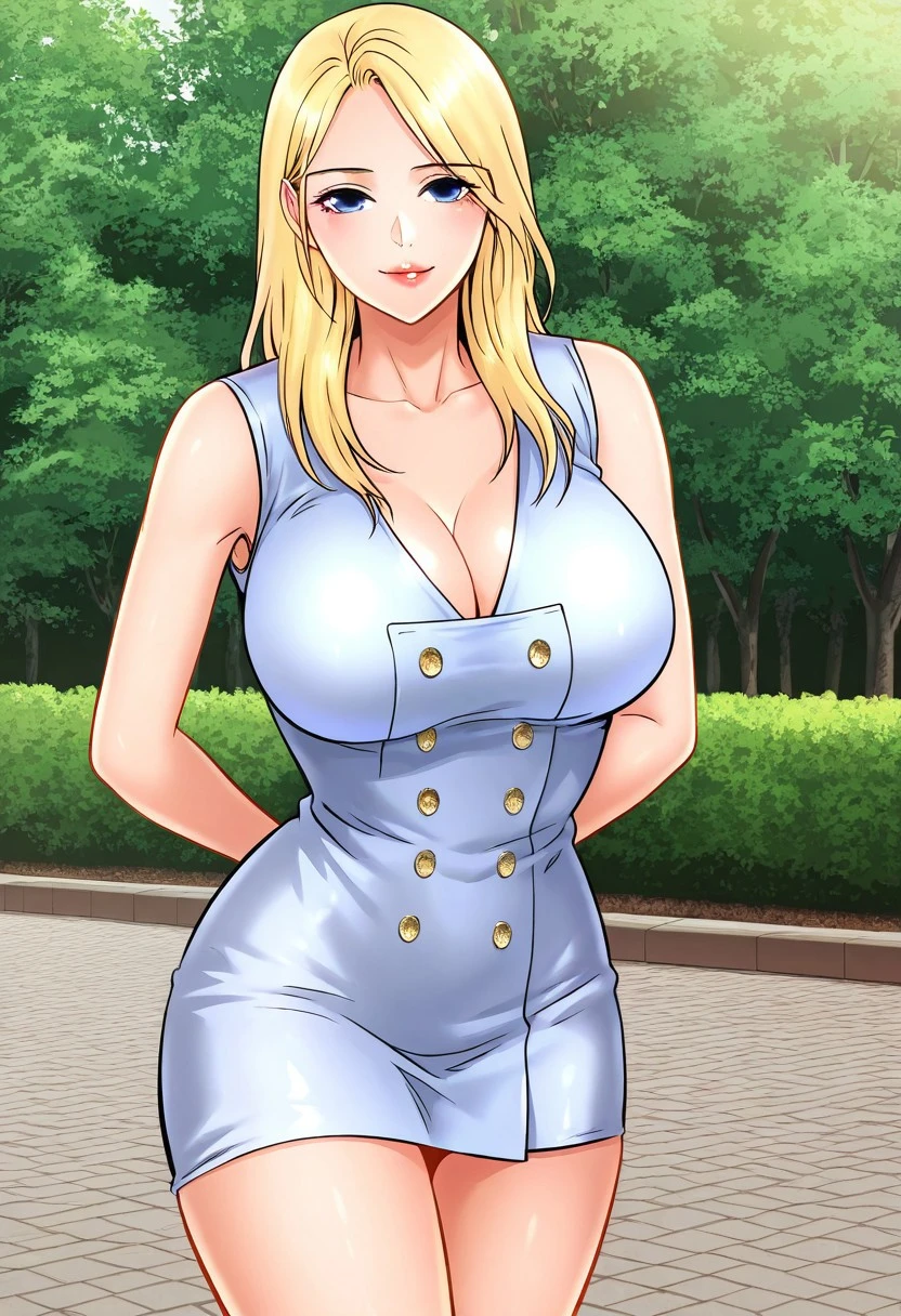 1. ((sexy sleeveless blue dress with gold buttons, obscene cleavage, huge cleavage, sexy pink thong, ))