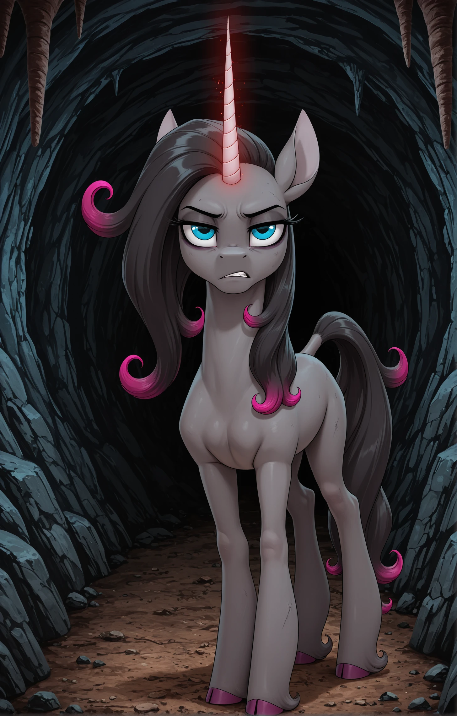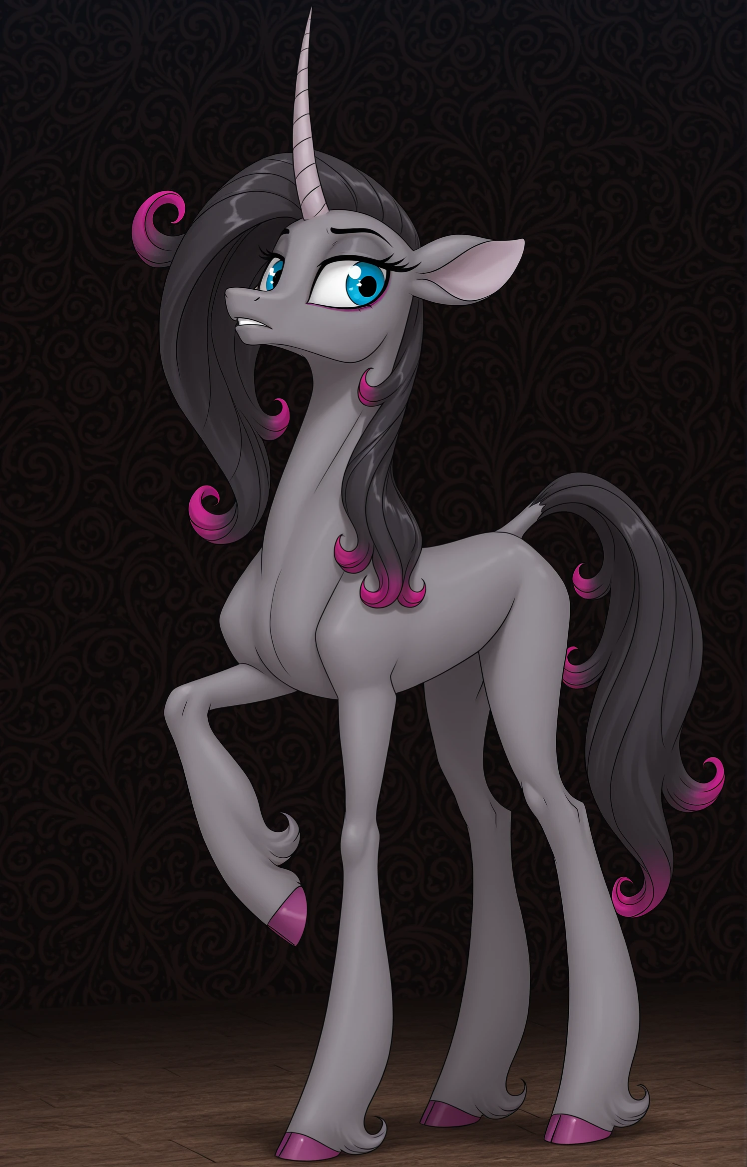 classic unicorn with a dark gray body. The mane and tail are long and dark, with tips hanging down to one side. The horn is classically shaped, the eyes are bright blue, and the legs are long., dw223J Oleander TFH