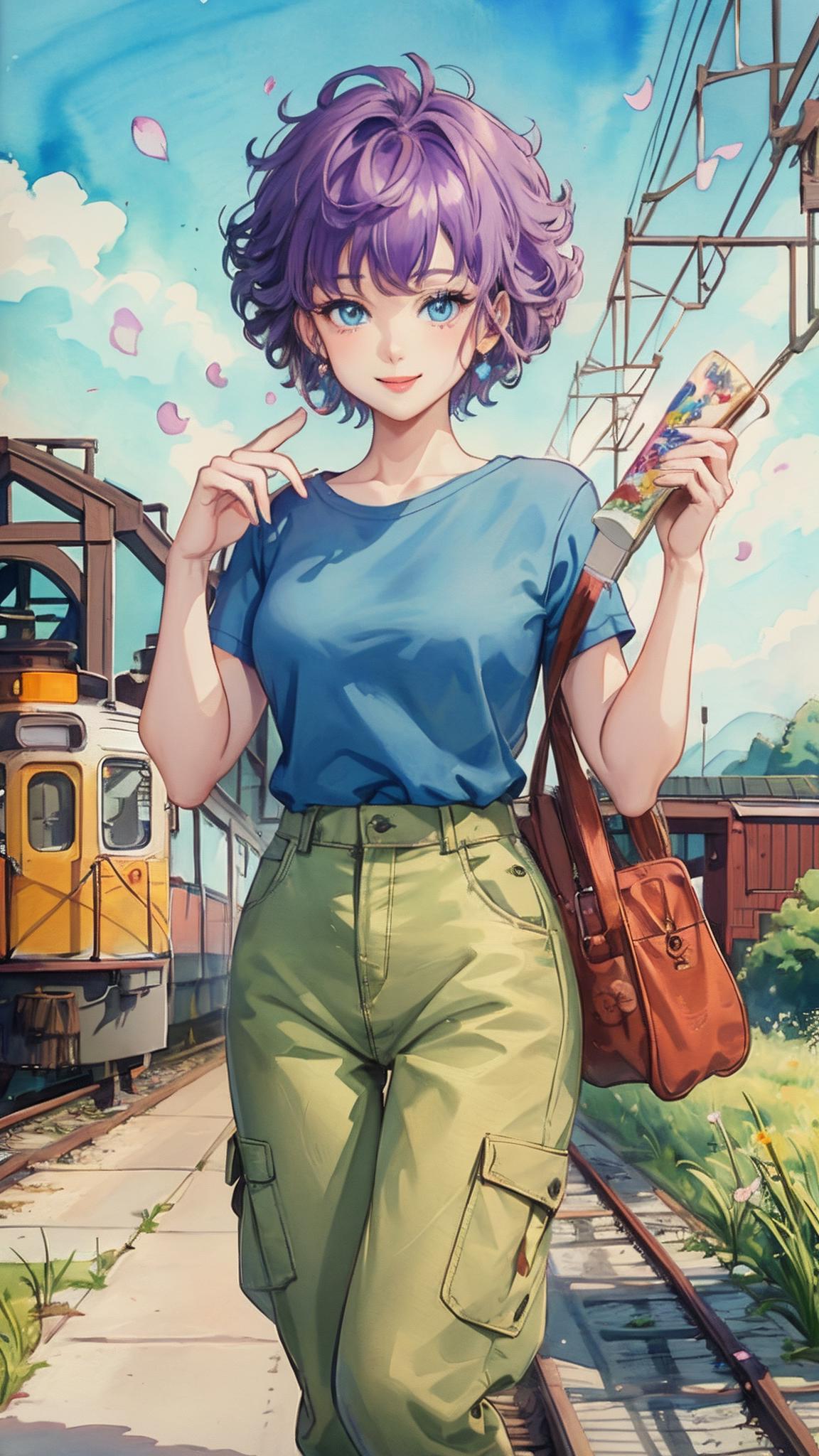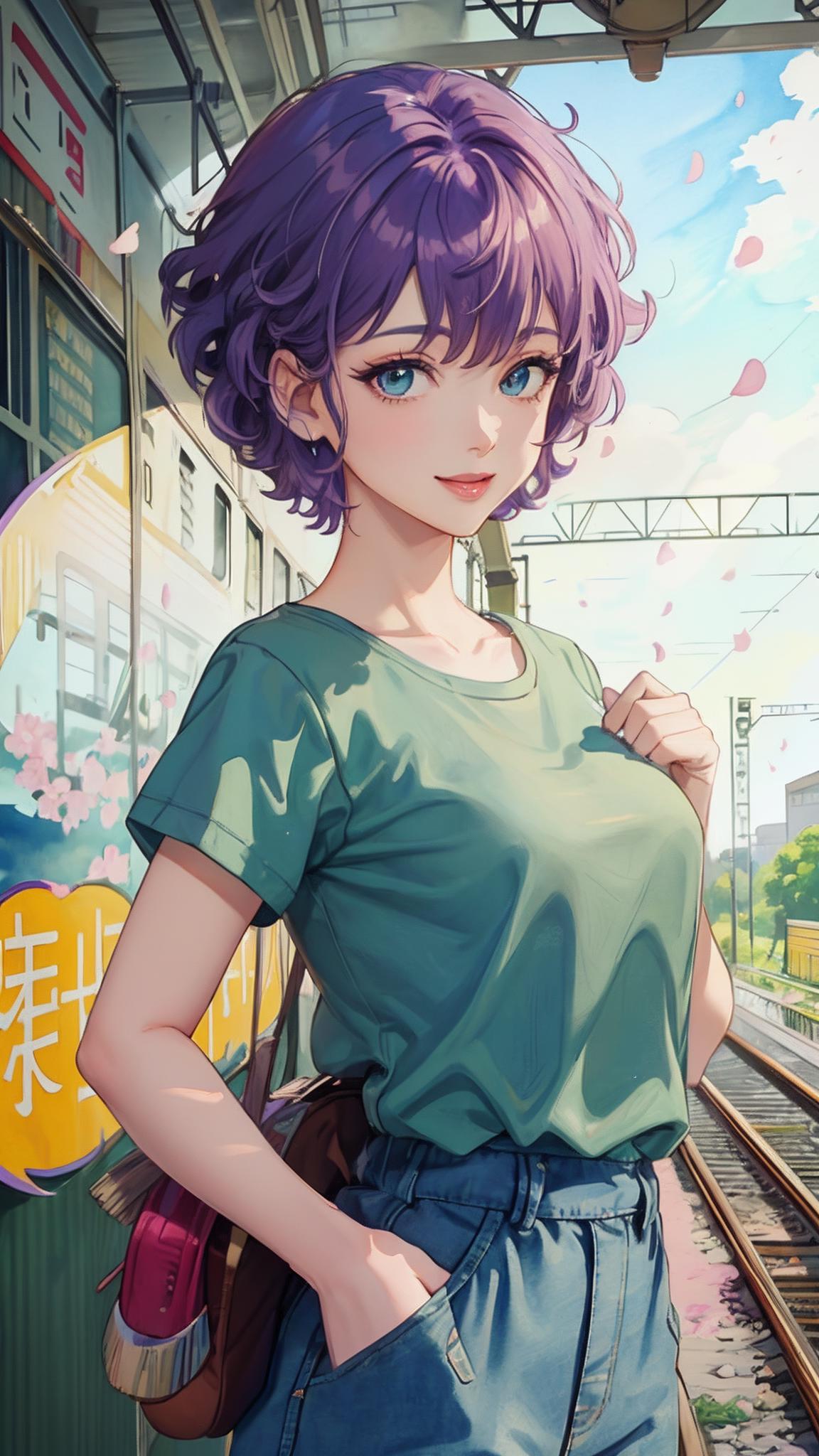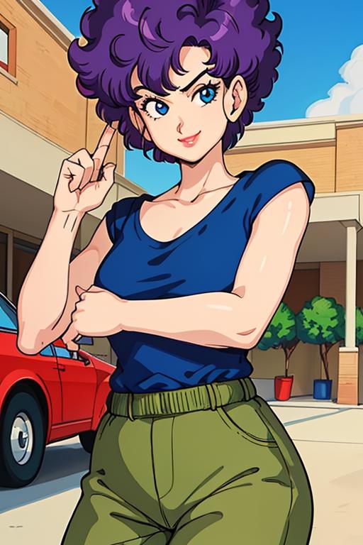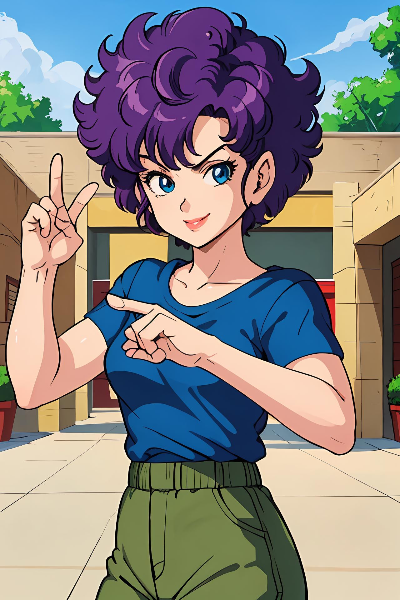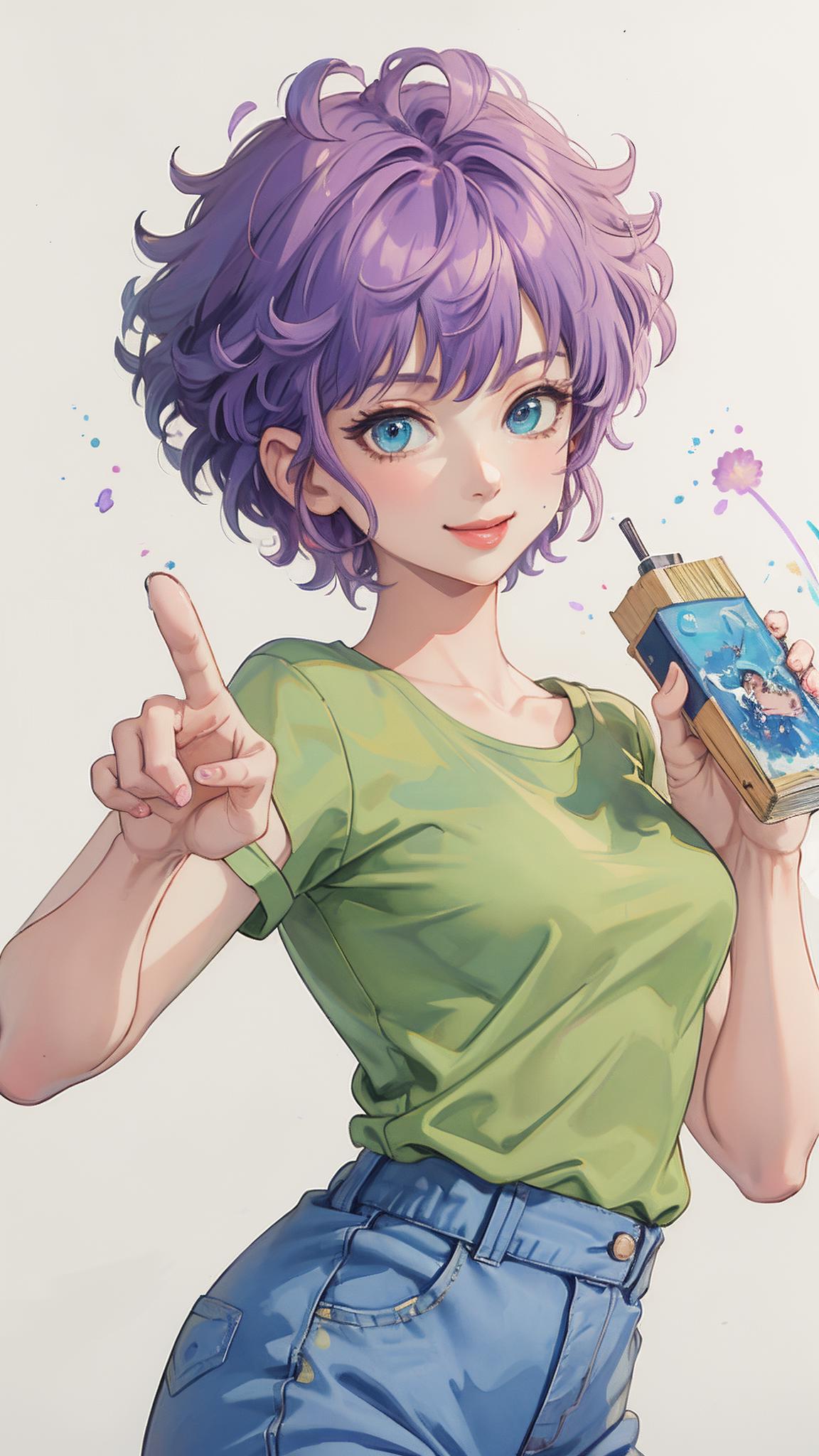 rfandball-smf, 1girl, purple hair, short hair, blue eyes, curly hair, makeup, lipstick, lips, (blue shirt:1.3), (green pants:1.2)