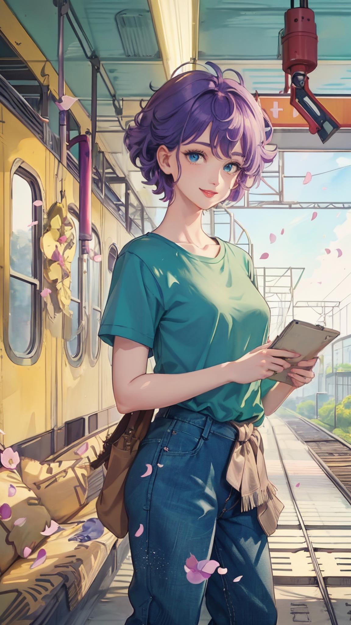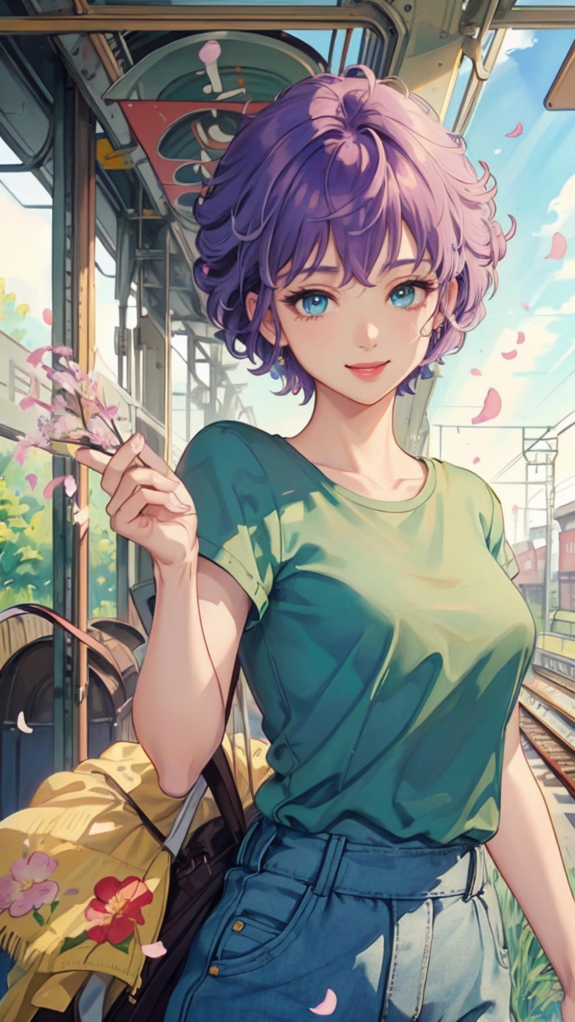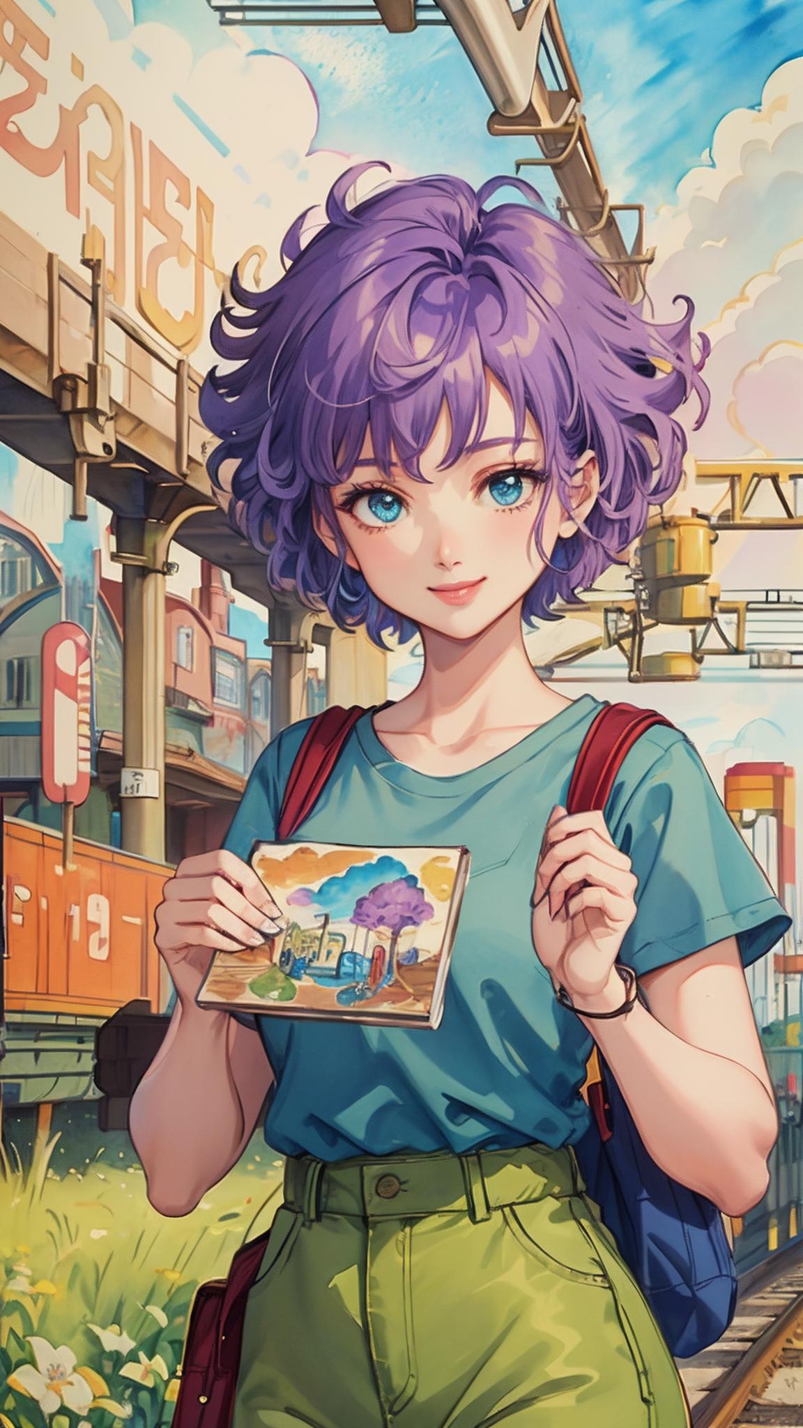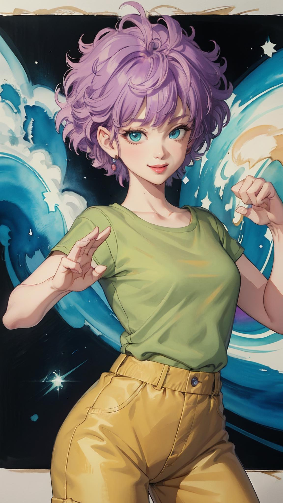rfandball-smf, 1girl, purple hair, short hair, blue eyes, curly hair, makeup, lipstick, lips, (blue shirt:1.3), (green pants:1.2)