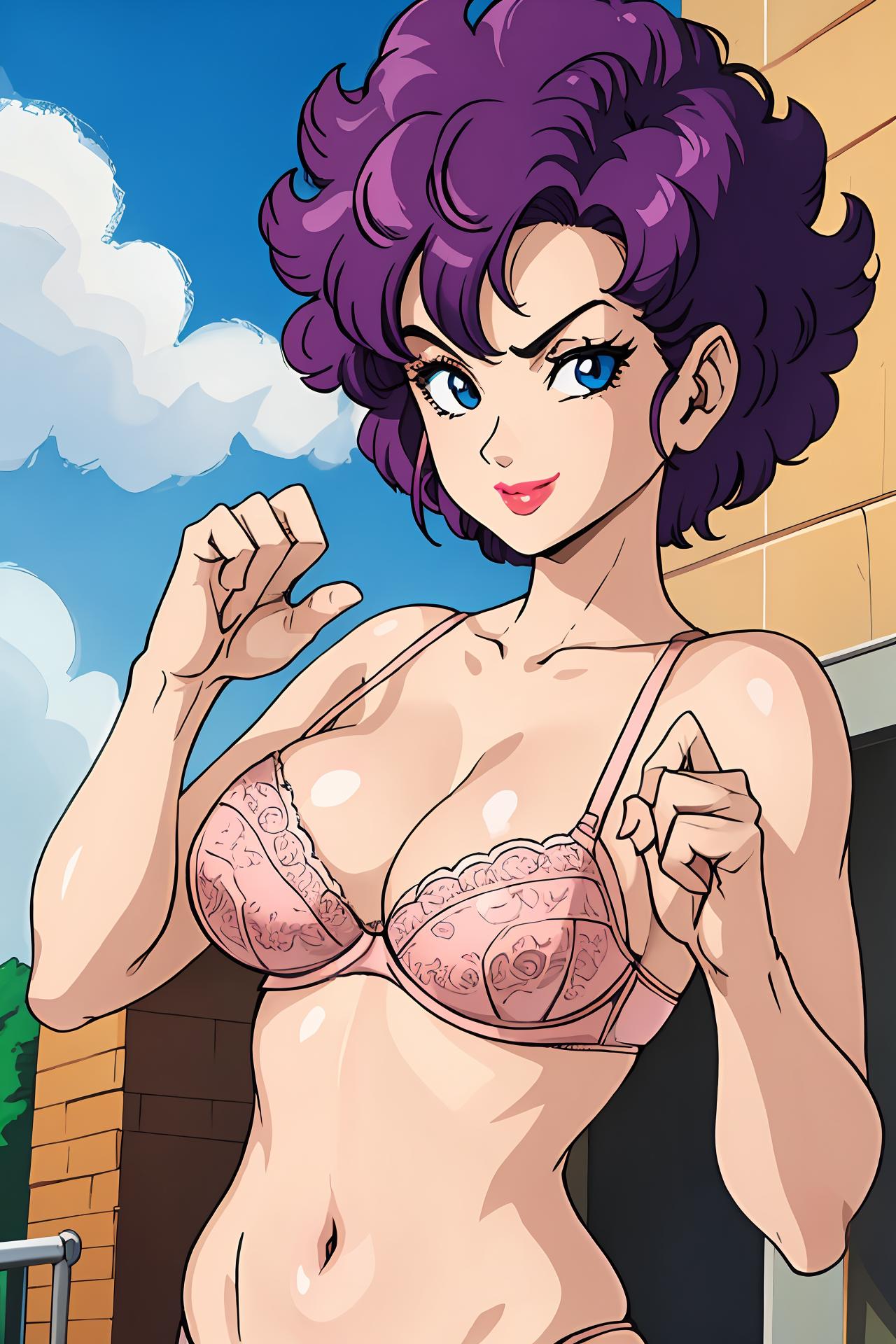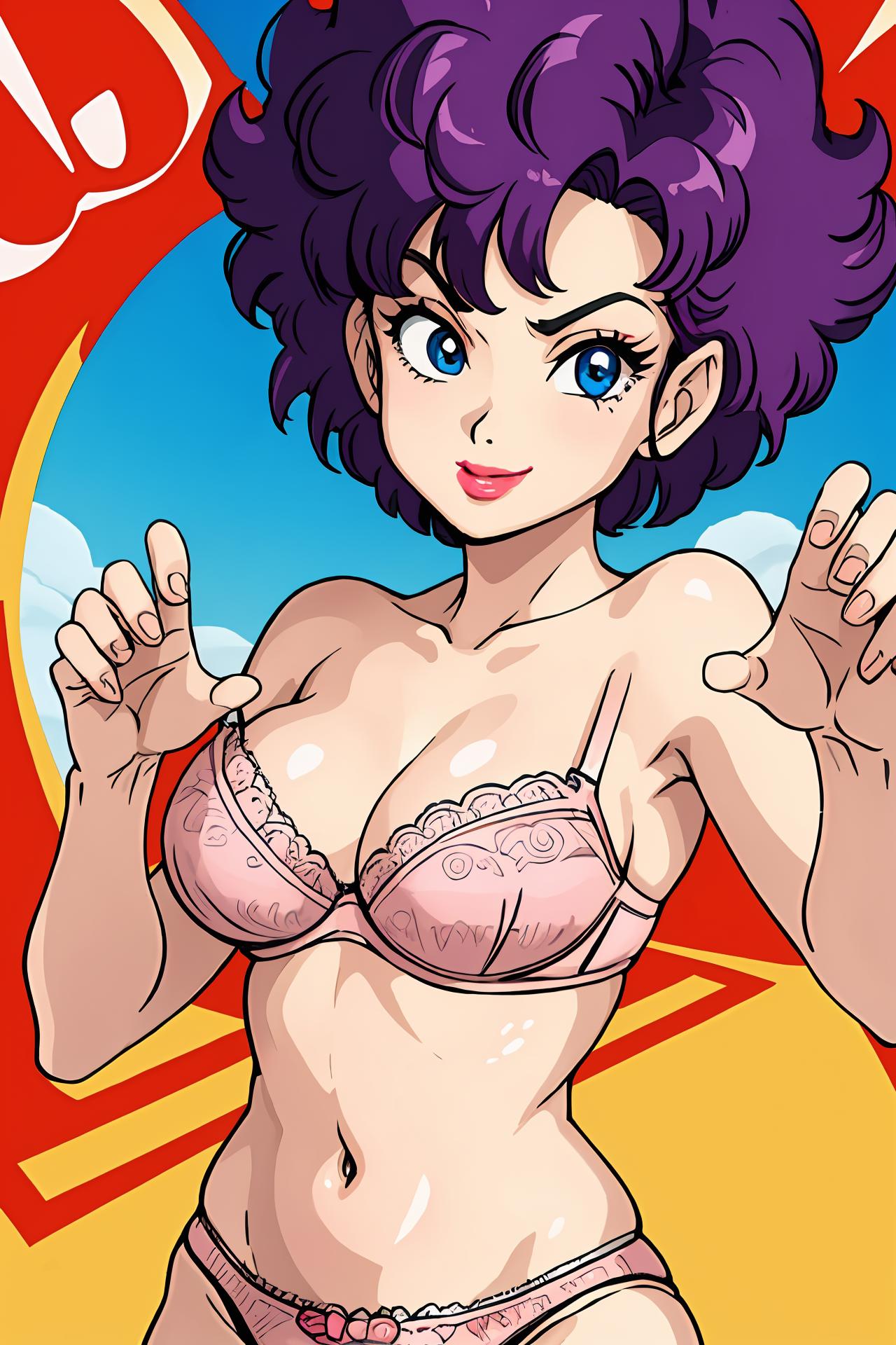 rfandball-smf, 1girl, purple hair, short hair, blue eyes, curly hair, medium breasts, makeup, lipstick, lips, underwear, bra, navel, cleavage, pink bra, underwear only, pink lips, pink panties