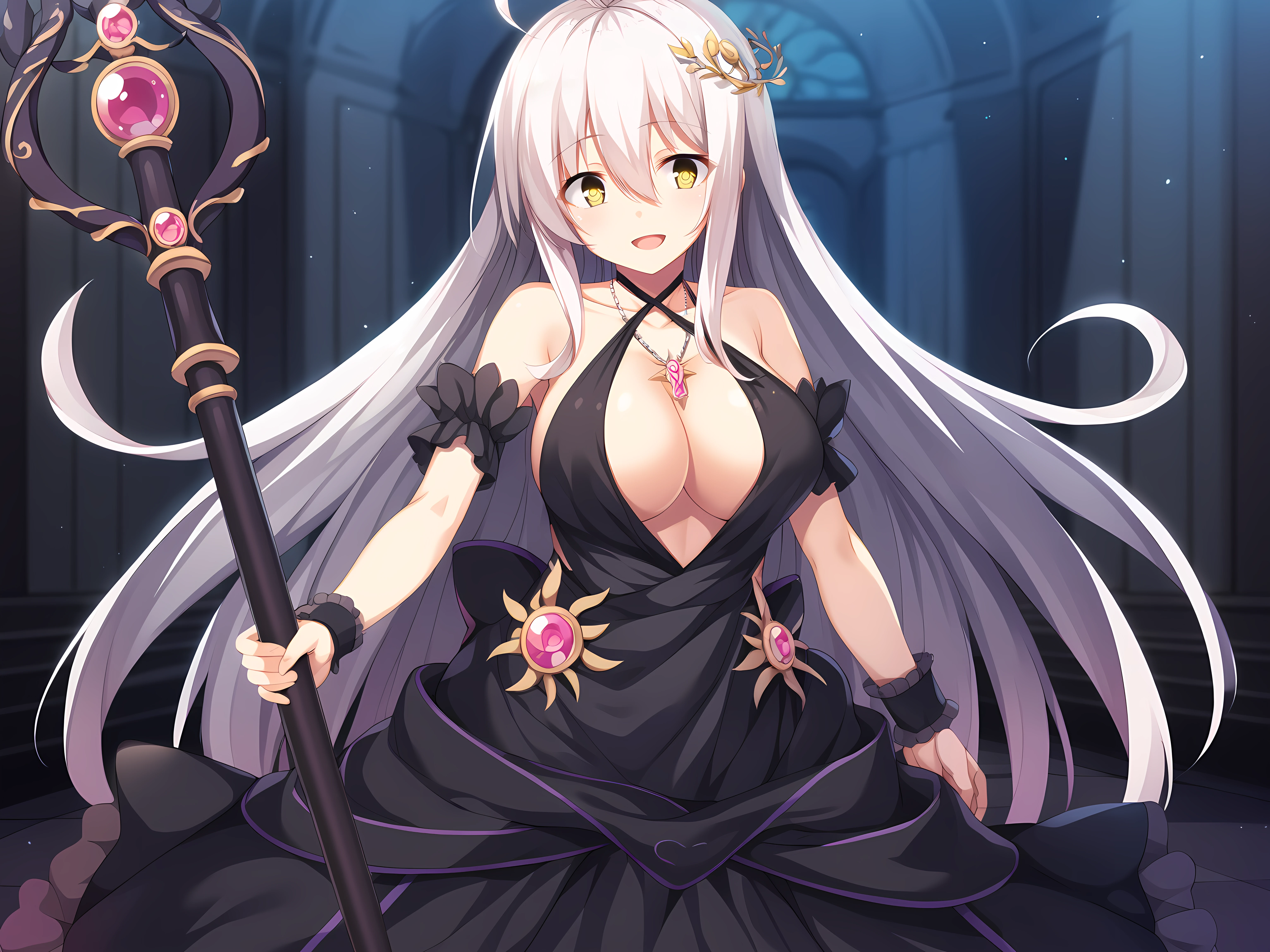 escude, fein, 1girl, breasts, staff, solo, long hair, yellow eyes, dress, black dress, large breasts, open mouth, ahoge, cleavage, very long hair, hair between eyes, jewelry, collarbone, bare shoulders, smile, clothing cutout, bangs, standing, wrist cuffs, halterneck, necklace, white hair, corruption, dark persona