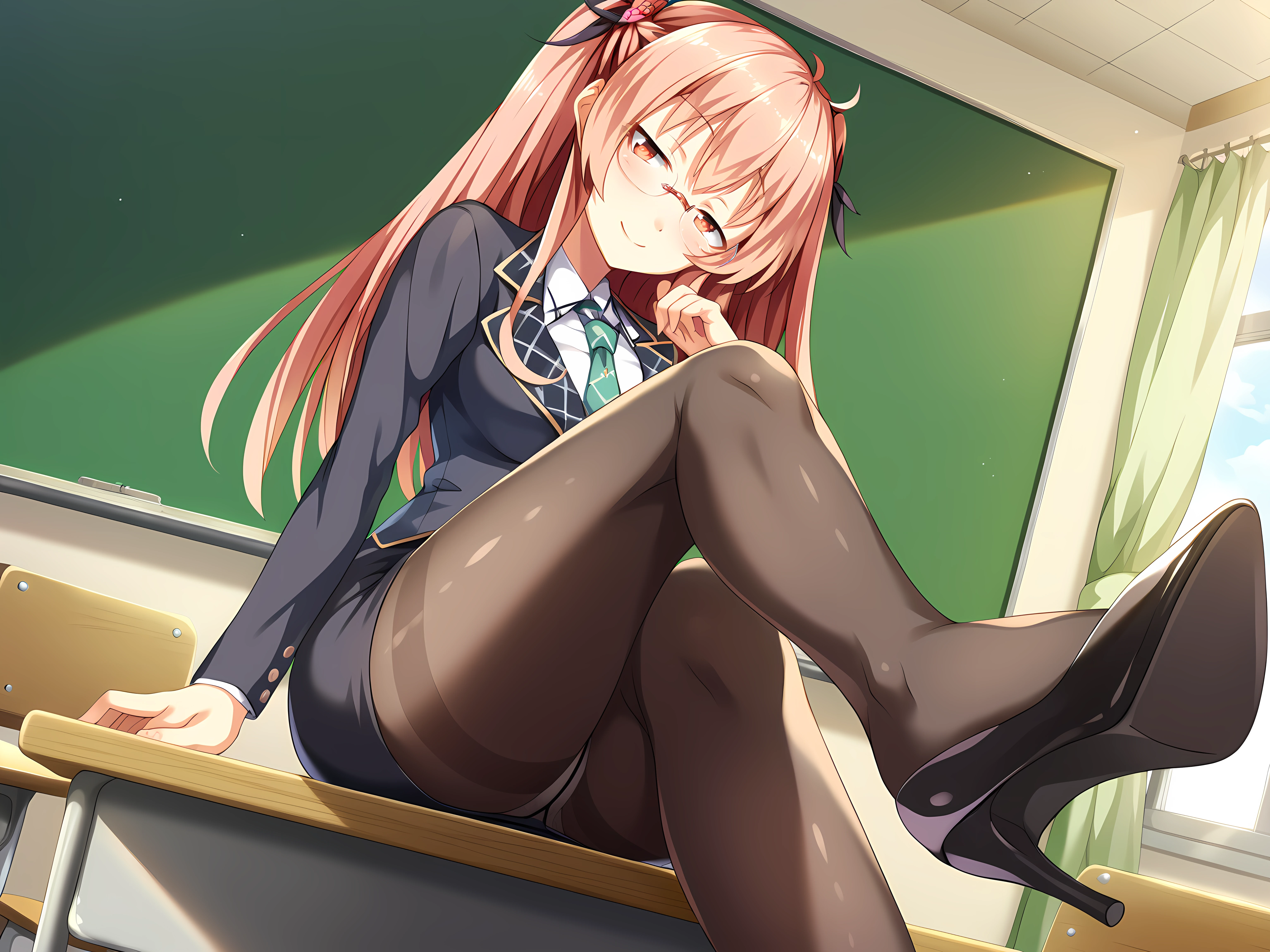 escude, fein, 1girl, solo, low ponytail, pantyhose, skirt, brown hair, long hair, glasses, pencil skirt, office lady, jacket, green eyes, breasts, smile, shirt, formal, suit, white shirt, black pantyhose, black footwear, standing, high heels, black jacket, long sleeves, black skirt, skirt suit, dress shirt,