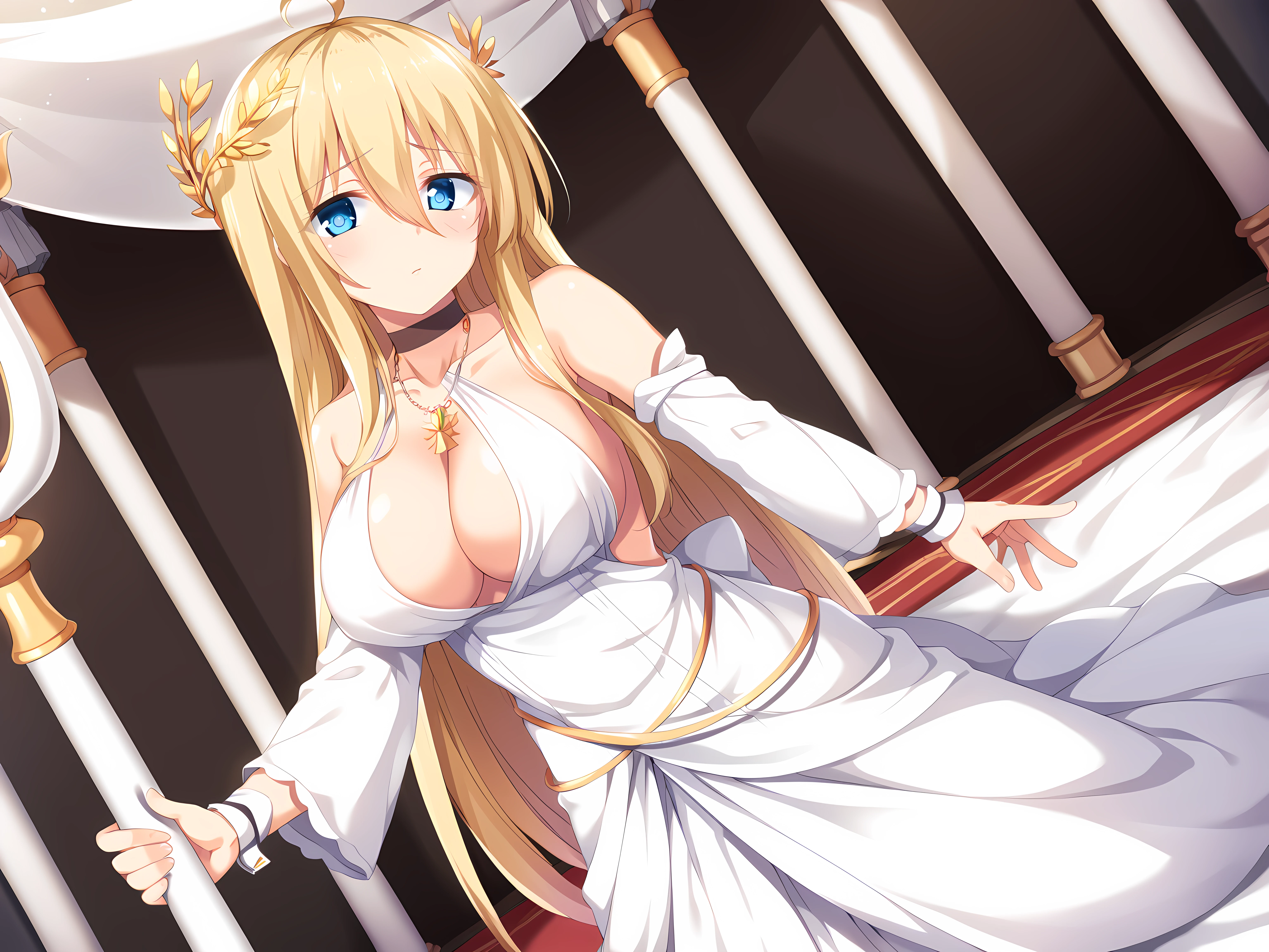 escude, fein, 1girl, breasts, staff, solo, blue eyes, long hair, blonde hair, dress, large breasts, holding, ahoge, white dress, very long hair, cleavage, hair between eyes, bare shoulders, wrist cuffs, standing, bangs, jewelry, collarbone, choker, necklace, laurel crown, blush, detached sleeves, halterneck