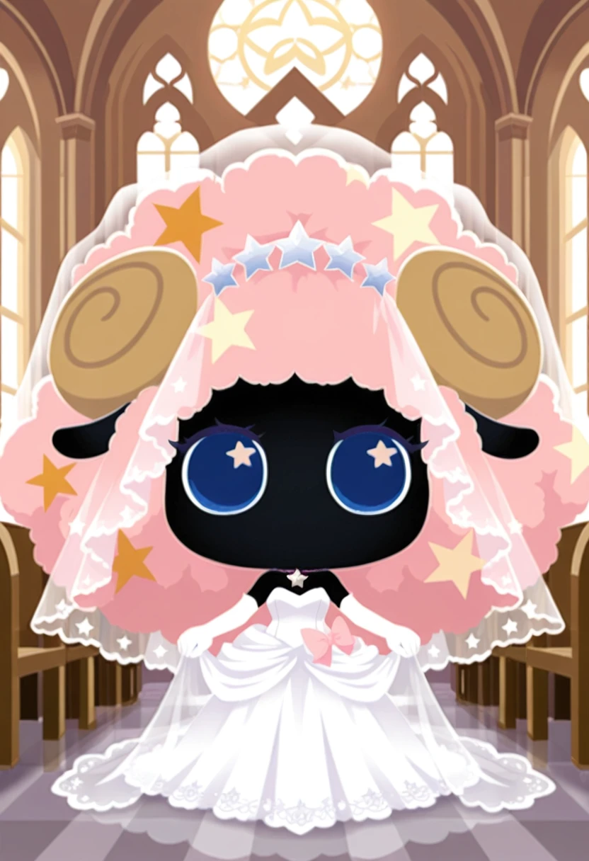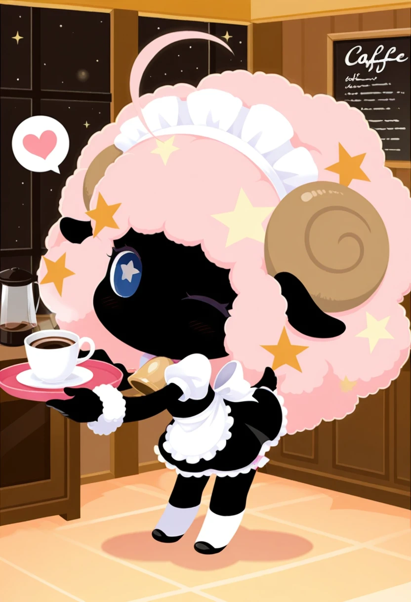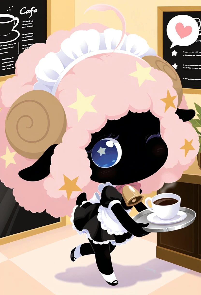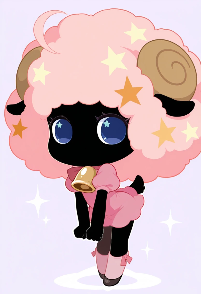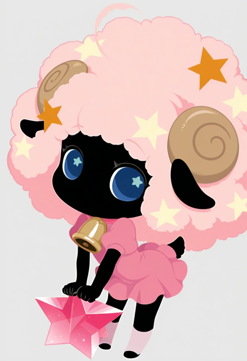 Prompts: moa, pink dress, puffy shoulders, star hair accessory, chibi, sheep tail, afro, no mouth,