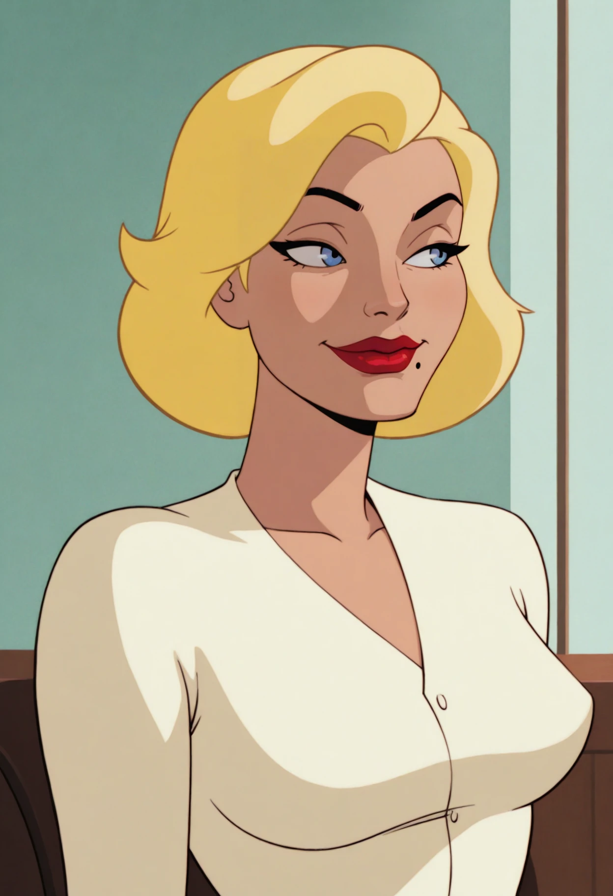 1girl, solo, blue eyes, blonde hair, short hair, mole, mole under mouth, breasts, medium breasts, lipstick, red lips,