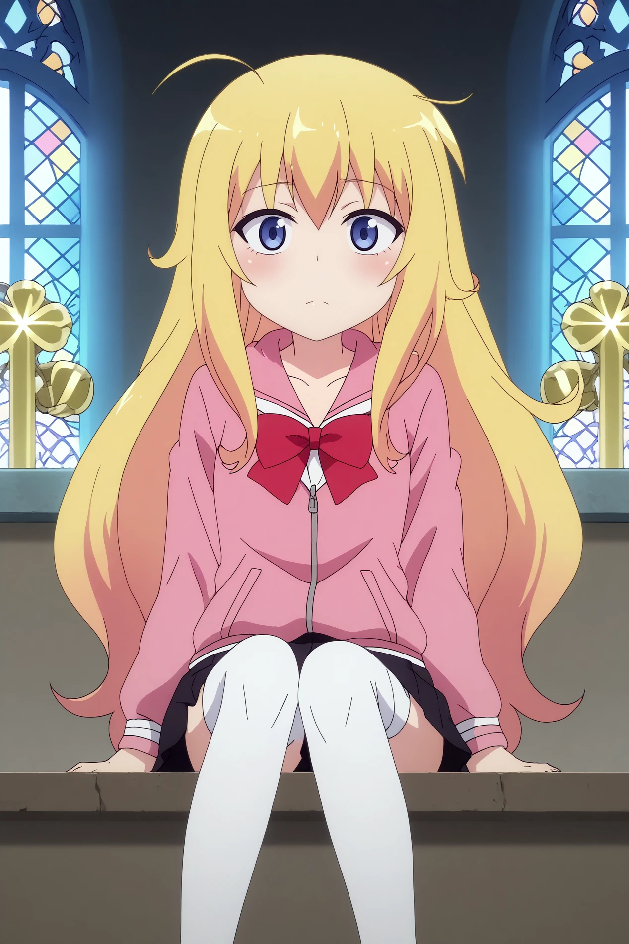 Triggers : gabriel white tenma,1girl,solo,long hair,looking at viewer,school uniform,serafuku,purple eyes,skirt,white thighhighs,ahoge,jacket,bow,red bow,hood,messy hair