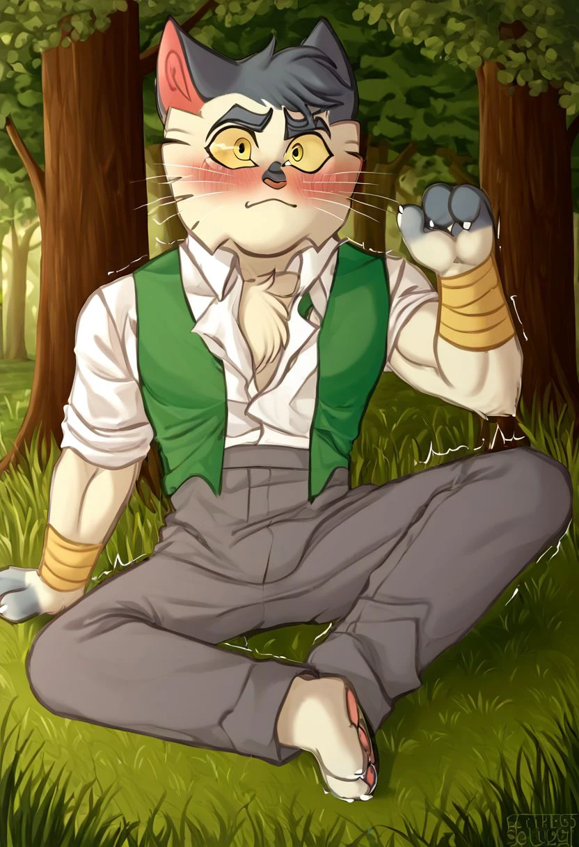 White body, white fur, grey hair, yellow eyes, pink nose, pink ears, red bandana, bandana, vest, white shirt, shirt, green vest, grey pants, grey trousers, trousers, pants,