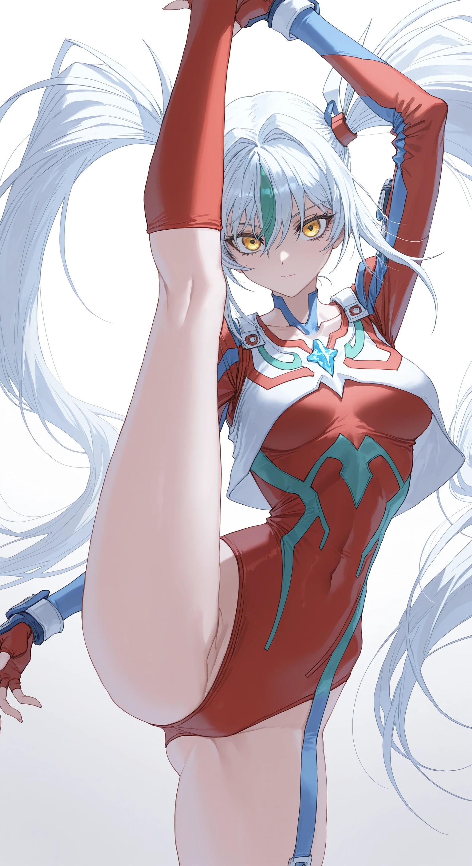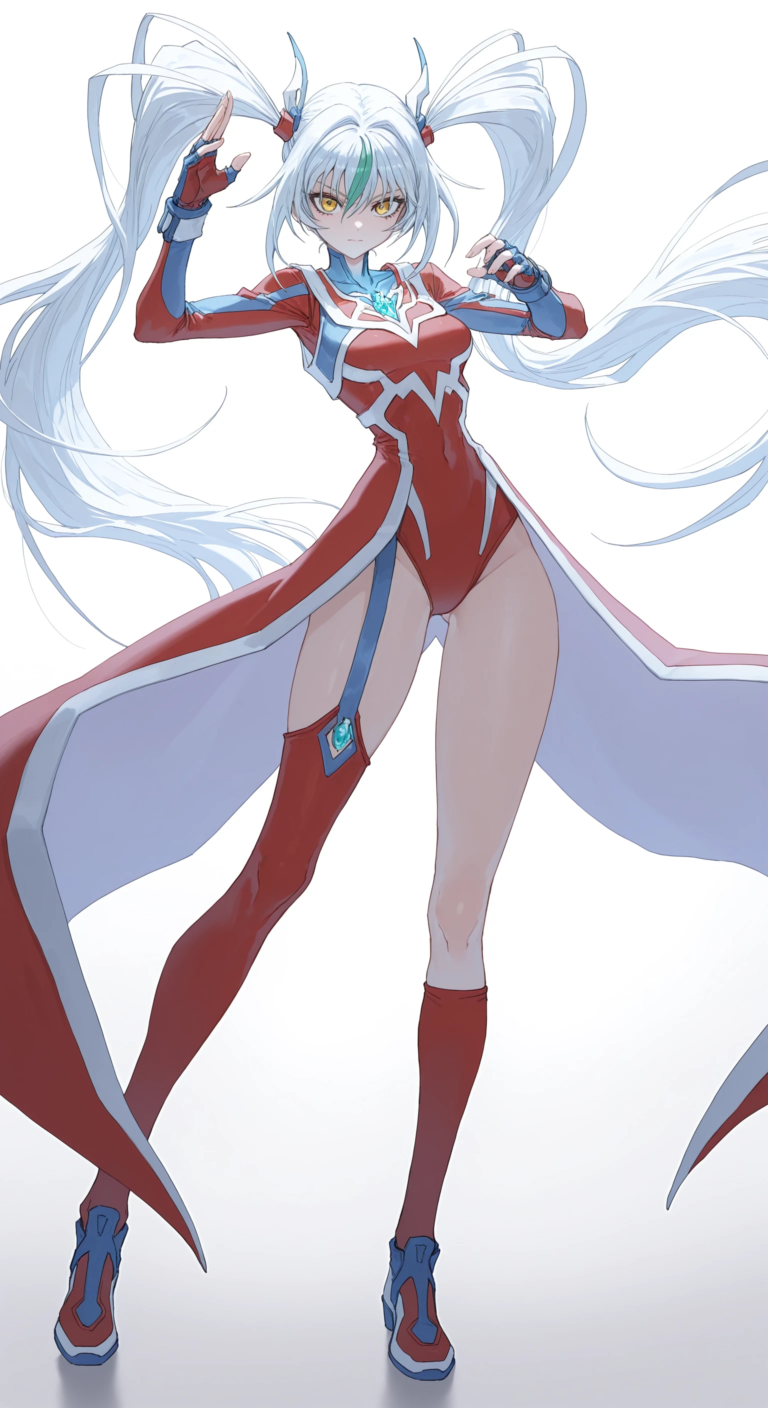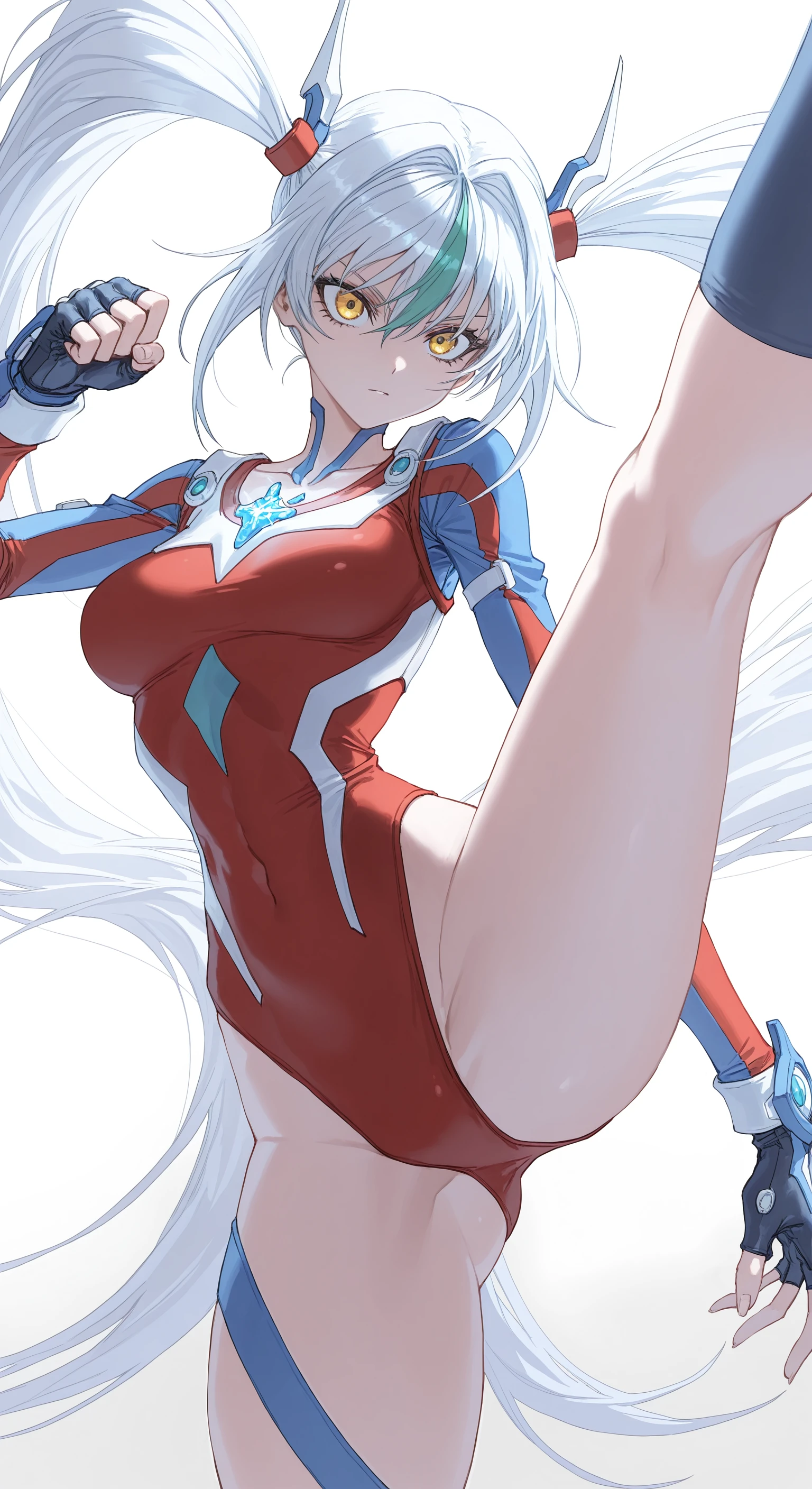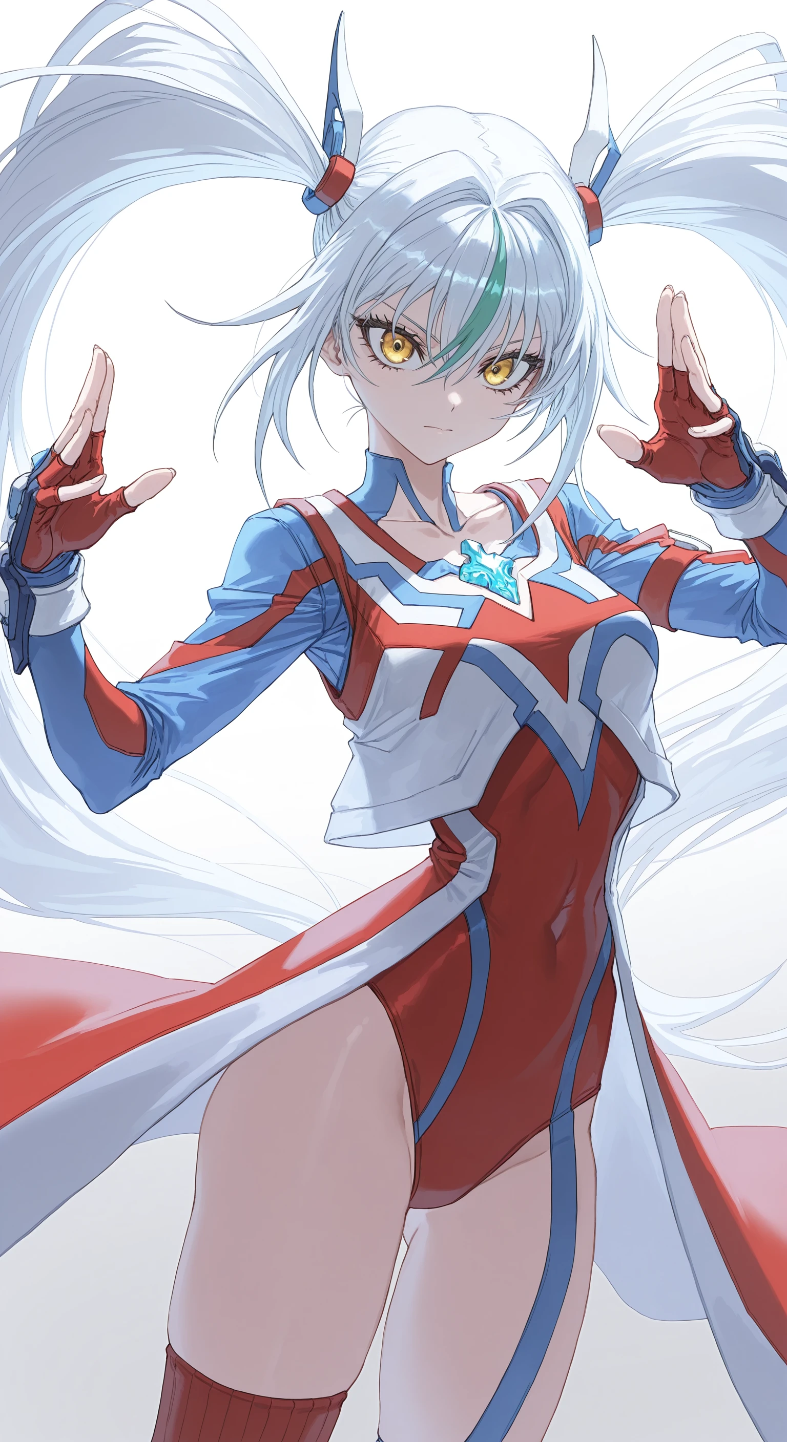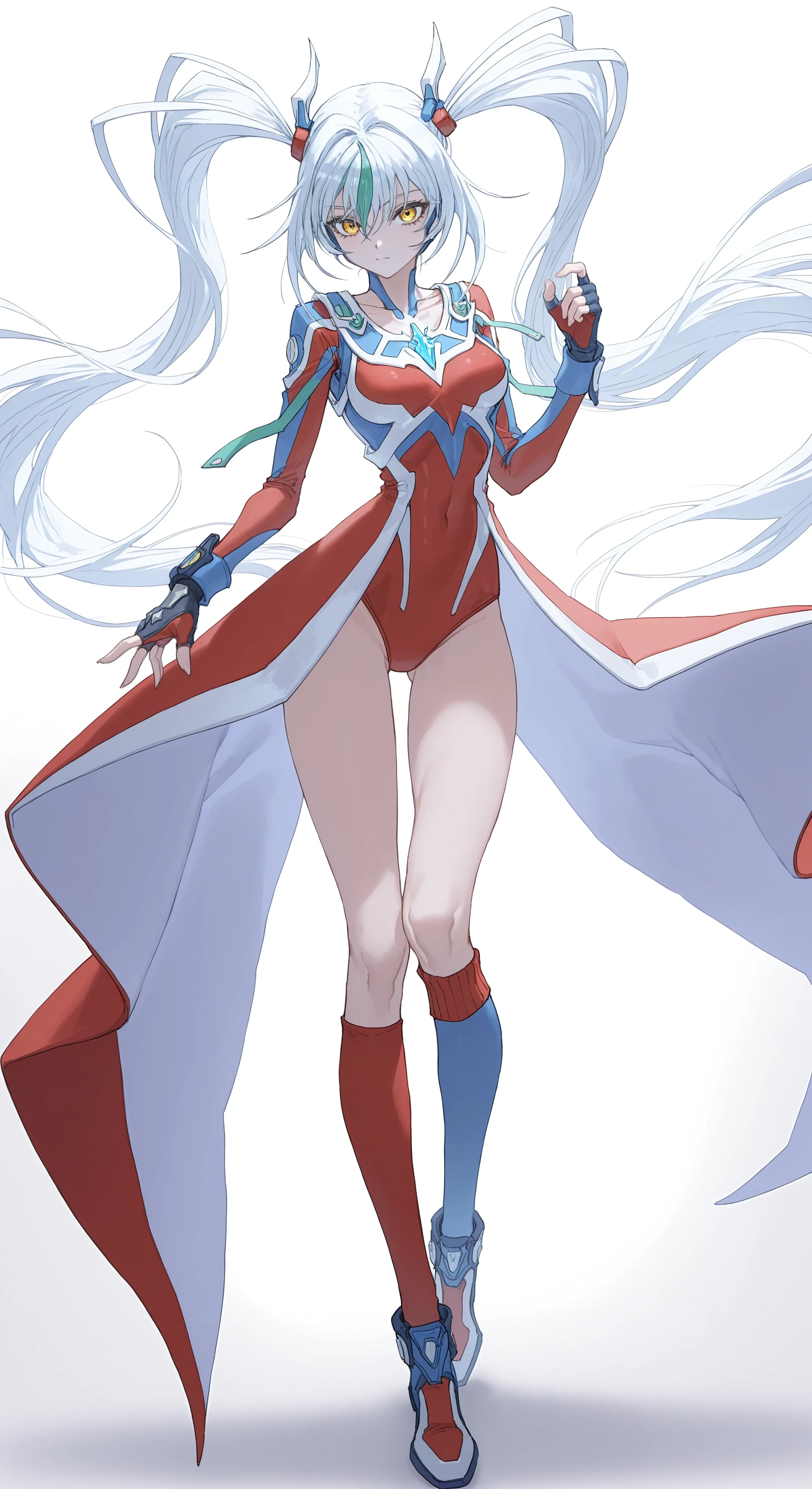 tag:1 Girl, white hair, yellow eyes, green highlights, double ponytail, tiara, chest jewel, one-piece swimsuit, group hem,fingerless gloves, asymmetric knee socks,