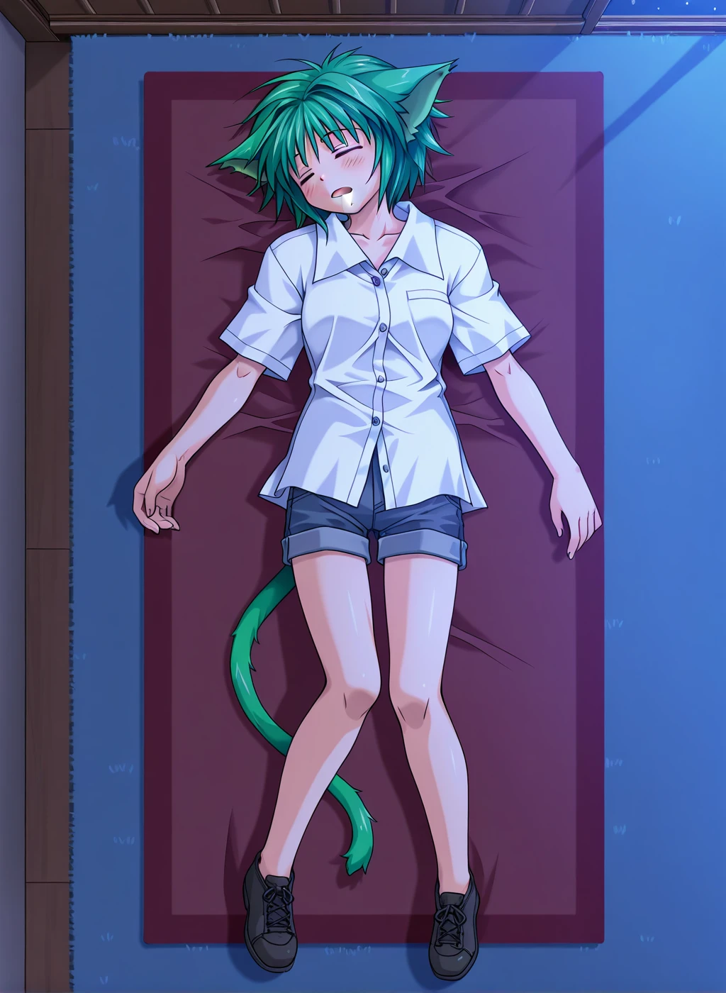denim shorts, white dress shirt,