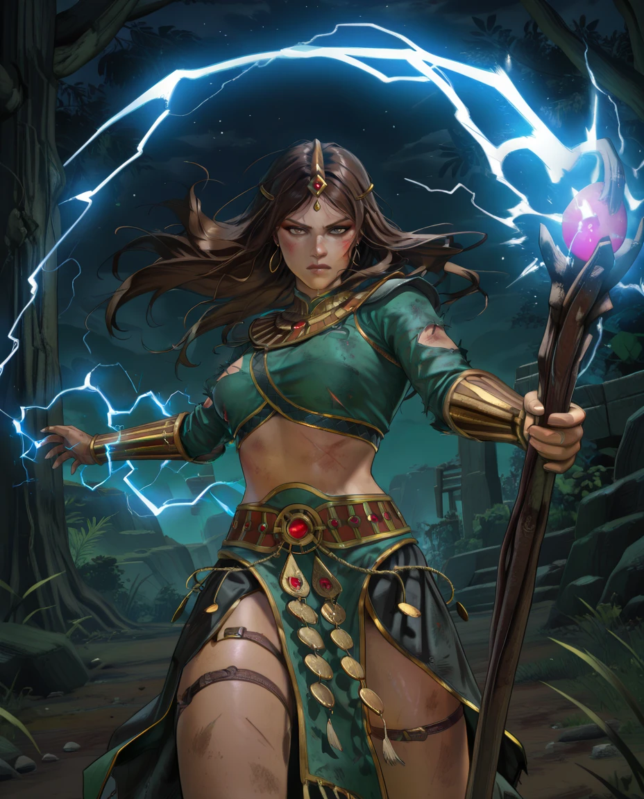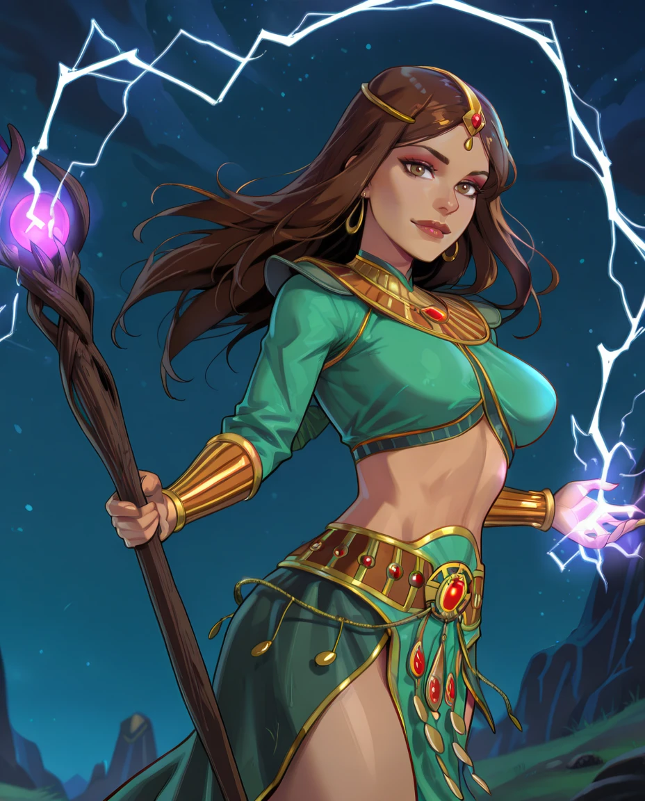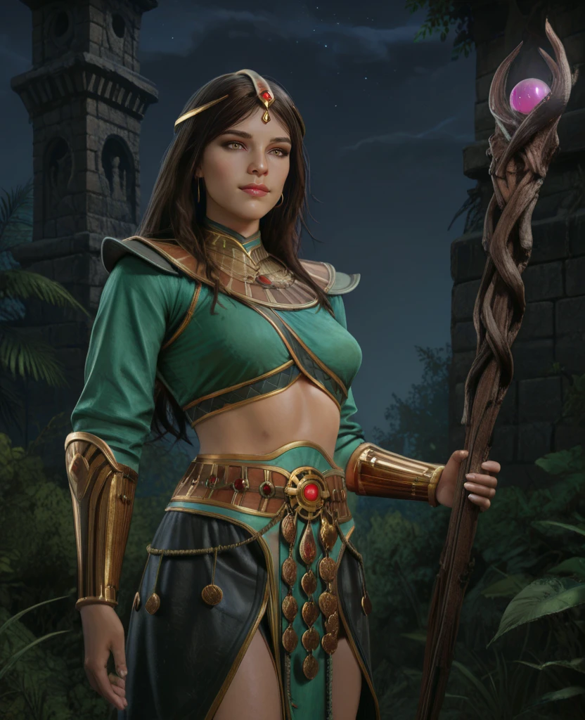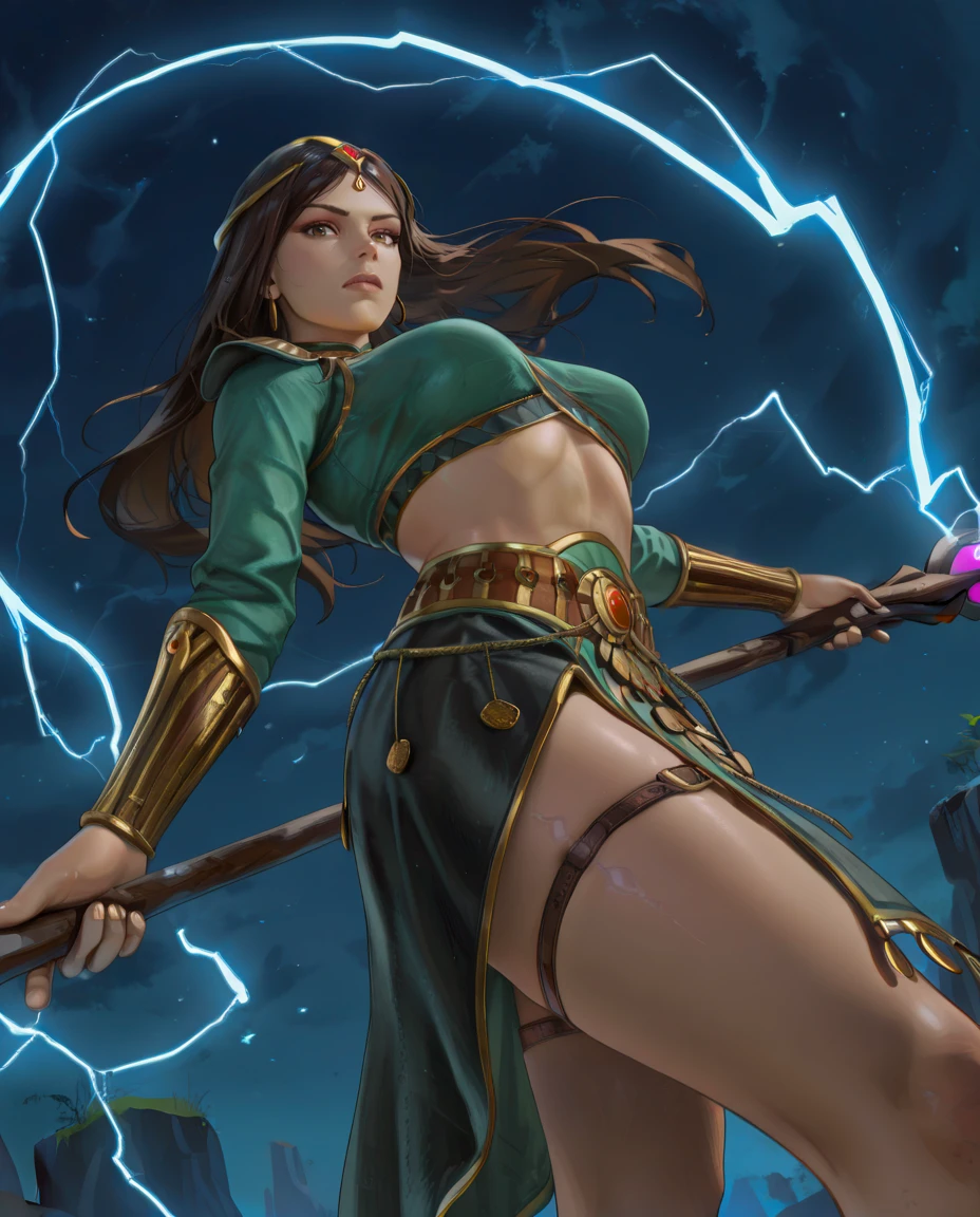 green top, or green dress, midriff, skirt, pelvic curtain, green shorts,  gold trim, jewelry, tiara,  thigh strap, long sleeves, bracers, single glove, finger ring,  boots,