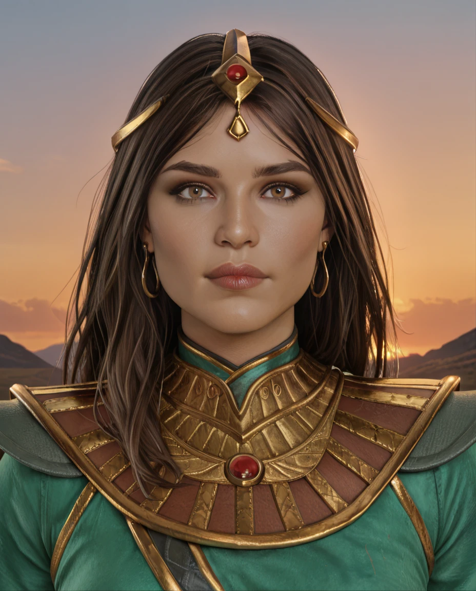 single earring, red armor, shoulder armor, or asymmetrical pauldrons, headband, bracers, skirt, boots, thigh strap,