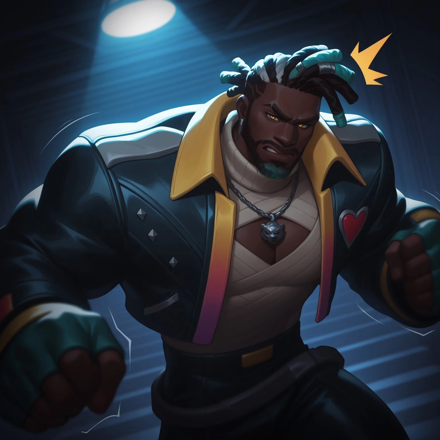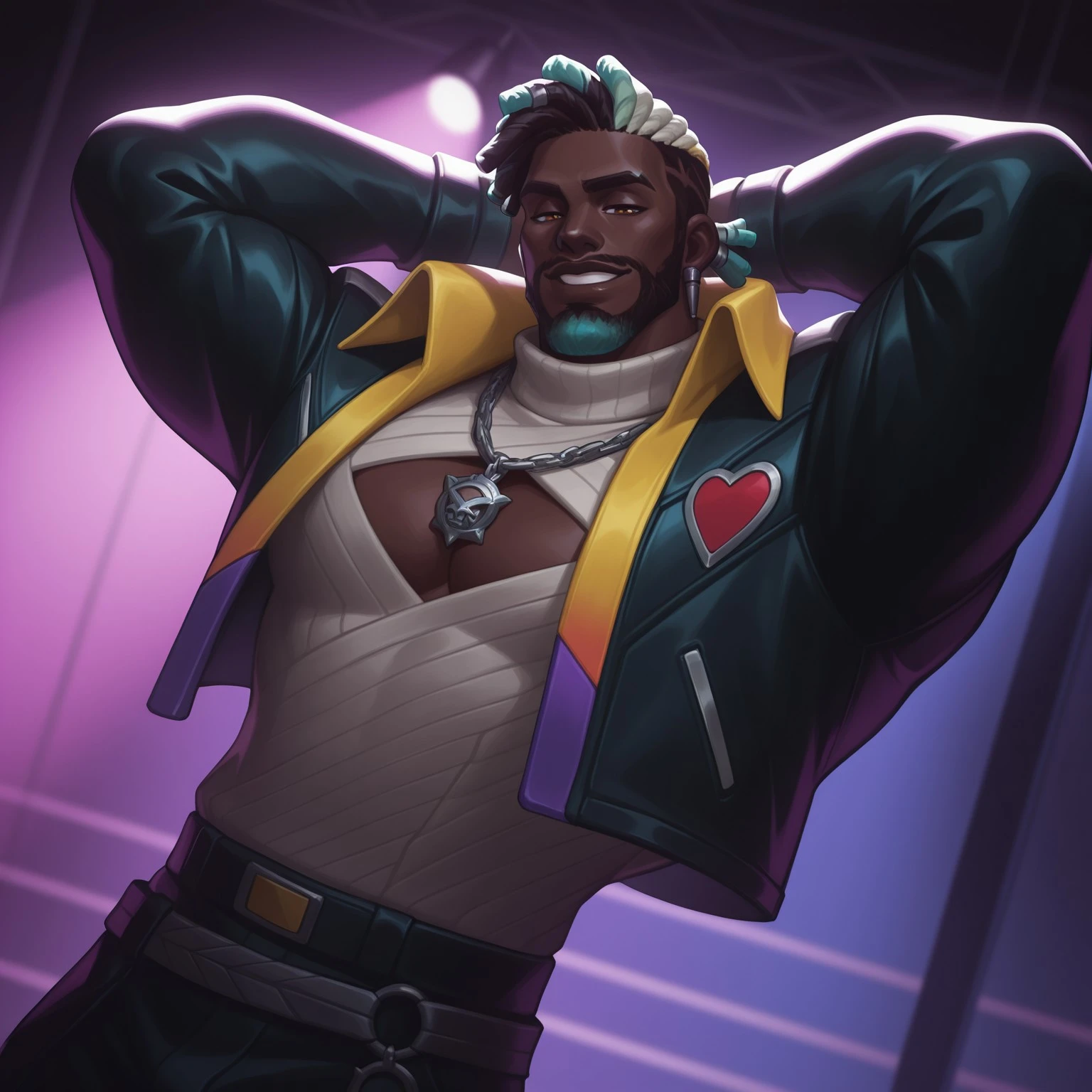 KSanteHS, Arcane style, muscular male, black skin, dreadlocks, multicolored hair, facial hair, lion necklace, white turtleneck, cleavage, leather jacket, leather pants,