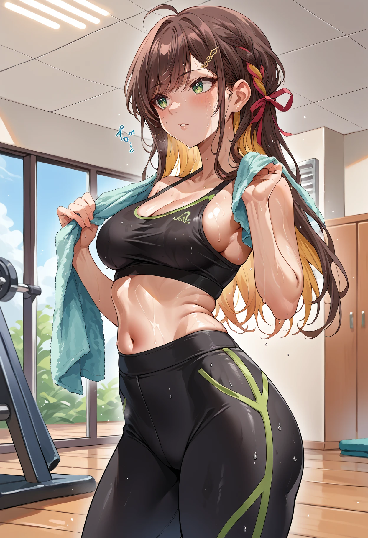 MioriComfy, sidelocks, single hair bun, musical note hair ornament, white sports bra, clothes writing, dolphin shorts, black shortsLet me know if you have any issues.