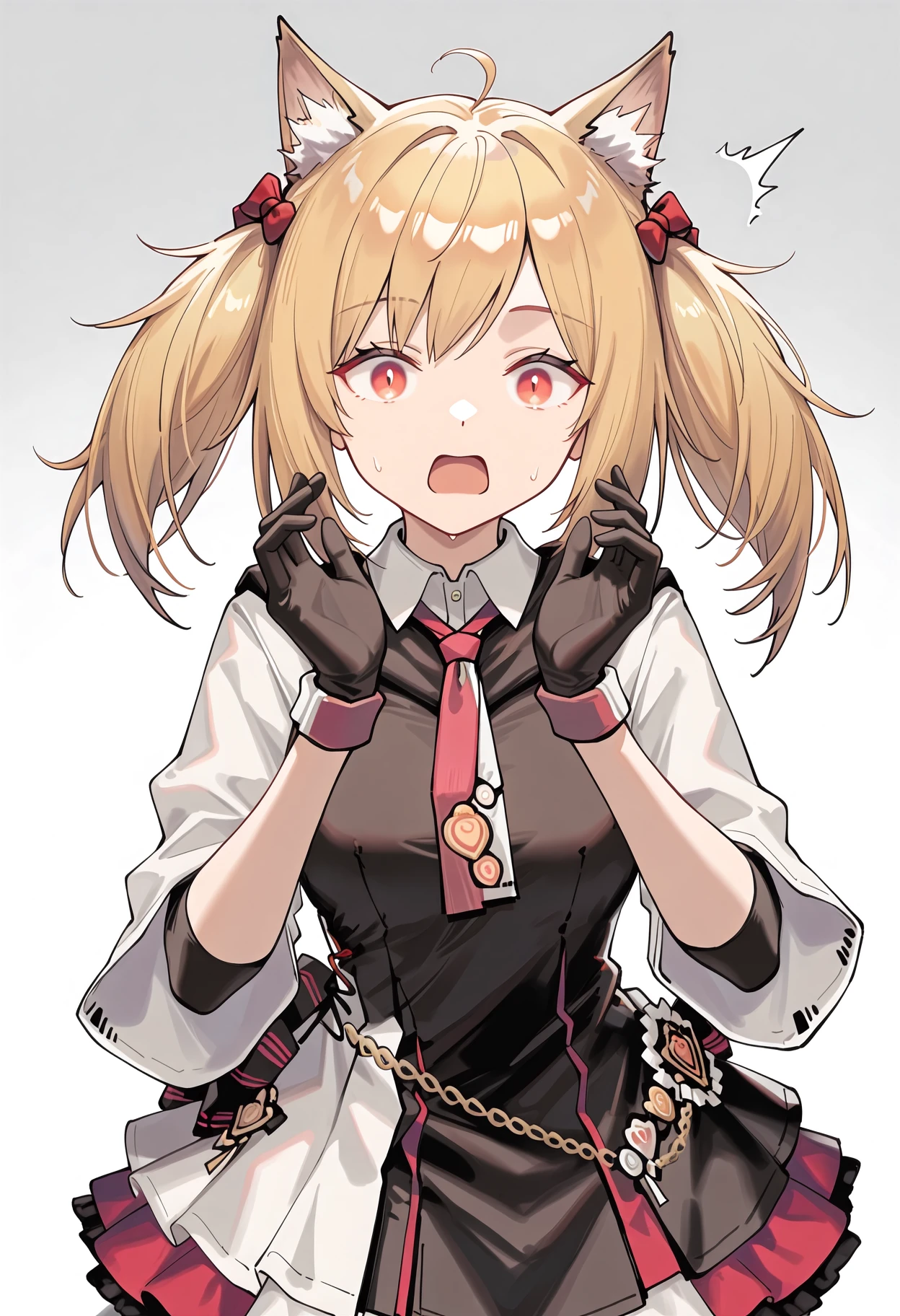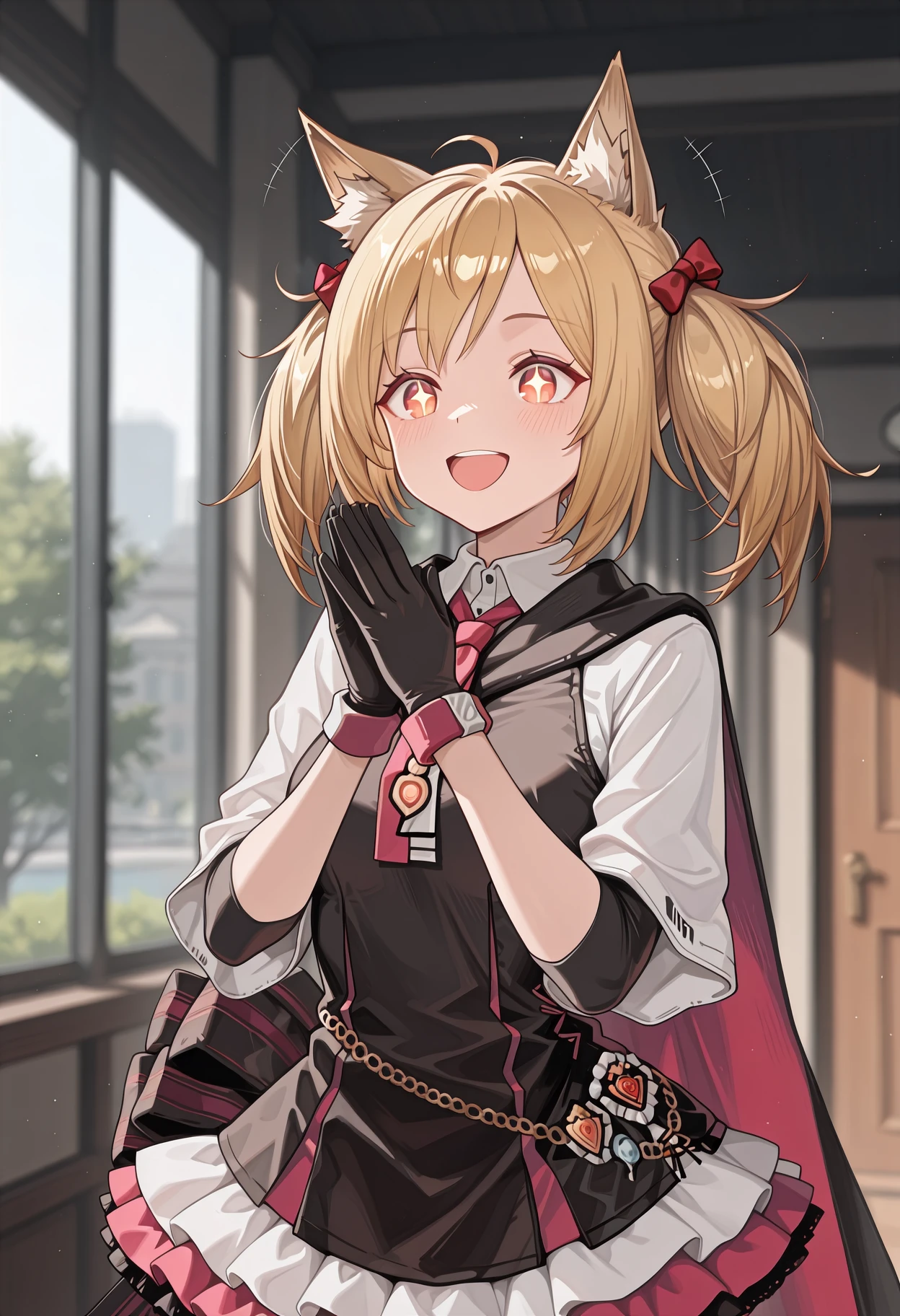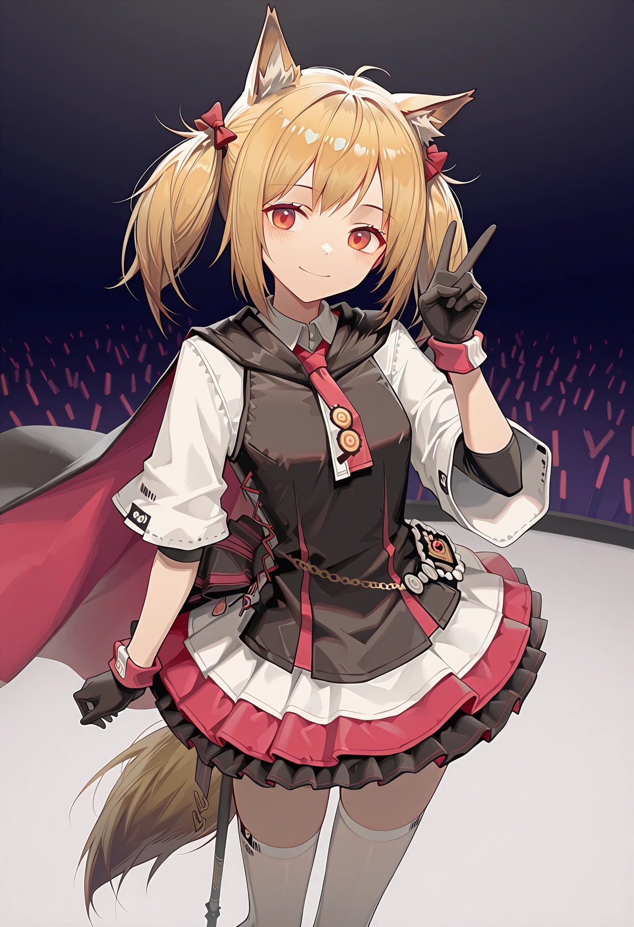 idol clothes for official outfit. Individual parts are not tagged, besides the cape, white thighhighs, boots. Gloves are baked when using the official outfit trigger, for now. tail or wolf tail are in the dataset and are reliable.