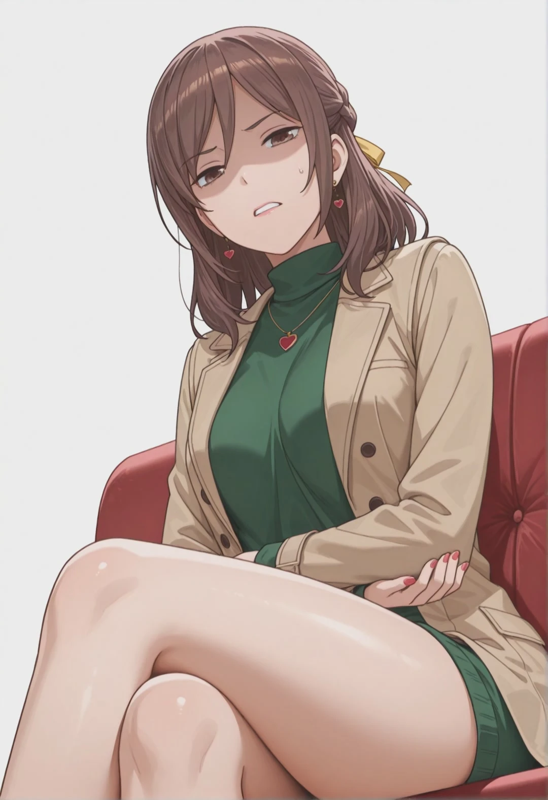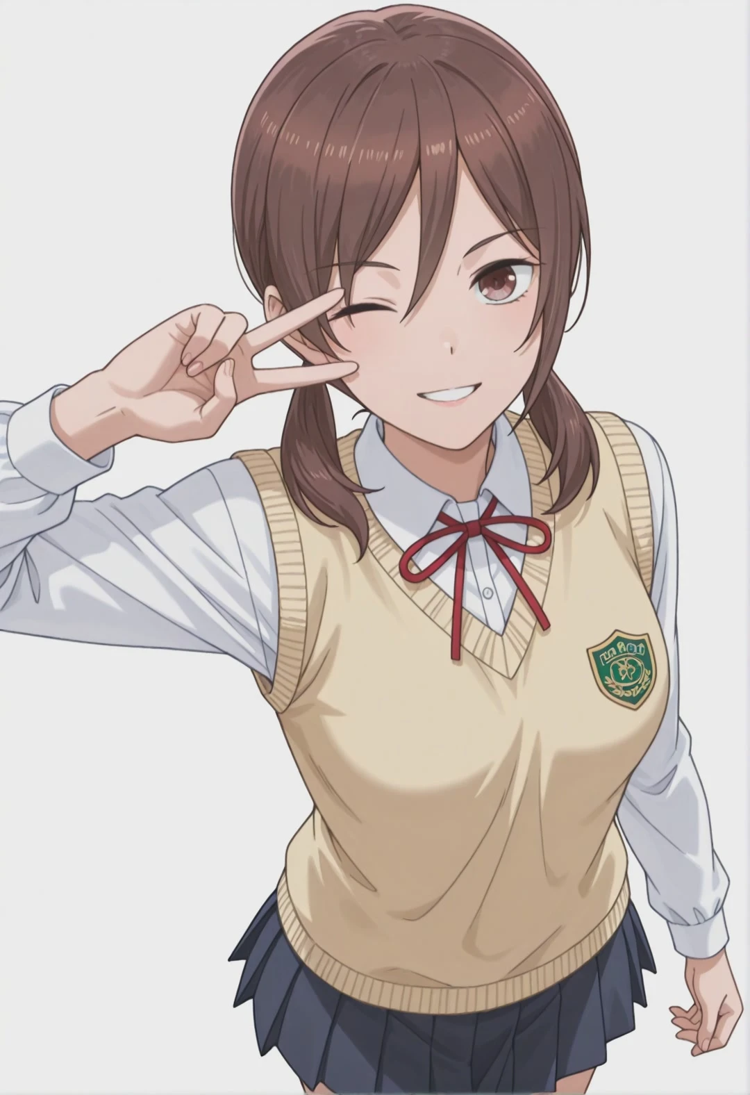 da7, medium breasts, mature female, tall female, brown hair, medium hair, brown eyes, low twintails, hair between eyes,