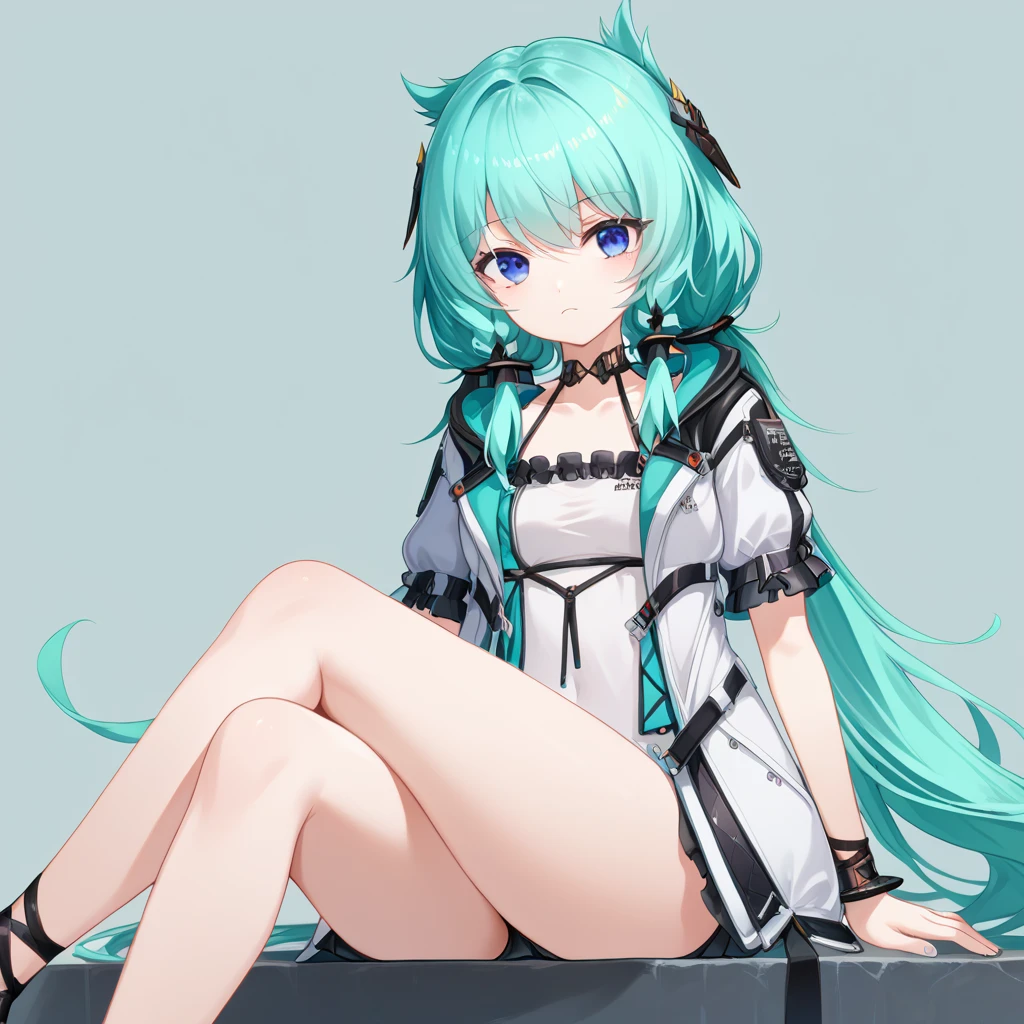osiris the innocence, aqua hair, blue eyes, low twintails, very long hair, hair ornament, open jacket________