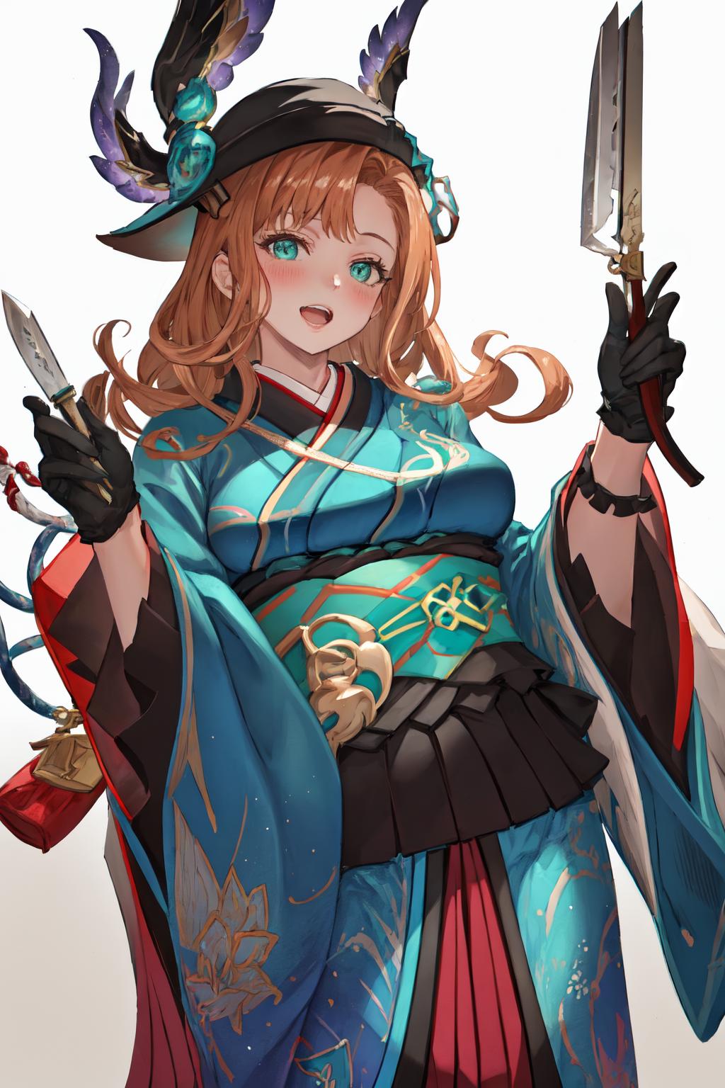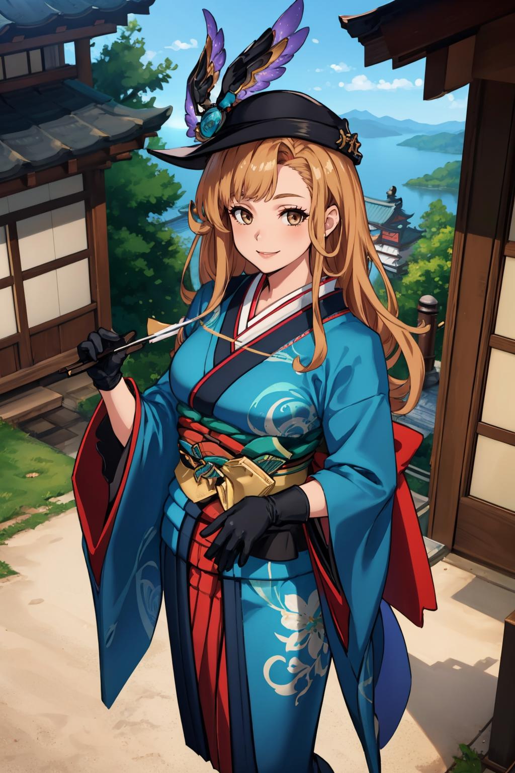 tweyenny, brown eyes, hat, black headwear, black gloves, japanese clothes, kimono, blue kimono, obi, sash, skirt, hakama skirt, wide sleeves