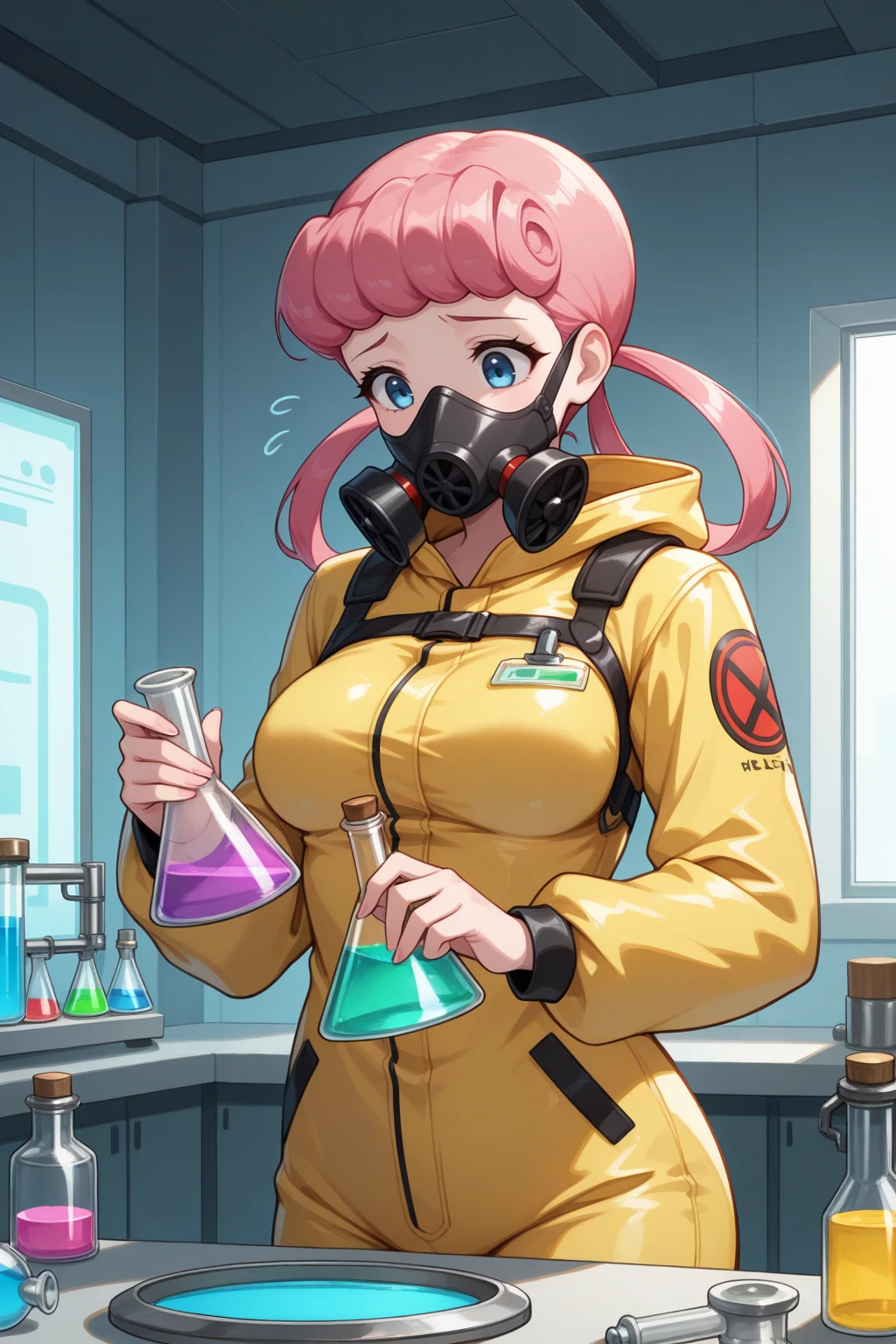 Appearance : j0y, medium breasts, blue eyes, pink hair, hair rings, long hair