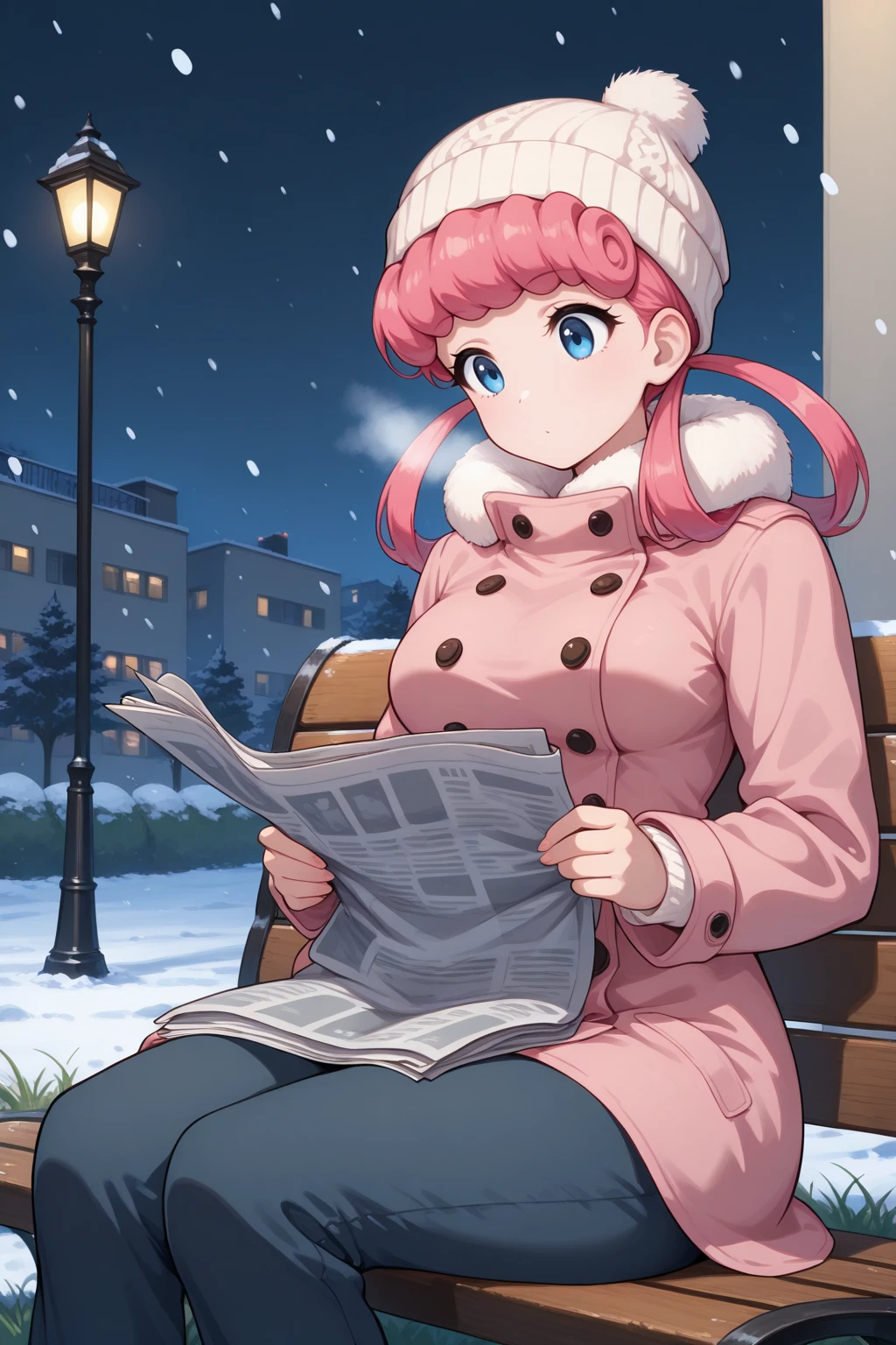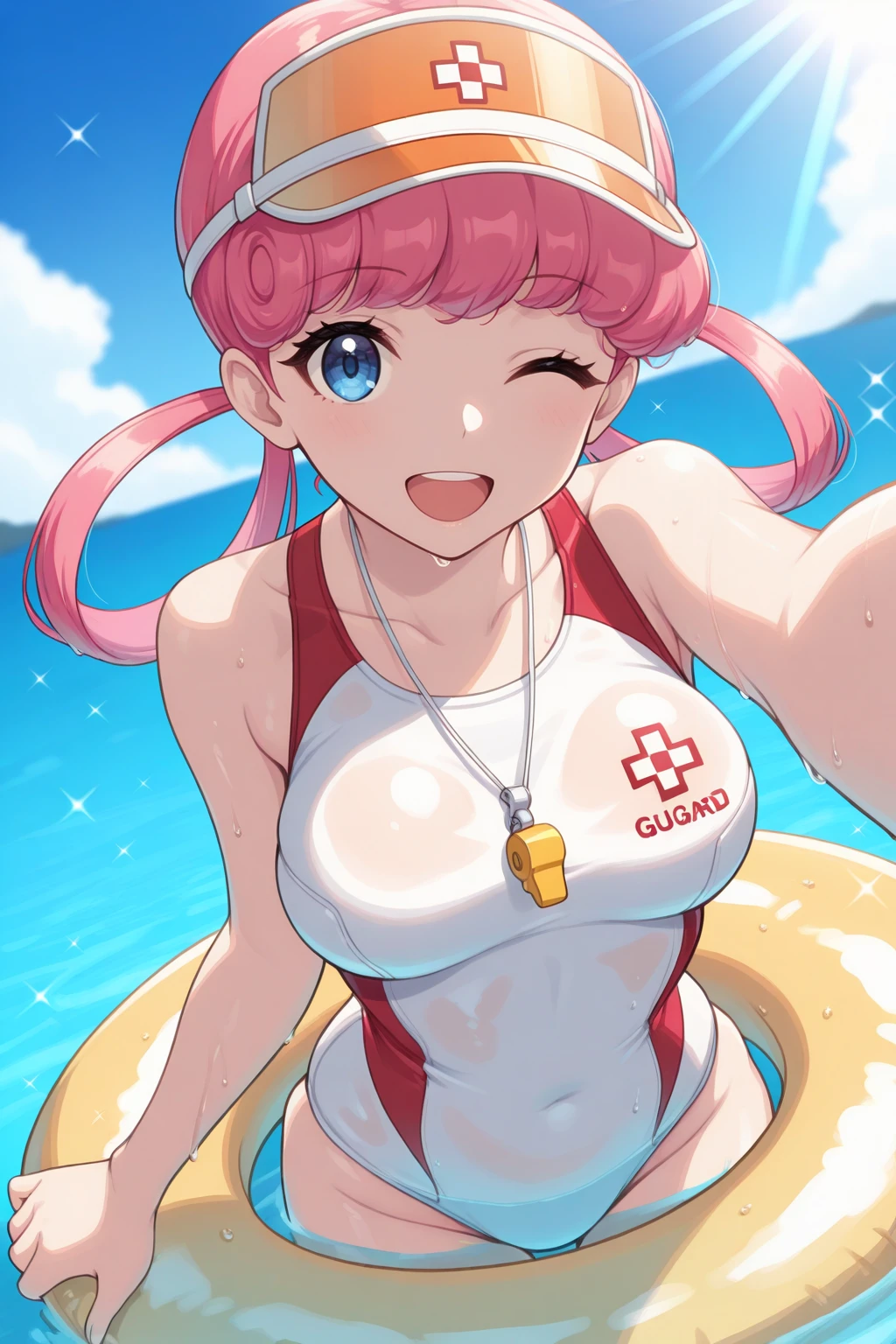 j0y, medium breasts, blue eyes, pink hair, hair rings, long hair