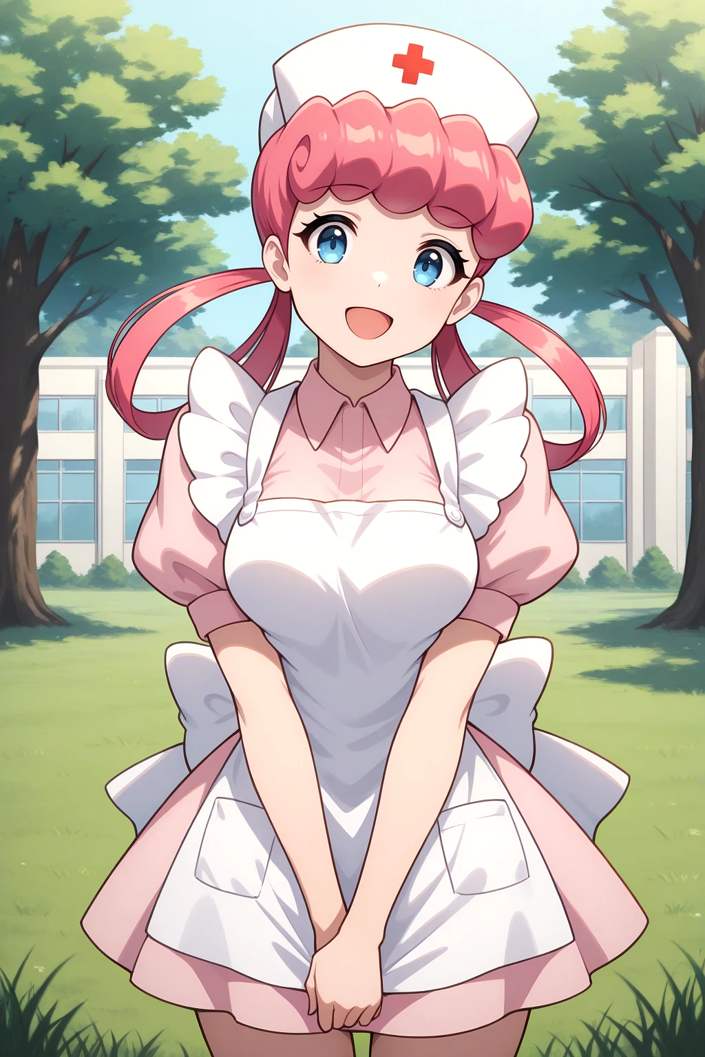 Default outfit : white hat, white apron, collared dress, short dress, pink dress, puffy short sleeves, white footwear