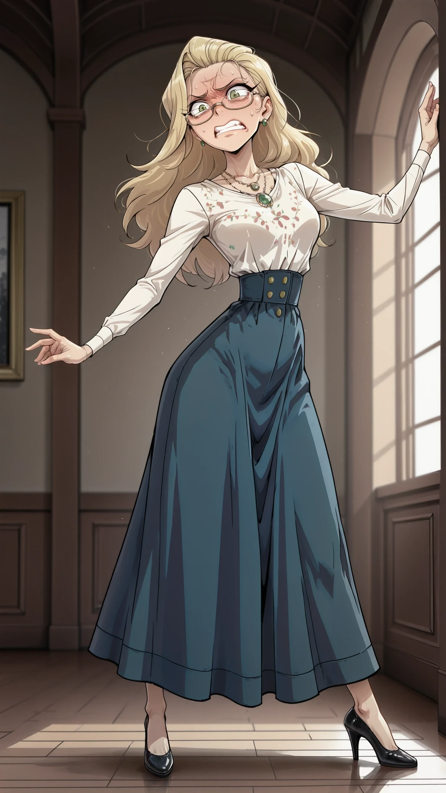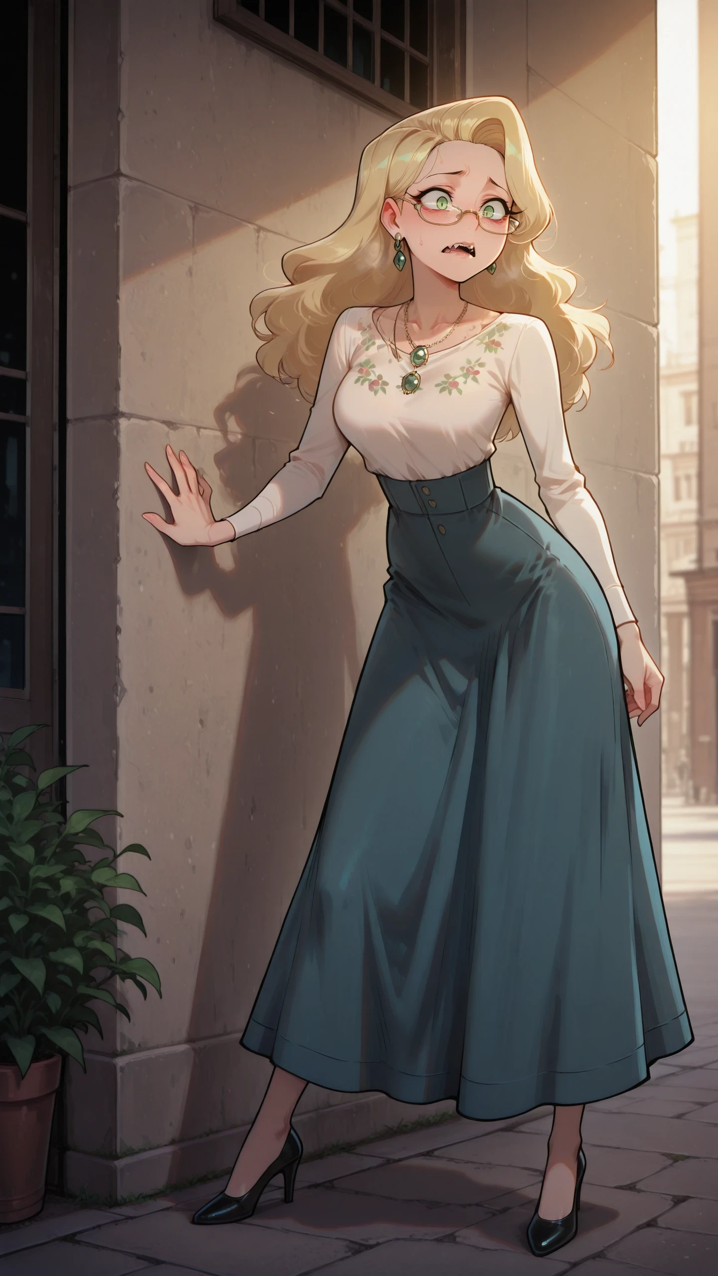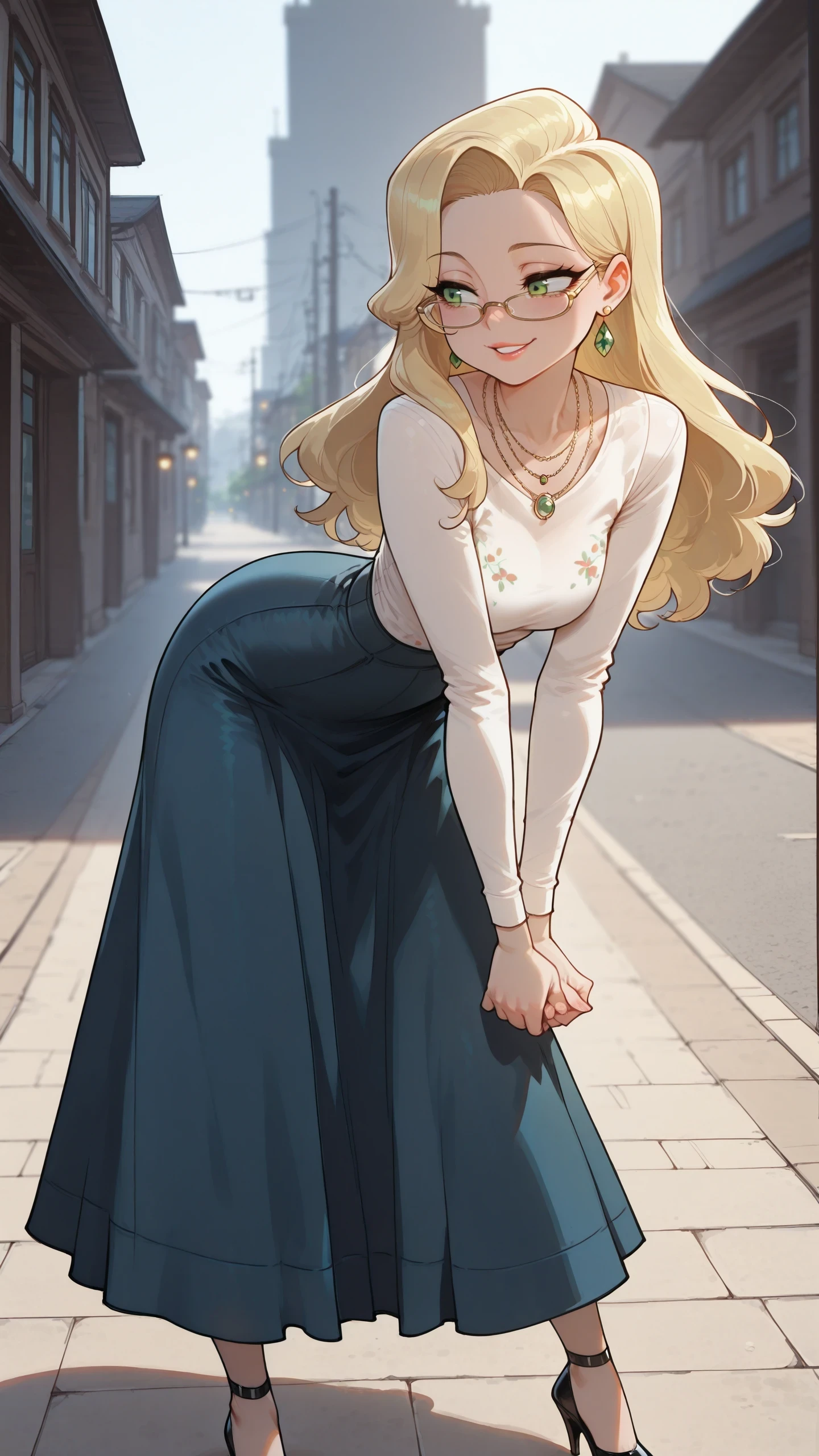 Human Form: M4yb3rryHum4n, 1girl, green eyes, blonde hair, long hair, jewelry, earrings, glasses, necklace, shirt, long sleeves, long skirt, blue skirt, black footwear, high heels