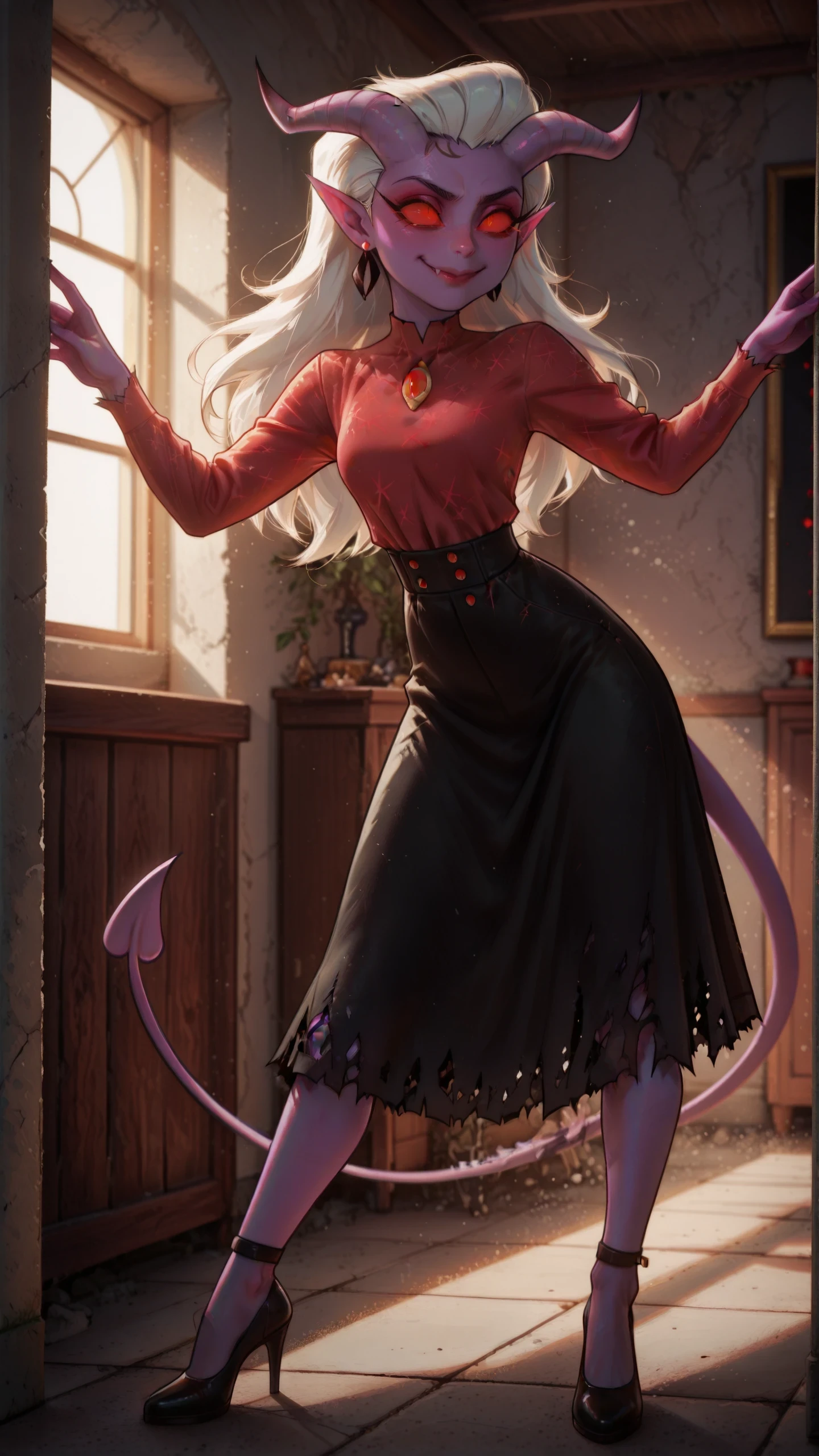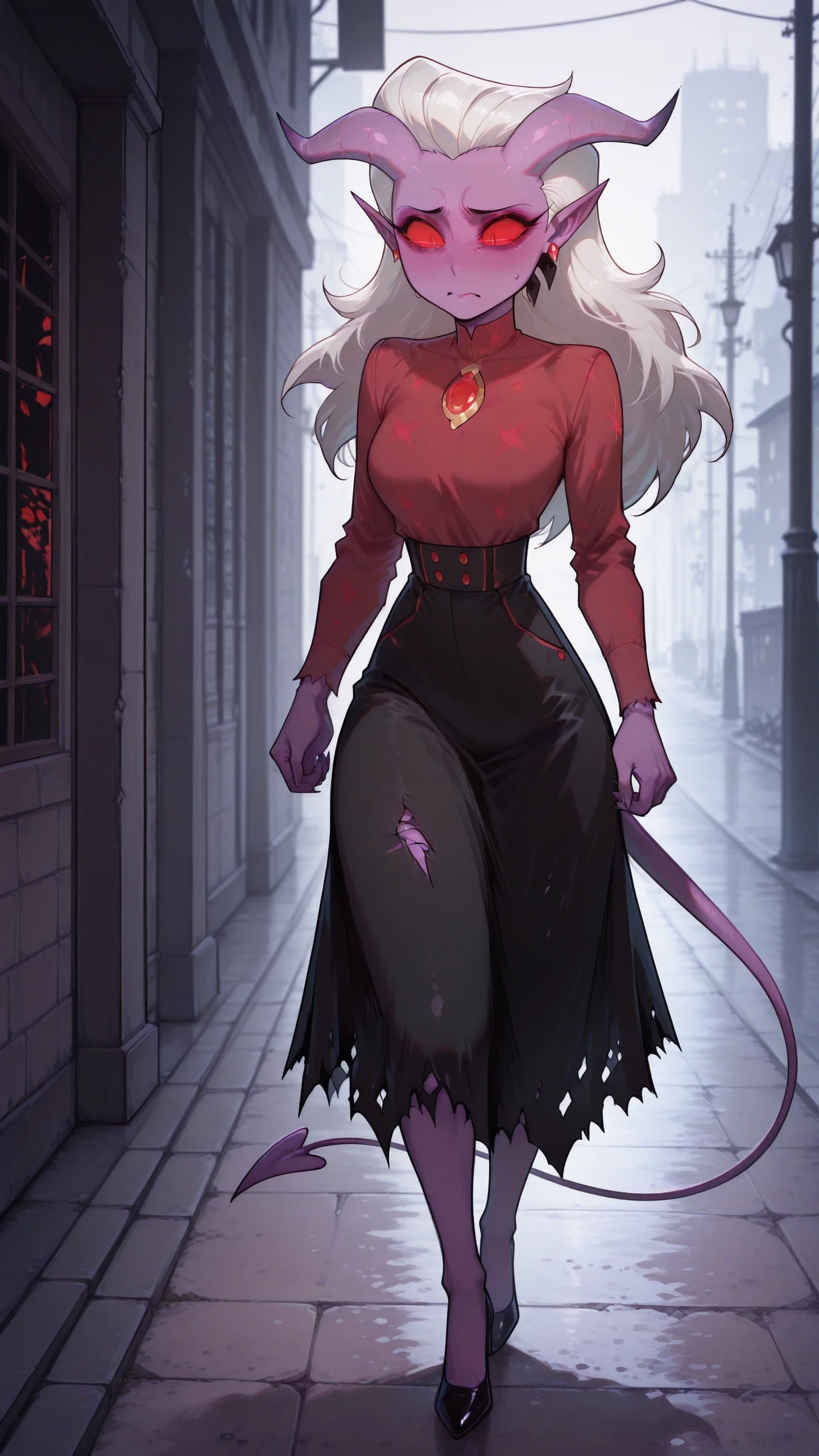 Demon Form: M4yb3rryD3m0n, 1girl, demon girl, colored skin, purple skin, white hair long hair, pointy ears, red eyes, colored sclera, horns, demon tail, jewelry, earrings, brooch, red shirt, long sleeves, black skirt, torn clothes, black heels