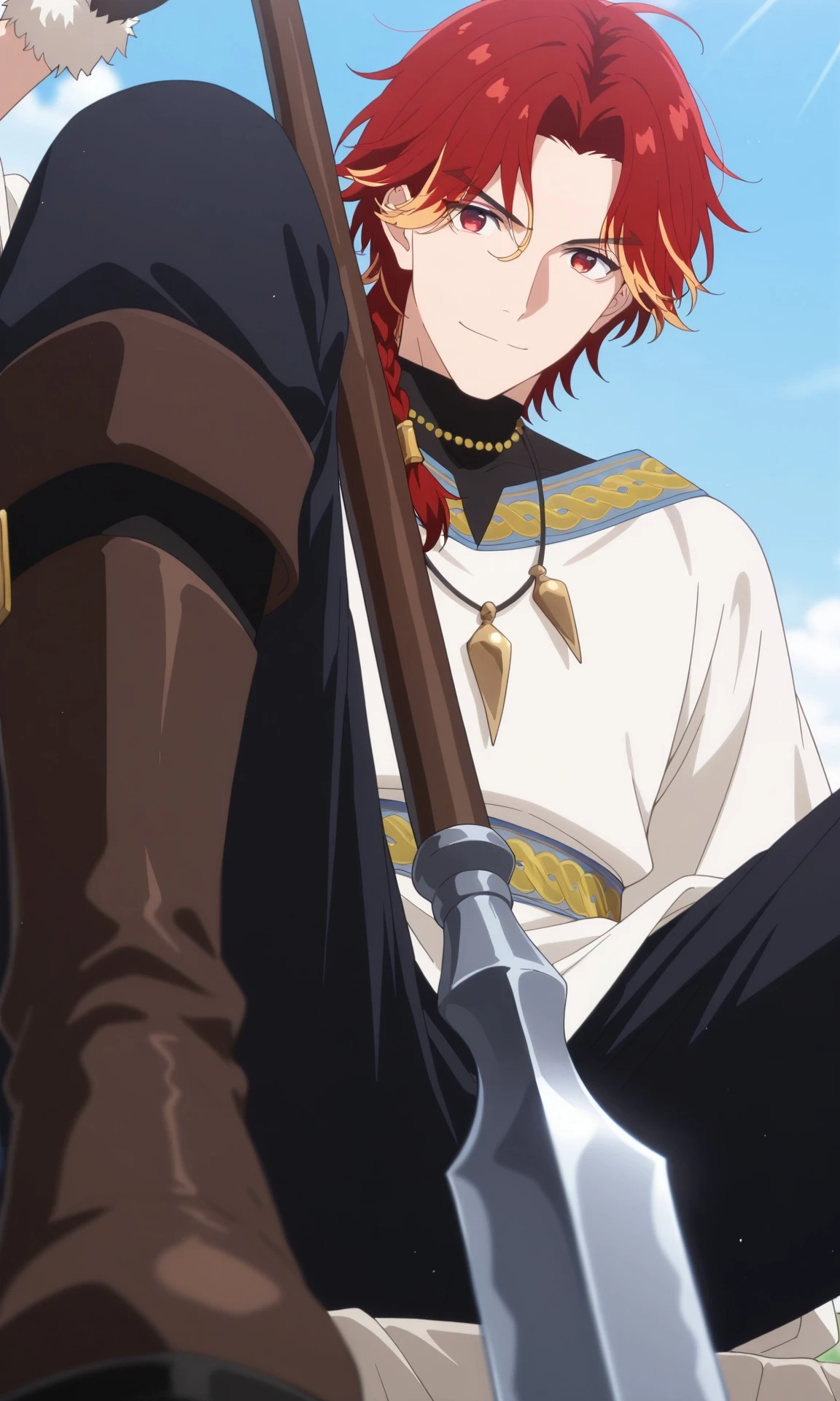 Trigger words: PrinceAlflamme,red eyes,red-haired with golden highlights,multicolored hair,parted hair,single braid,